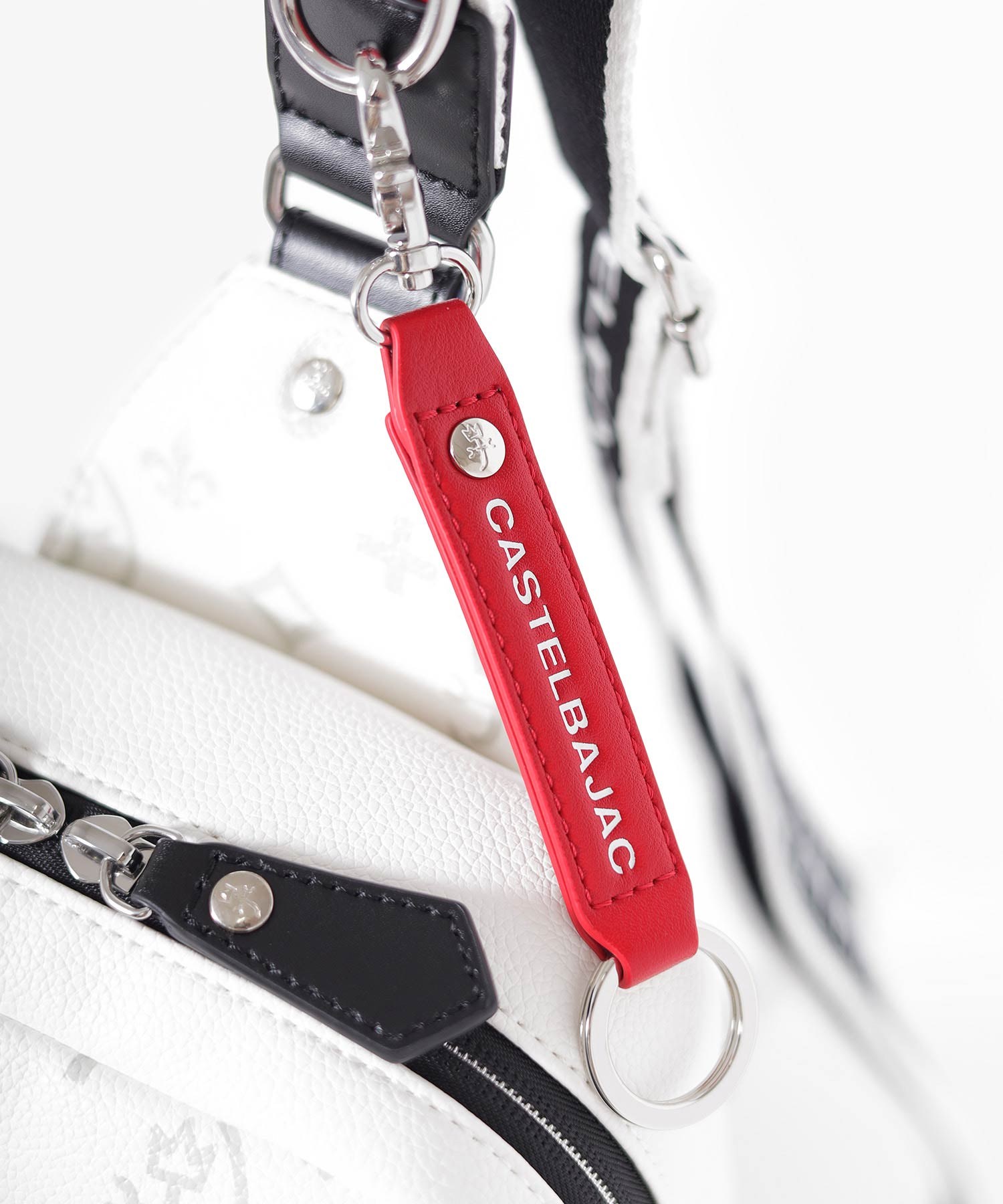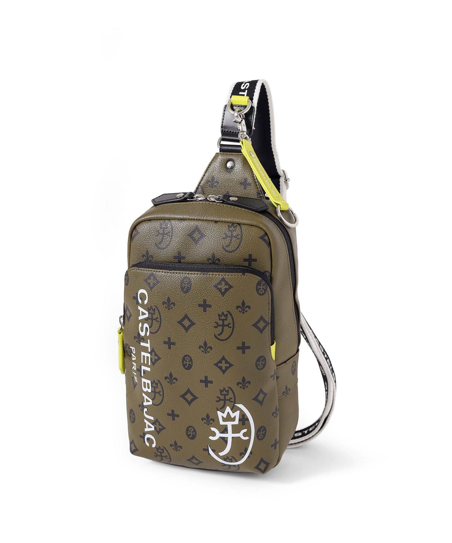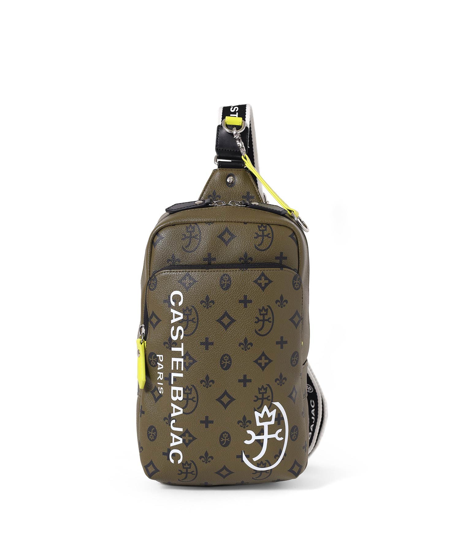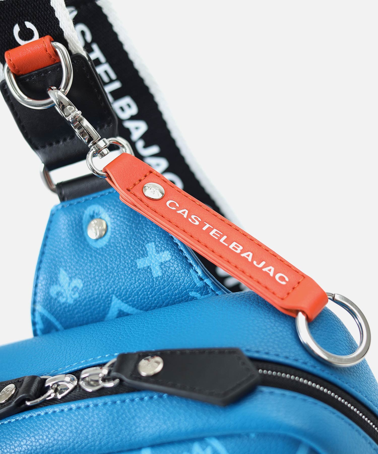 バッグの本体色と差し色にもなるアクセントカラーのコンビネーションが魅力のカステルバジャックのワンショルダーバッグ。本体素材はシボ感のある合成皮革を使用し、カバンの前面や背面にカステルバジャックのオリジナルモノグラム柄をプリントしました。付属のキーホルダーがアクセントとなっています。