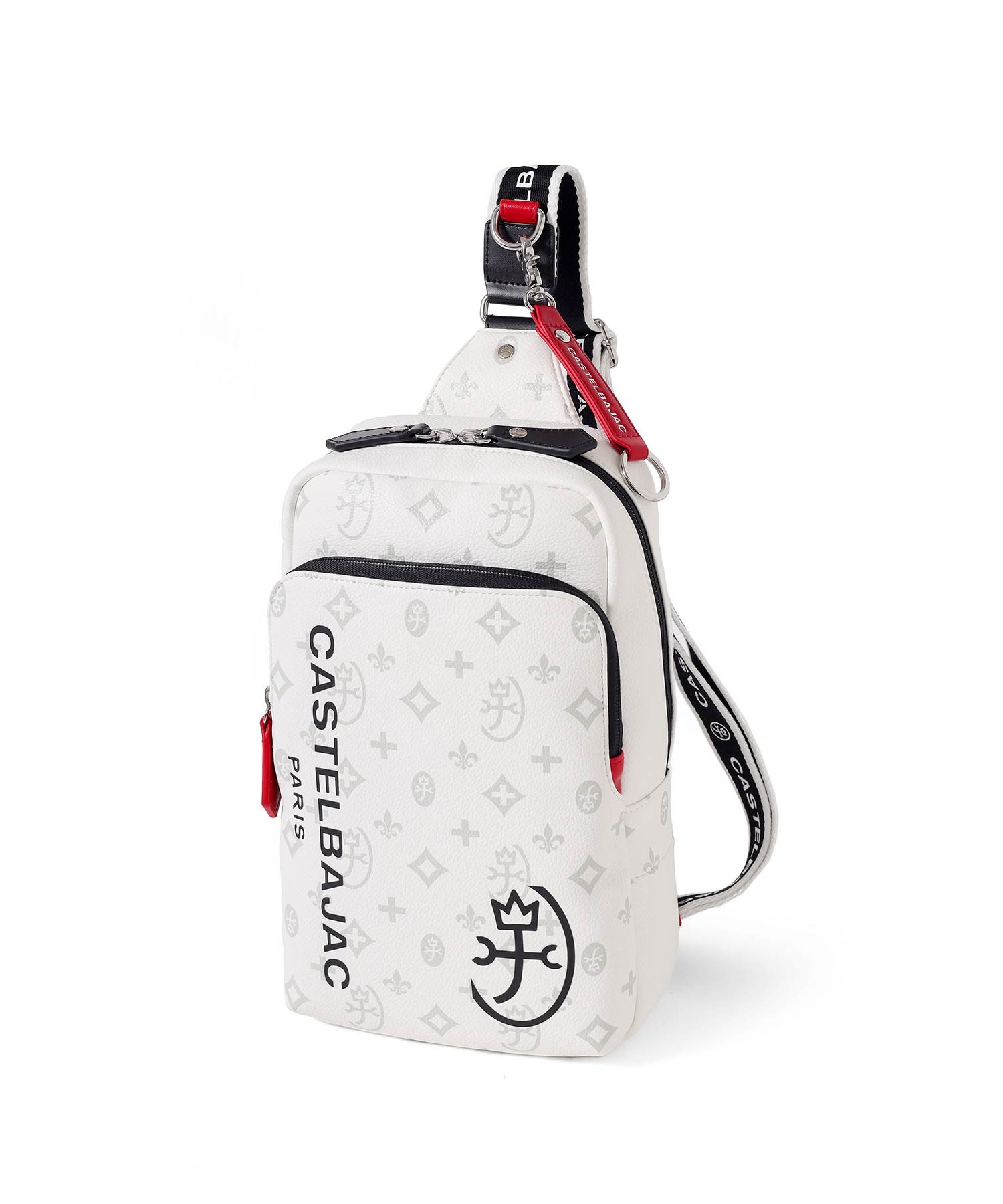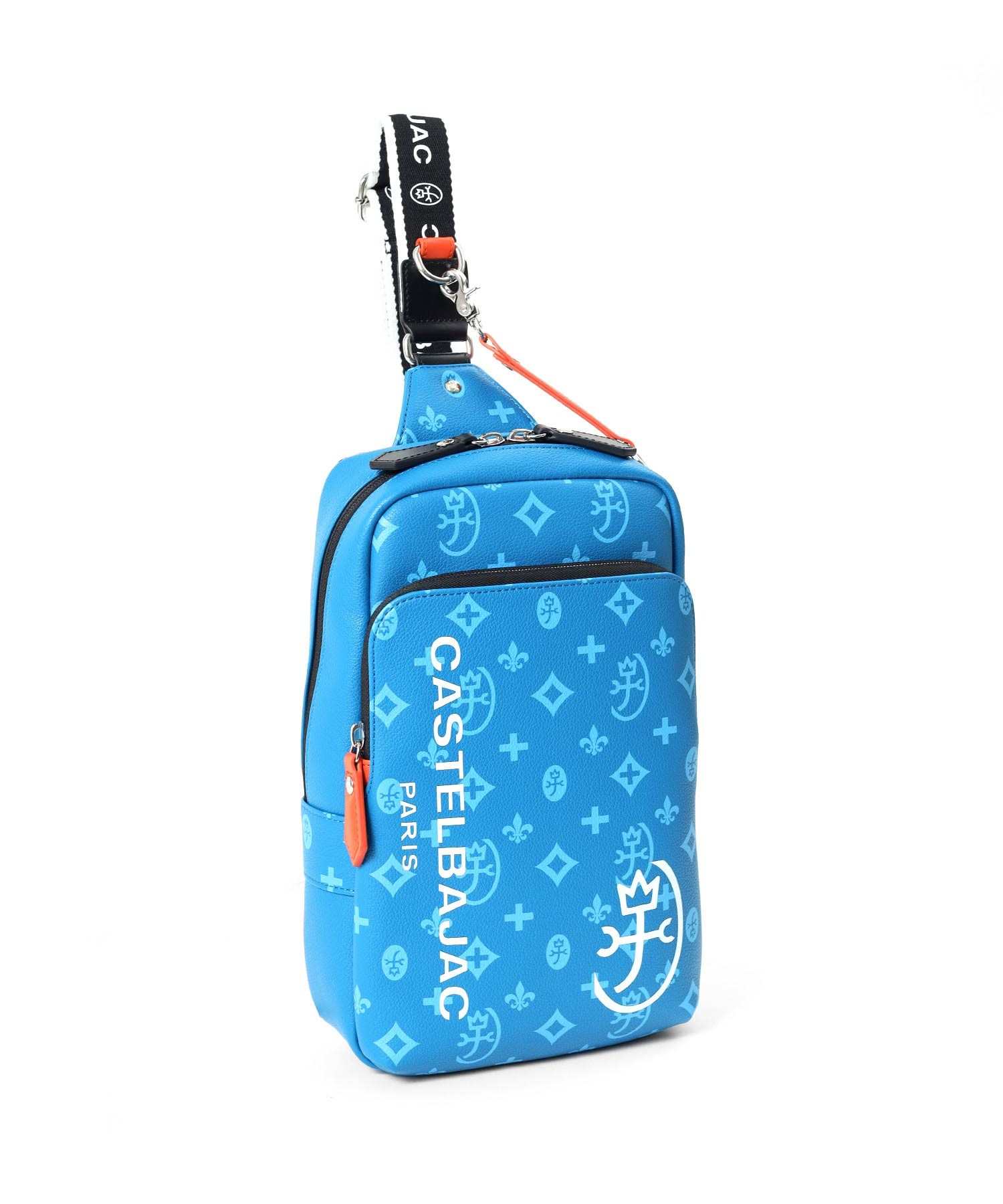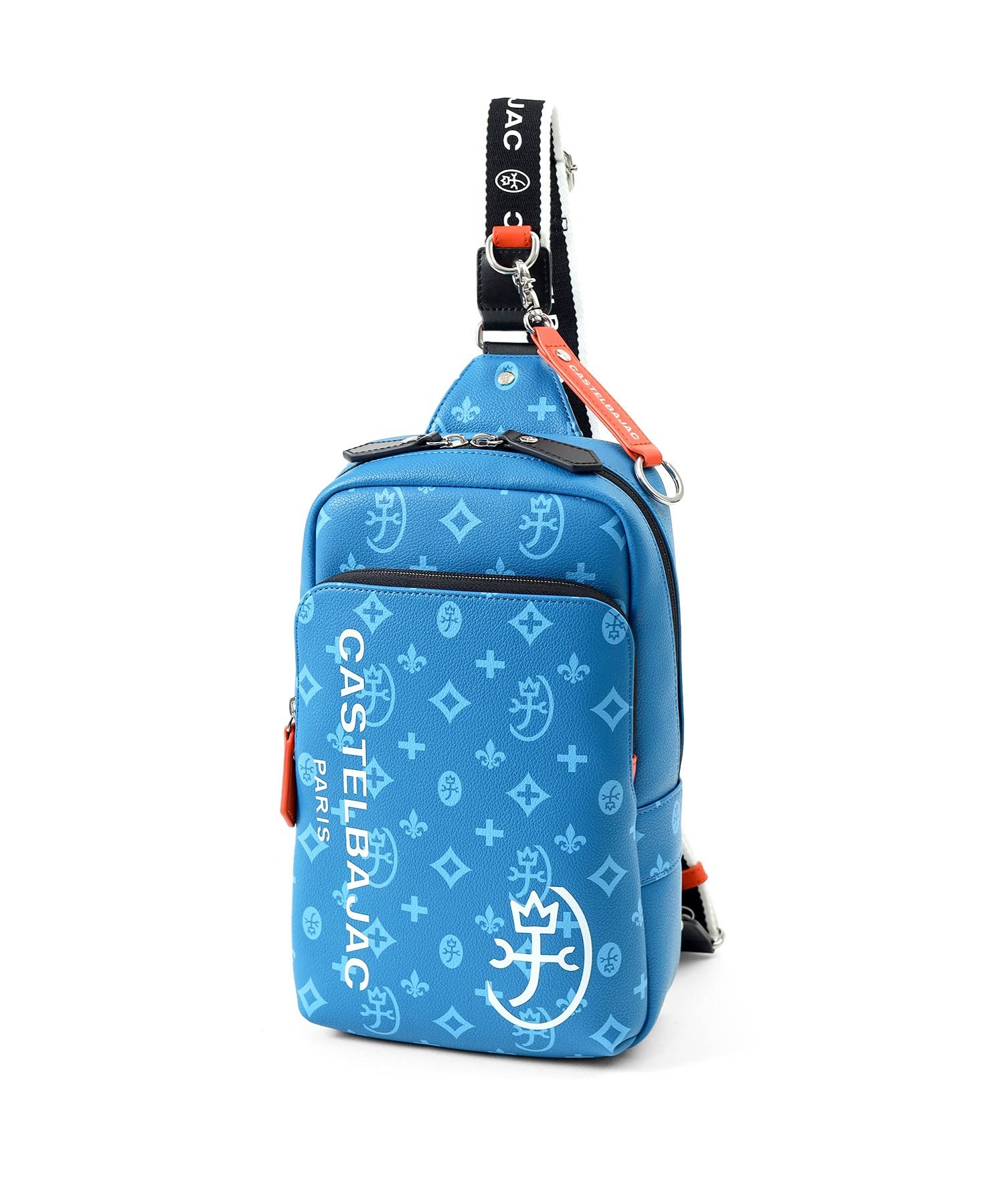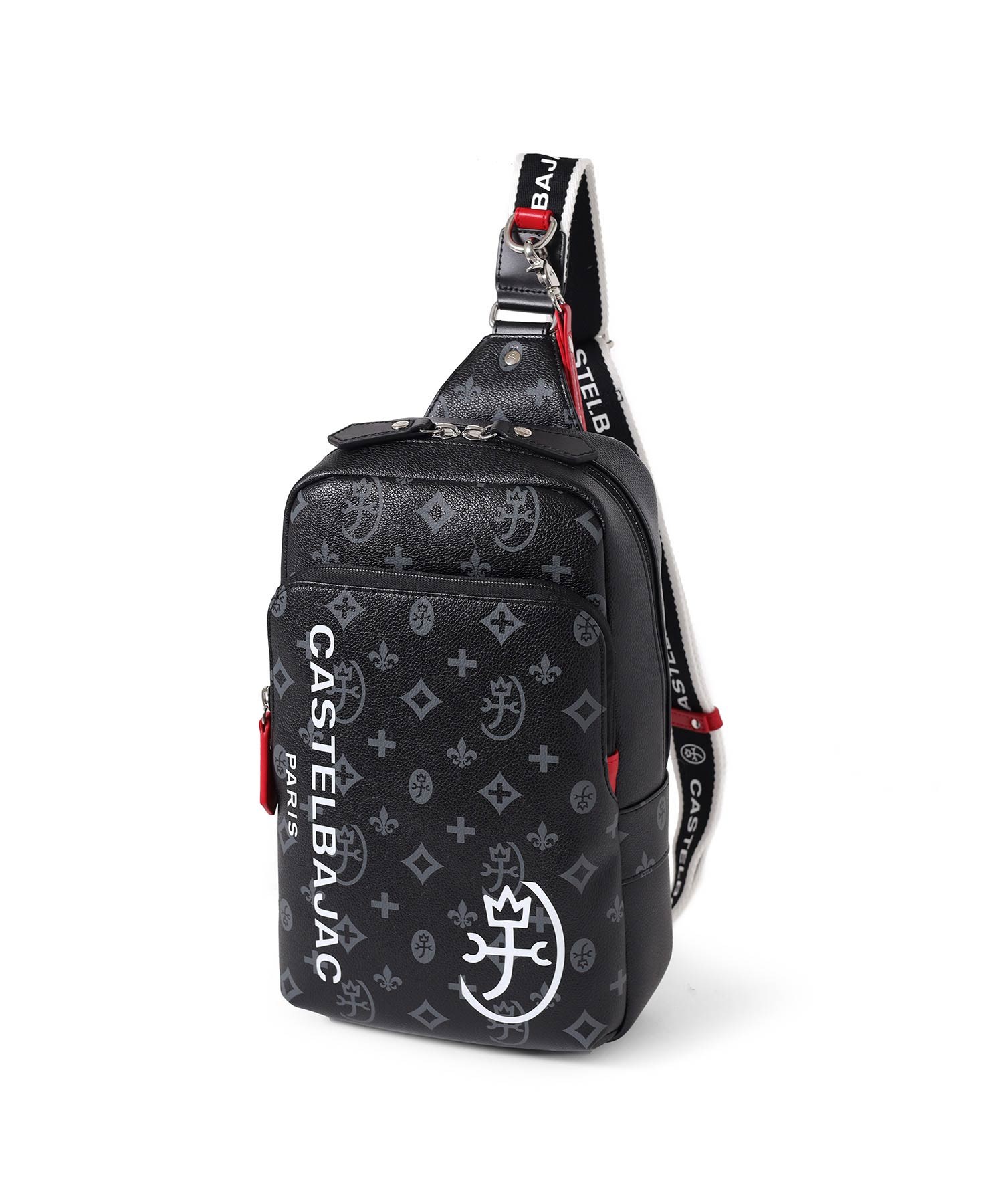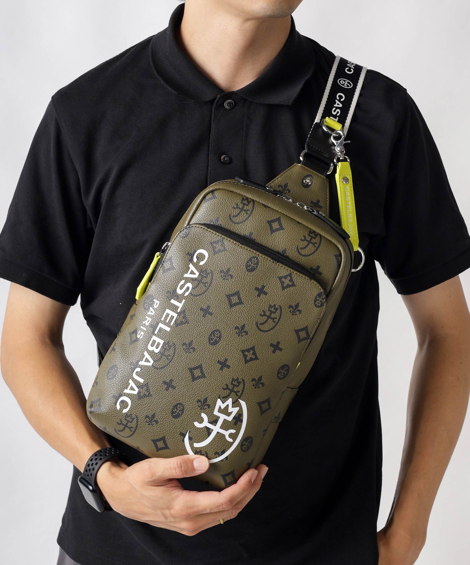 バッグの本体色と差し色にもなるアクセントカラーのコンビネーションが魅力のカステルバジャックのワンショルダーバッグ。本体素材はシボ感のある合成皮革を使用し、カバンの前面や背面にカステルバジャックのオリジナルモノグラム柄をプリントしました。付属のキーホルダーがアクセントとなっています。