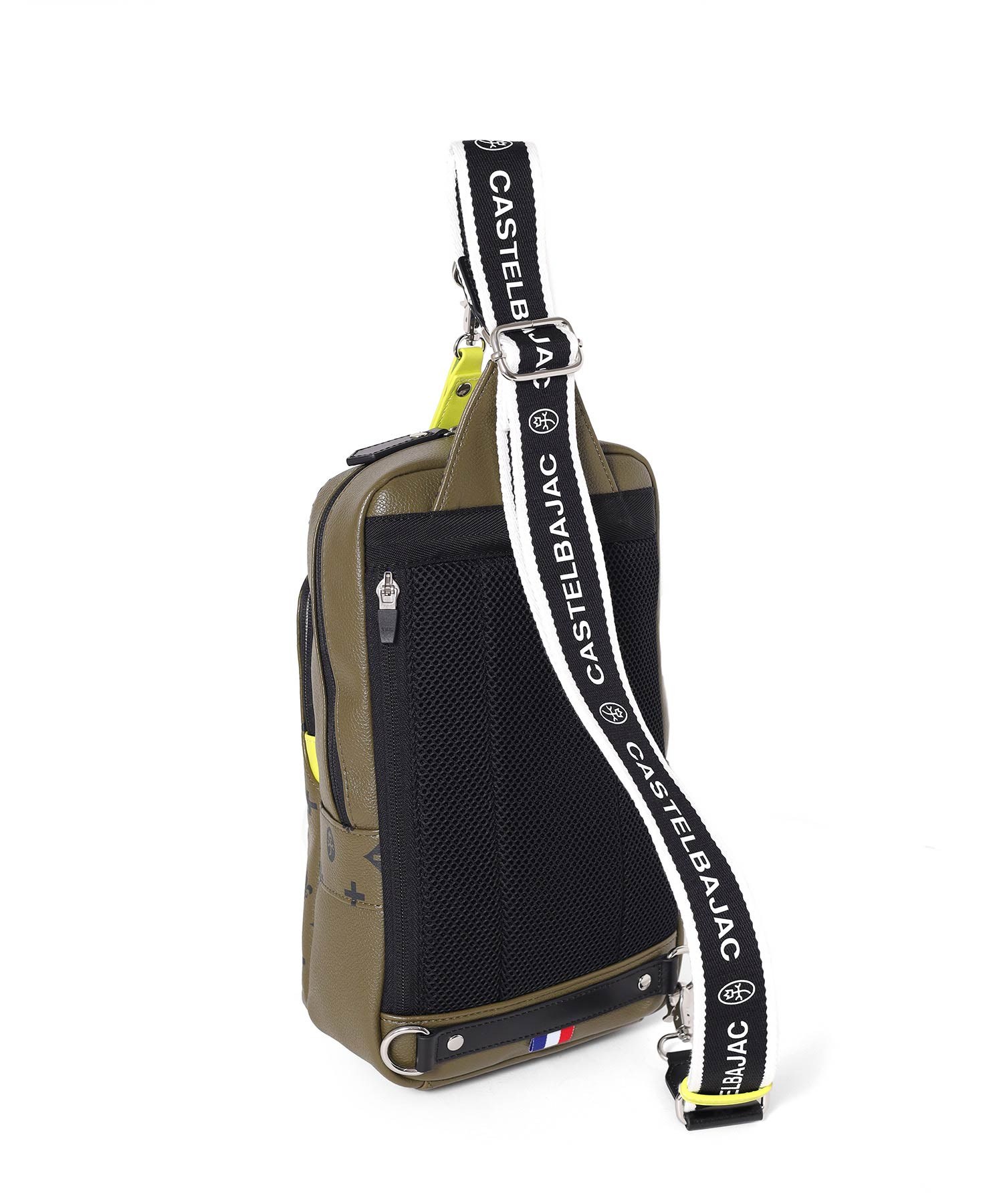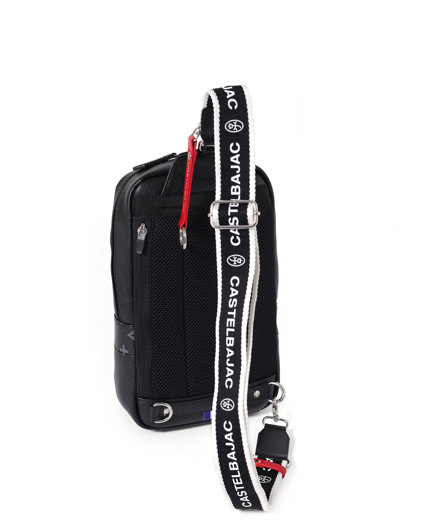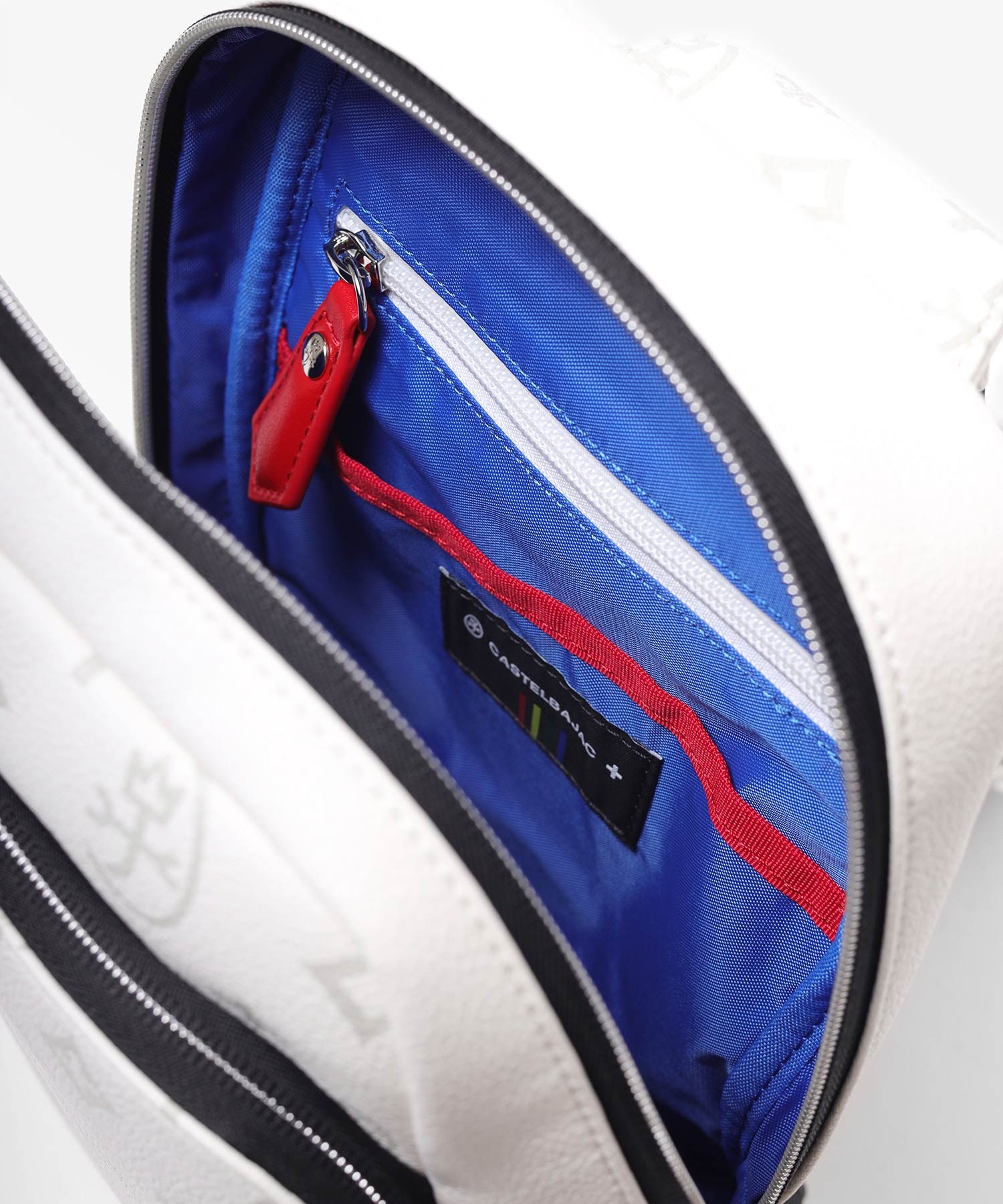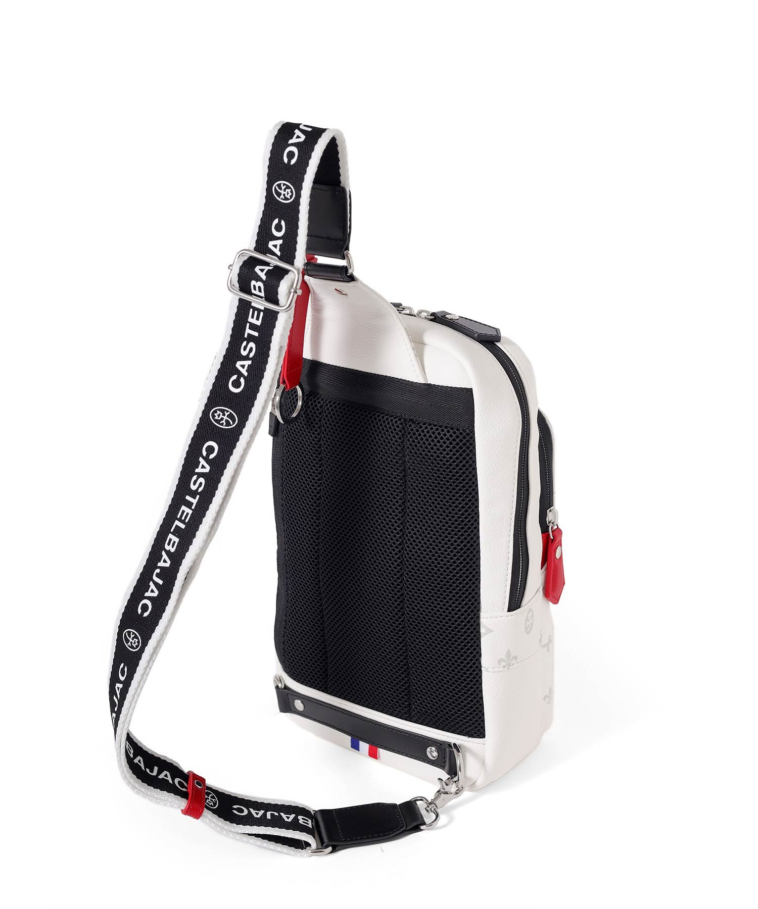 バッグの本体色と差し色にもなるアクセントカラーのコンビネーションが魅力のカステルバジャックのワンショルダーバッグ。本体素材はシボ感のある合成皮革を使用し、カバンの前面や背面にカステルバジャックのオリジナルモノグラム柄をプリントしました。付属のキーホルダーがアクセントとなっています。