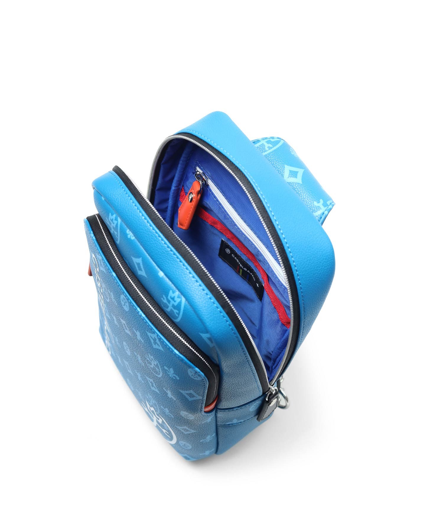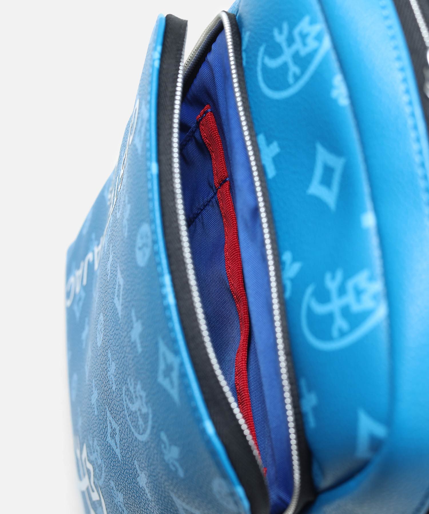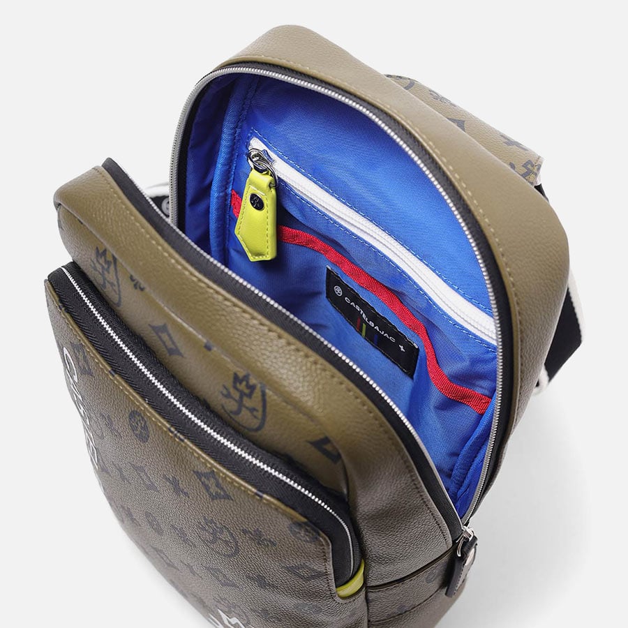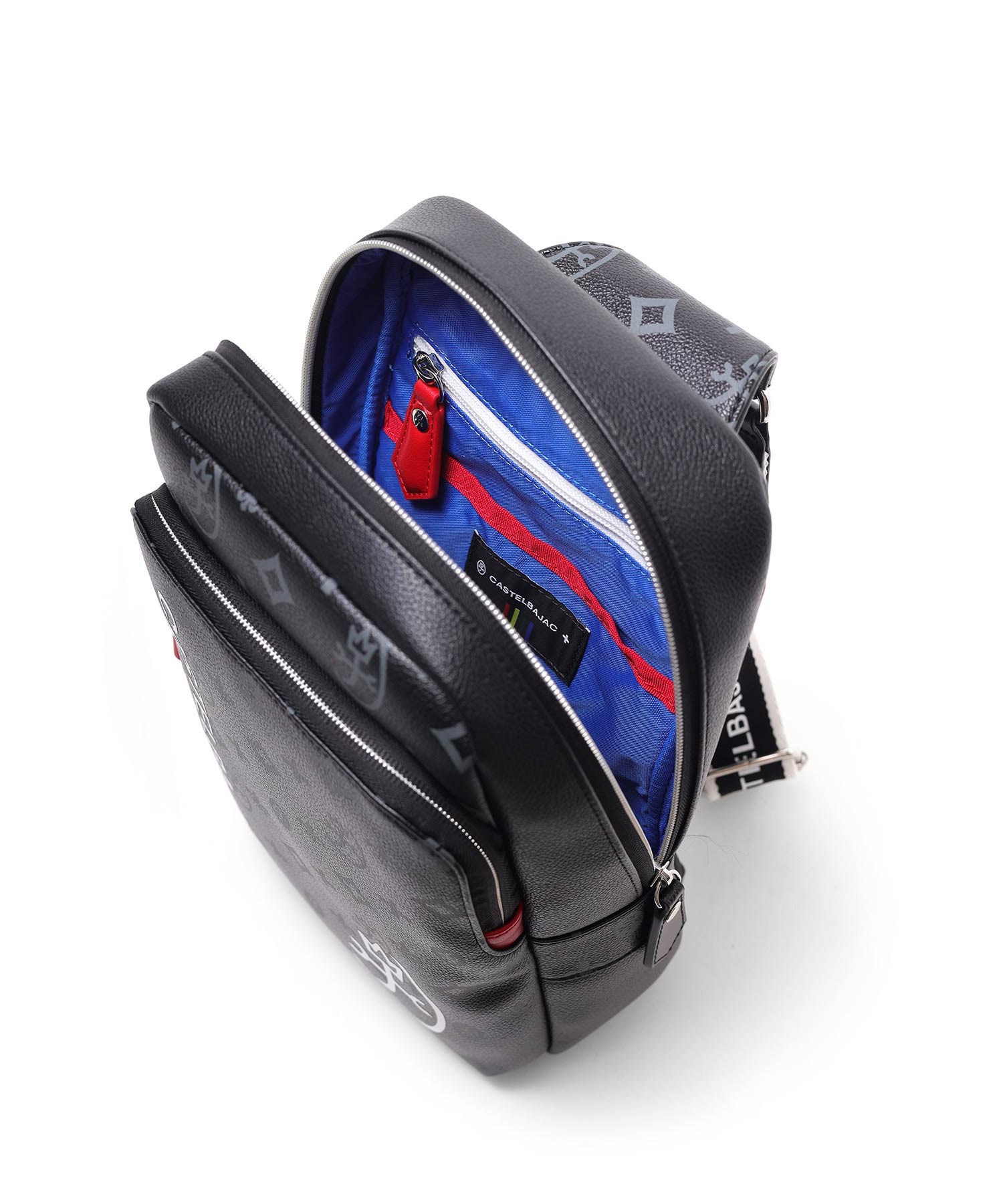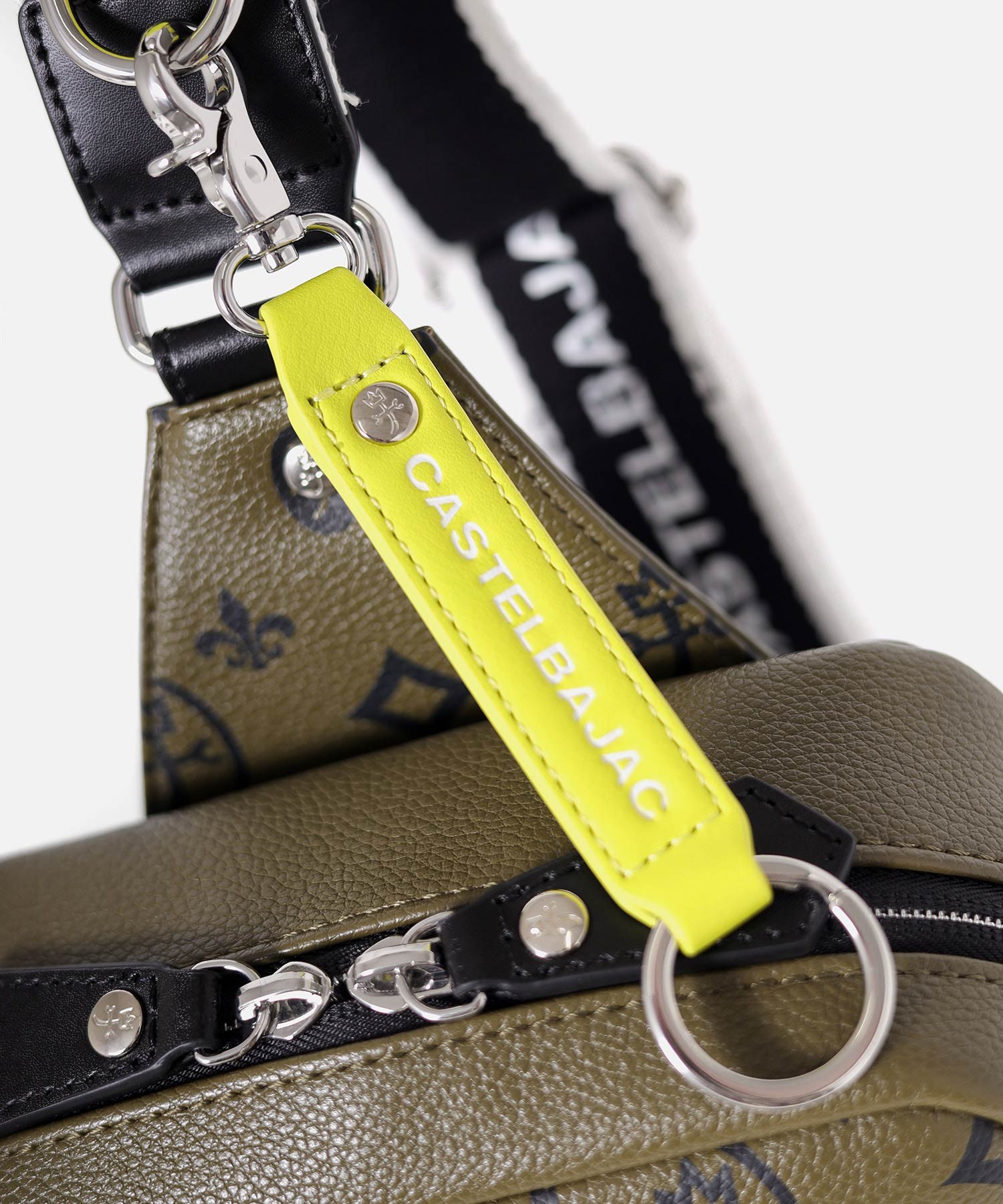 バッグの本体色と差し色にもなるアクセントカラーのコンビネーションが魅力のカステルバジャックのワンショルダーバッグ。本体素材はシボ感のある合成皮革を使用し、カバンの前面や背面にカステルバジャックのオリジナルモノグラム柄をプリントしました。付属のキーホルダーがアクセントとなっています。