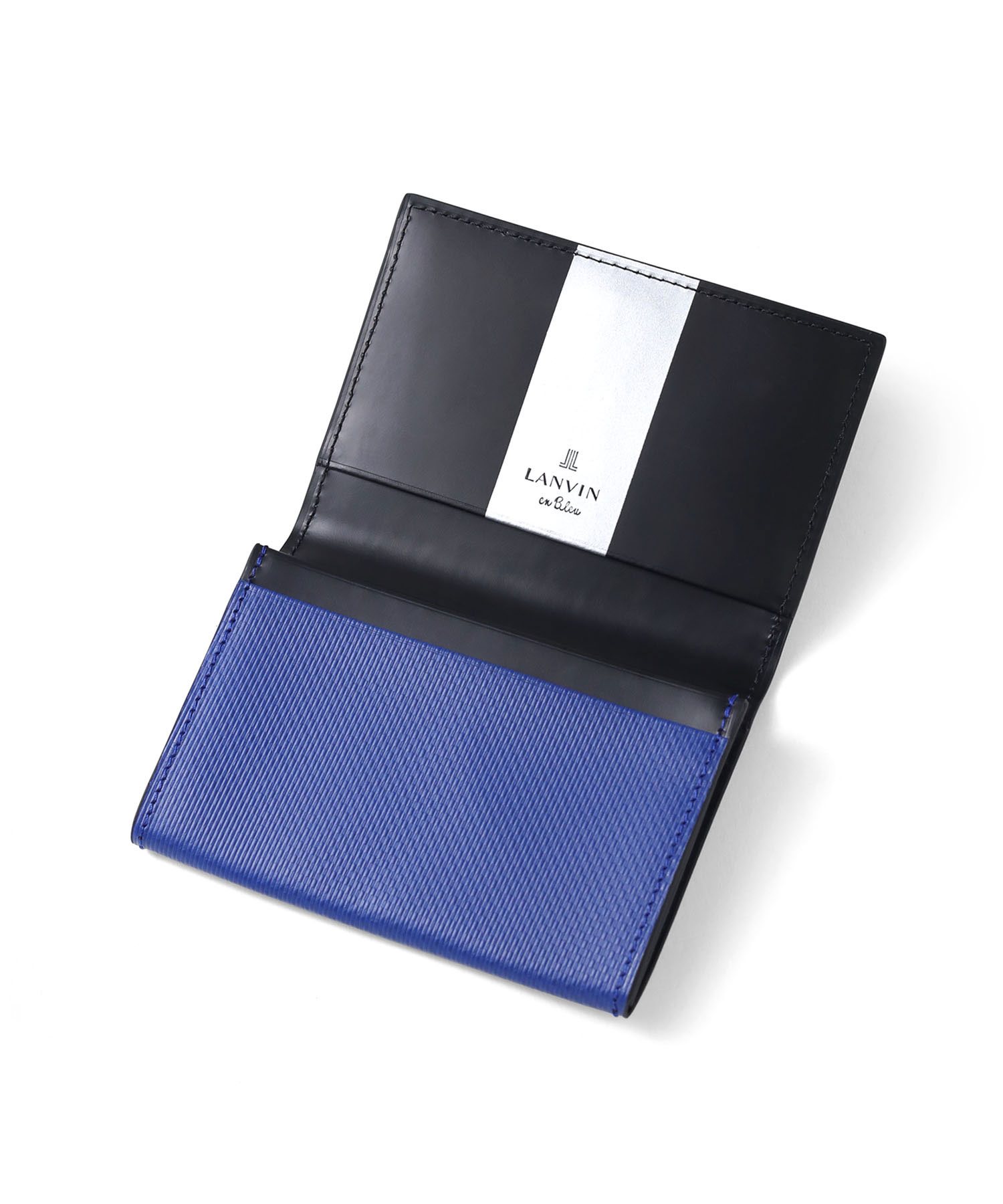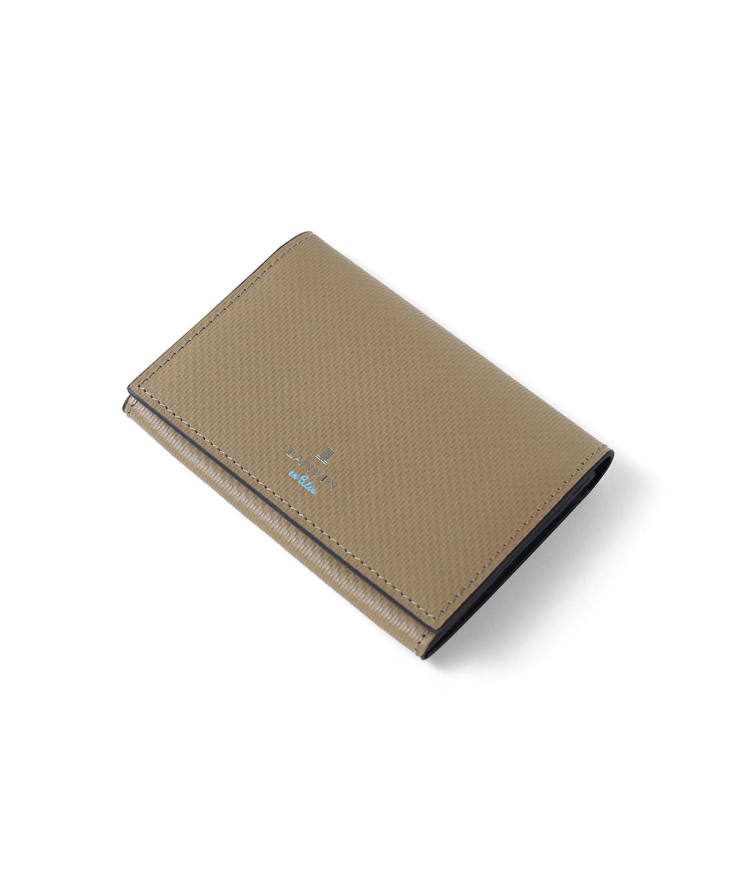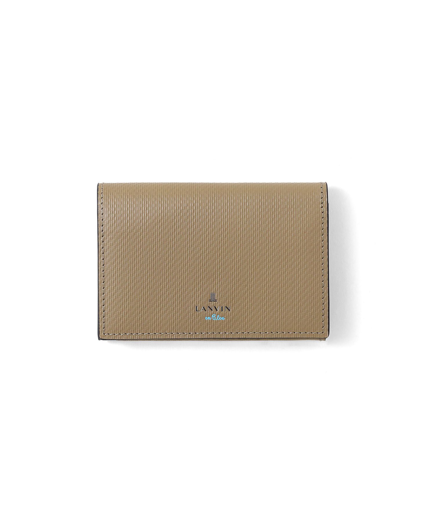 上品で落ち着いた雰囲気が魅力の、シンプルベーシックなランバンオンブルーの名刺入れ。本体には型押し加工を施したベーシックな牛革を使用。メタリックのロゴはシンプルながら存在感があり、上質な印象を引き立てます。