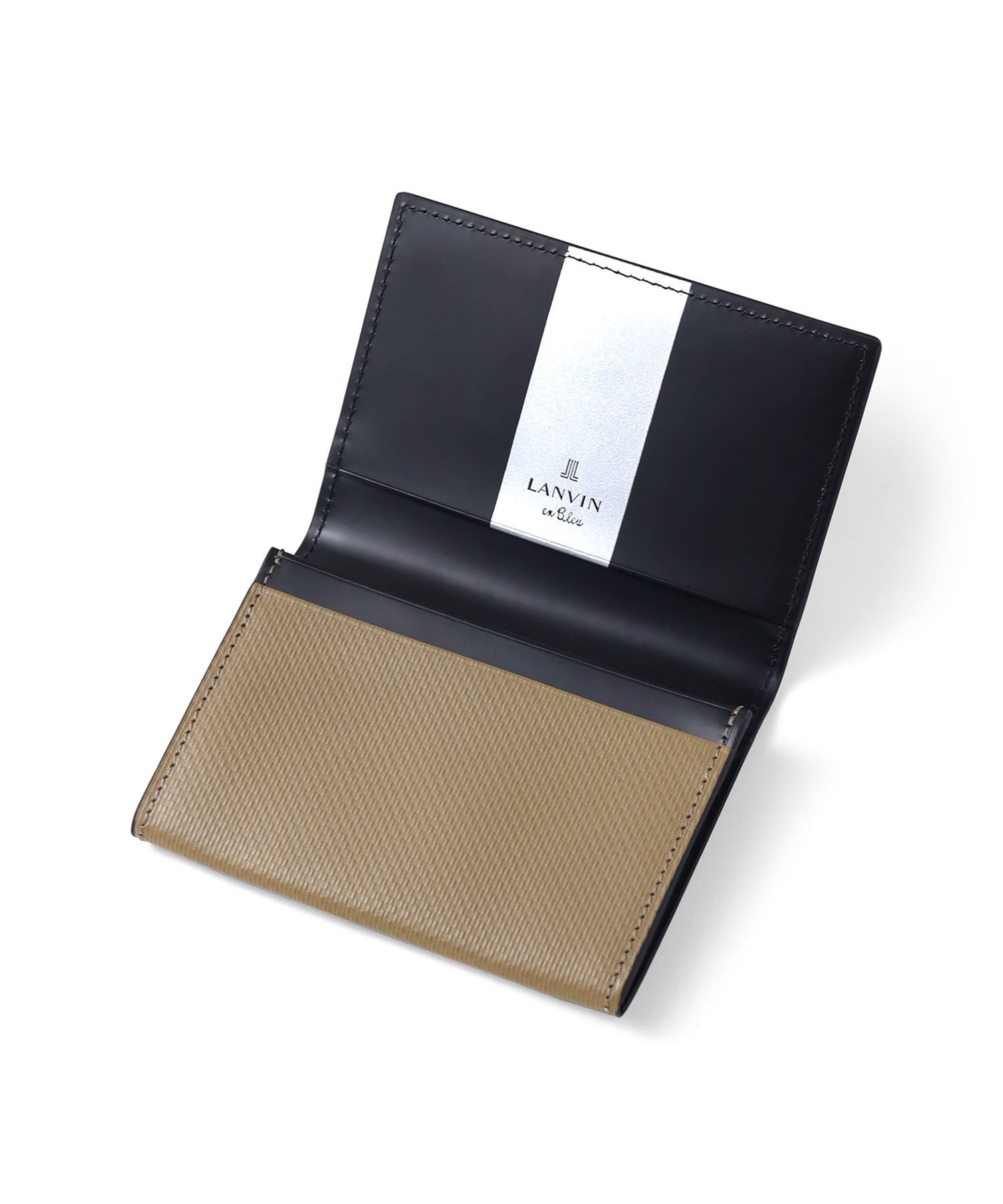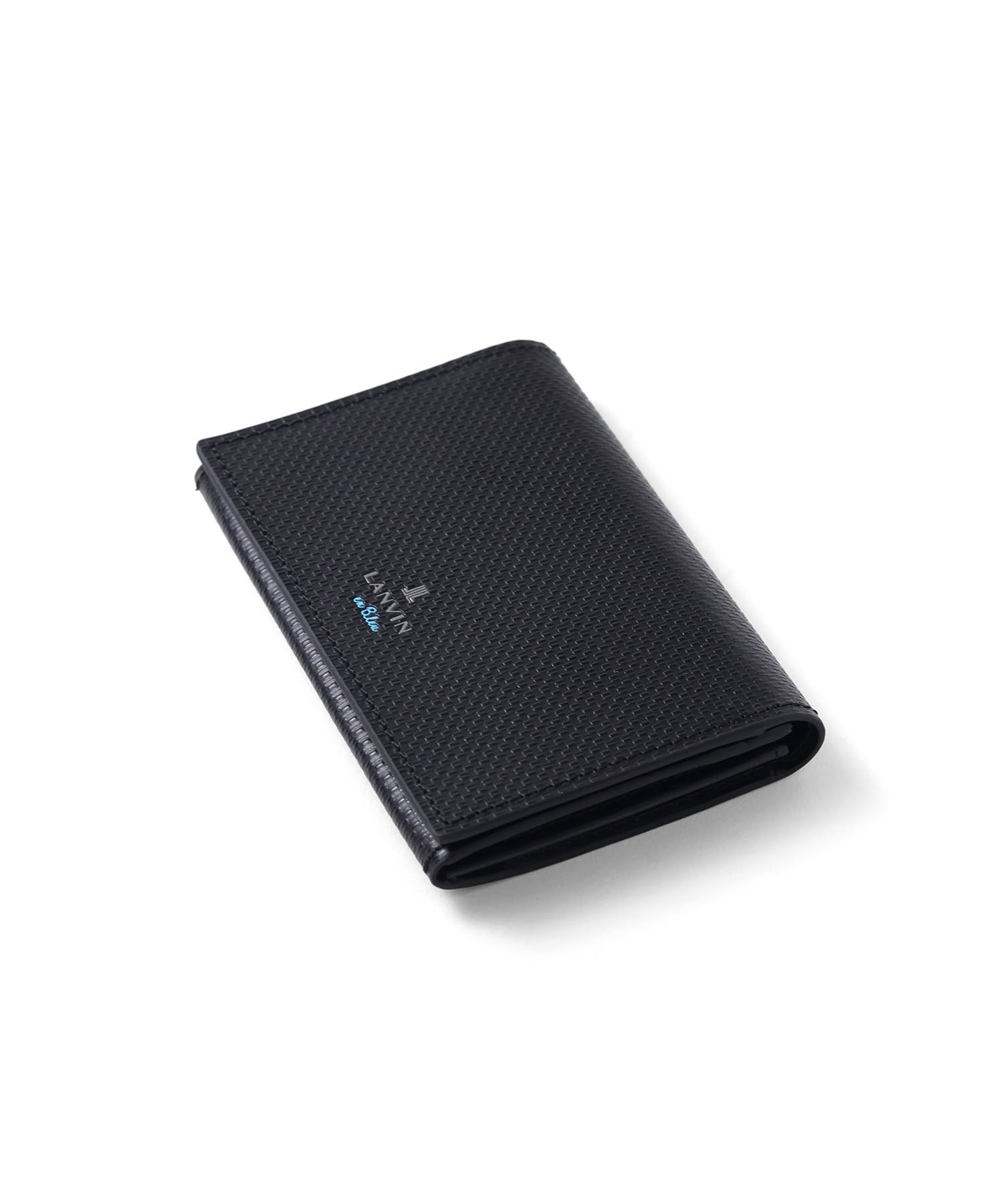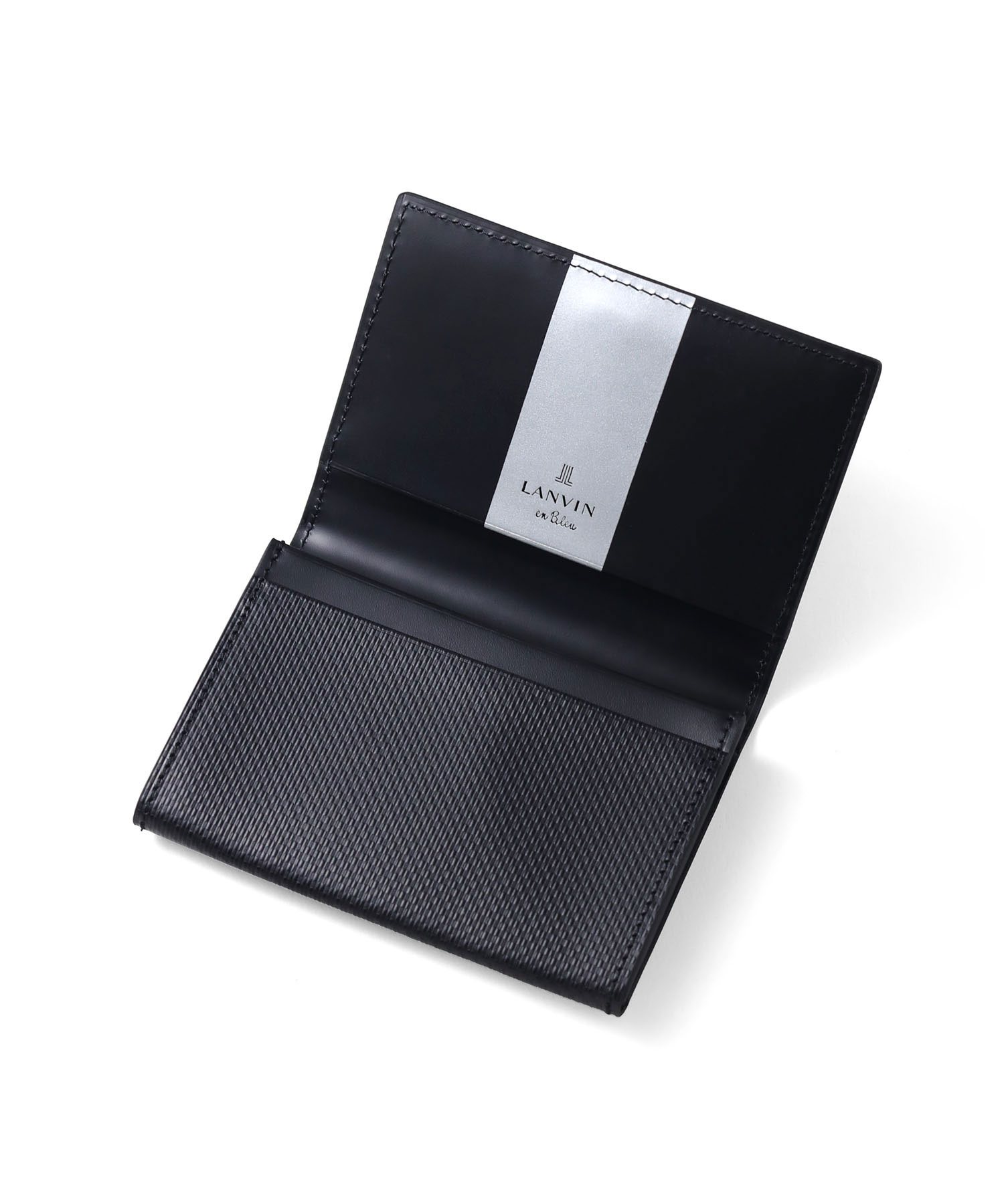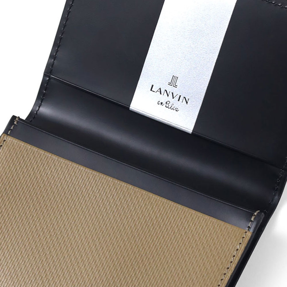 上品で落ち着いた雰囲気が魅力の、シンプルベーシックなランバンオンブルーの名刺入れ。本体には型押し加工を施したベーシックな牛革を使用。メタリックのロゴはシンプルながら存在感があり、上質な印象を引き立てます。