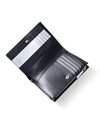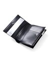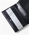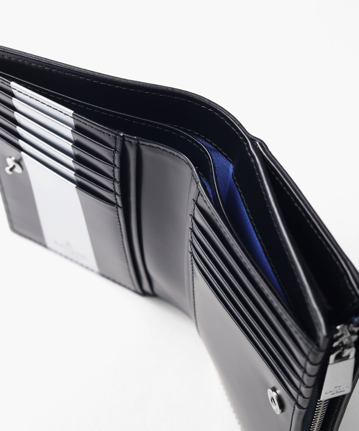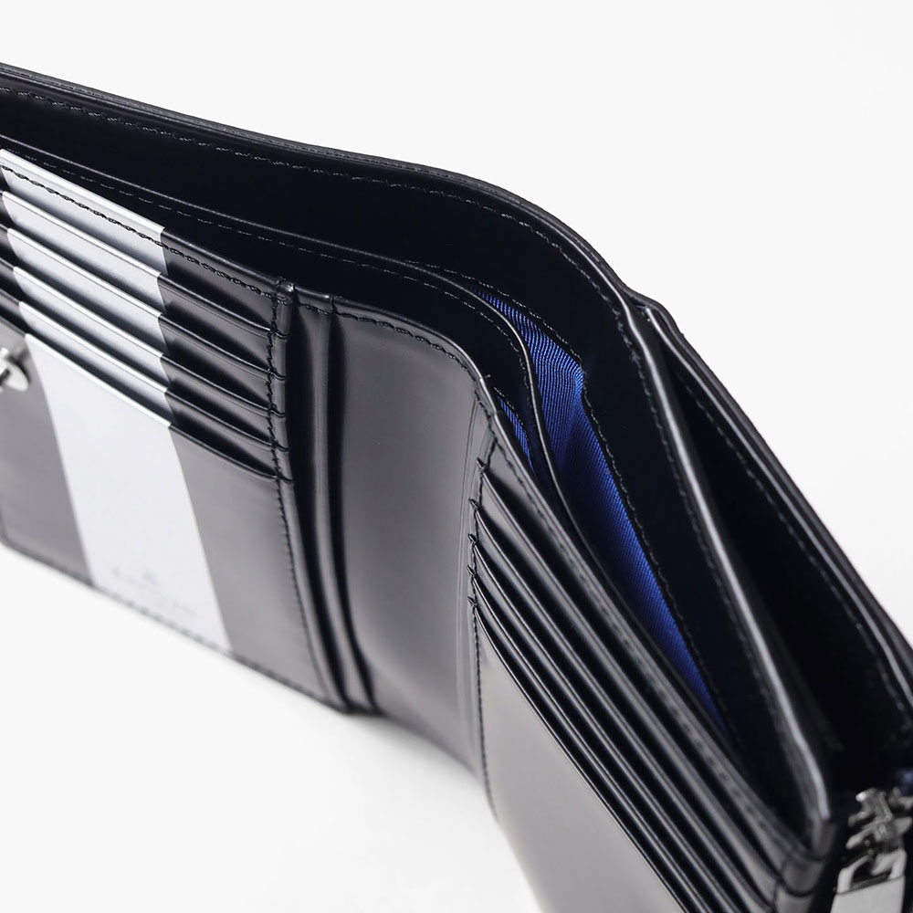 内側にはカード段が10、フリーポケットが4つあり、小銭入れは仕切り付きで中が見やすく、さらに小銭入れ内にカードポケットを2つ備えているためカード類も一緒に収納可能です。札入れは2室構造のため紙幣を分けて収納可能で、背面のカードポケットはICカードやクレジットカードの収納に便利です。また、内装のシルバーラインがさりげないデザインポイントとなっています。