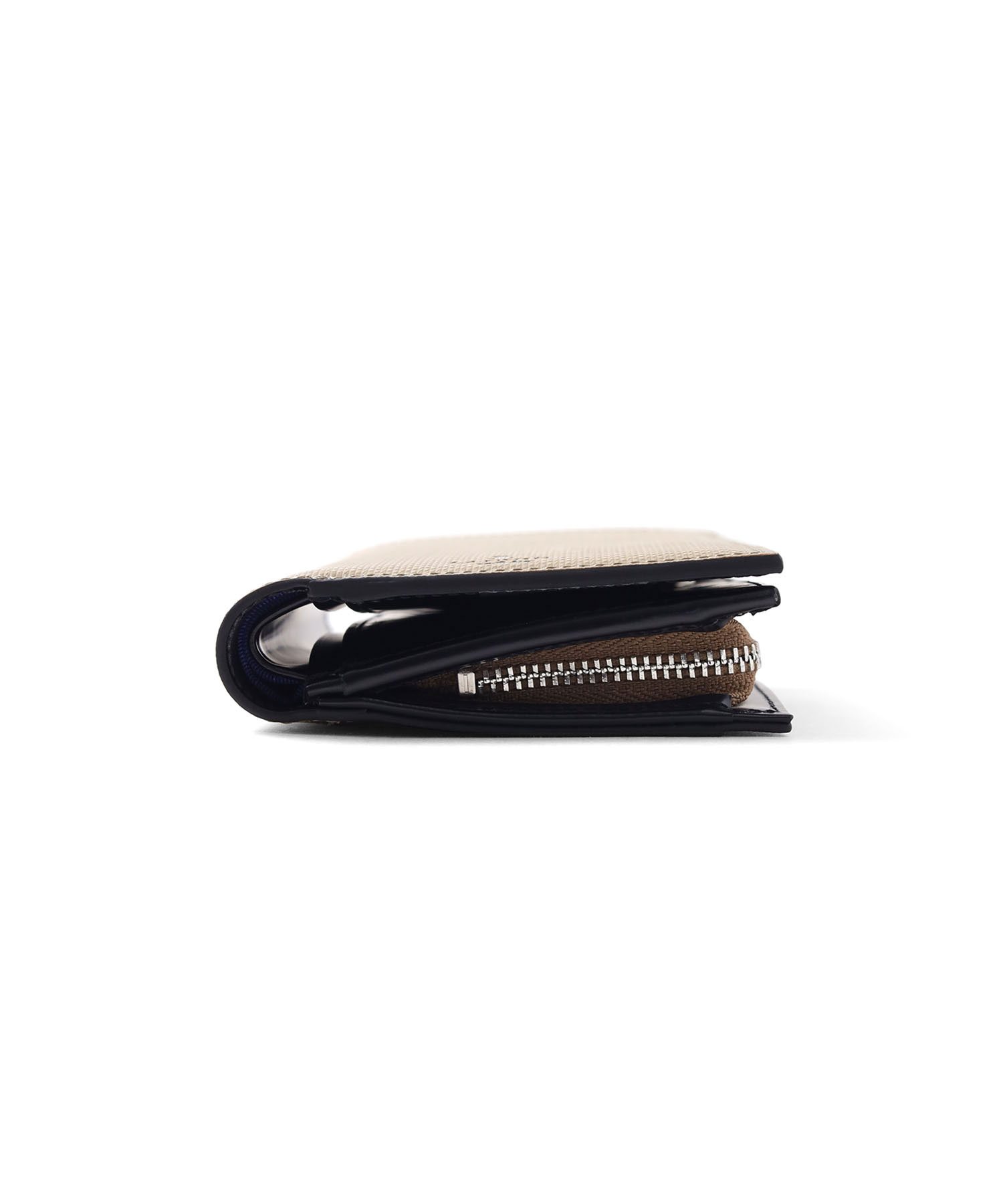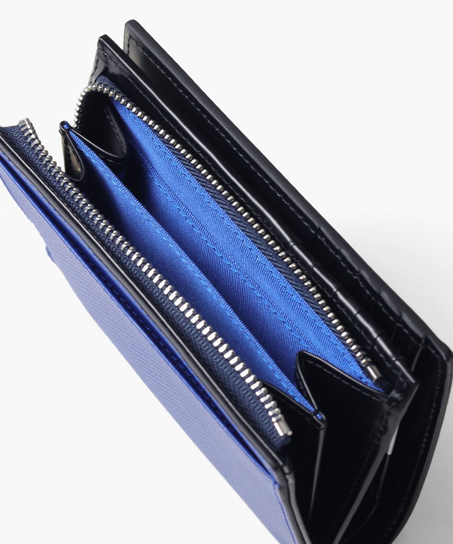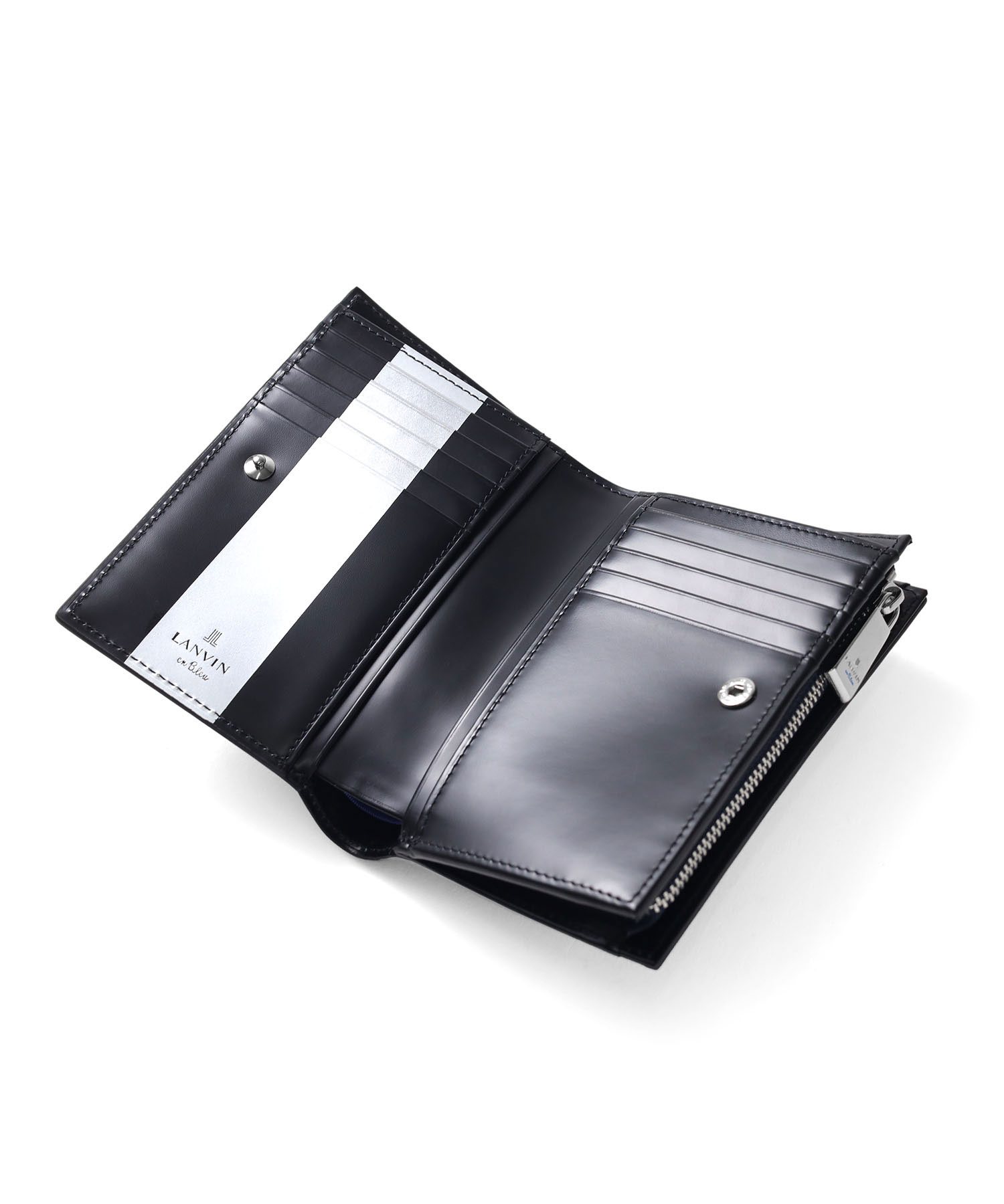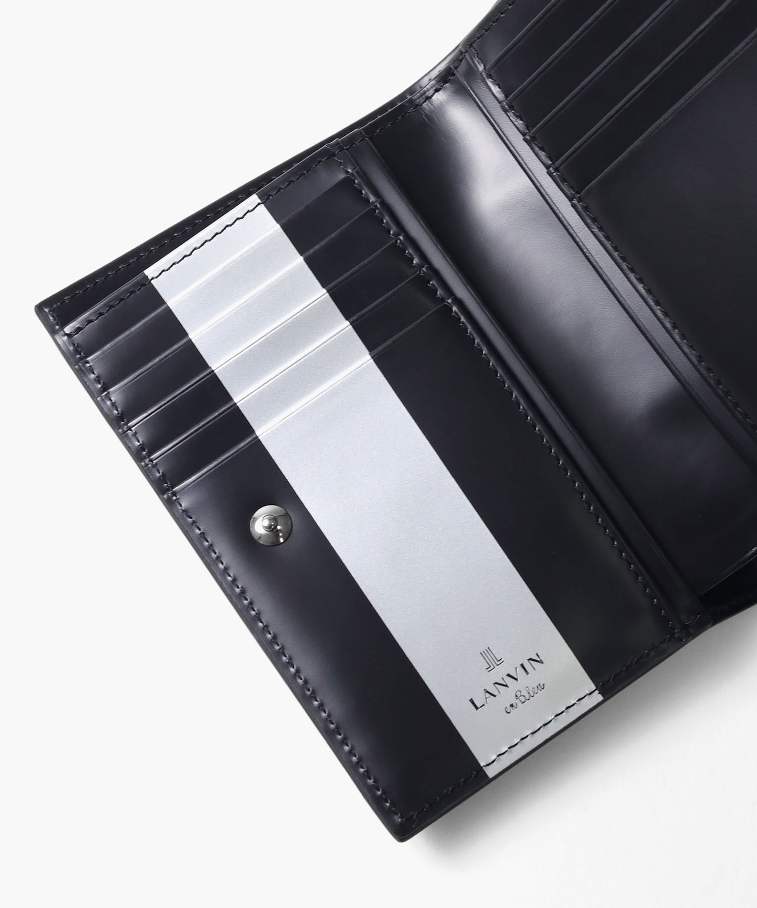 上品で落ち着いた雰囲気が魅力の、シンプルベーシックなランバンオンブルーのセミ長財布。本体には型押し加工を施したベーシックな牛革を使用。メタリックのロゴはシンプルながら存在感があり、上質な印象を引き立てます。
