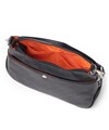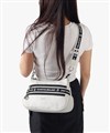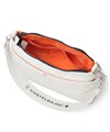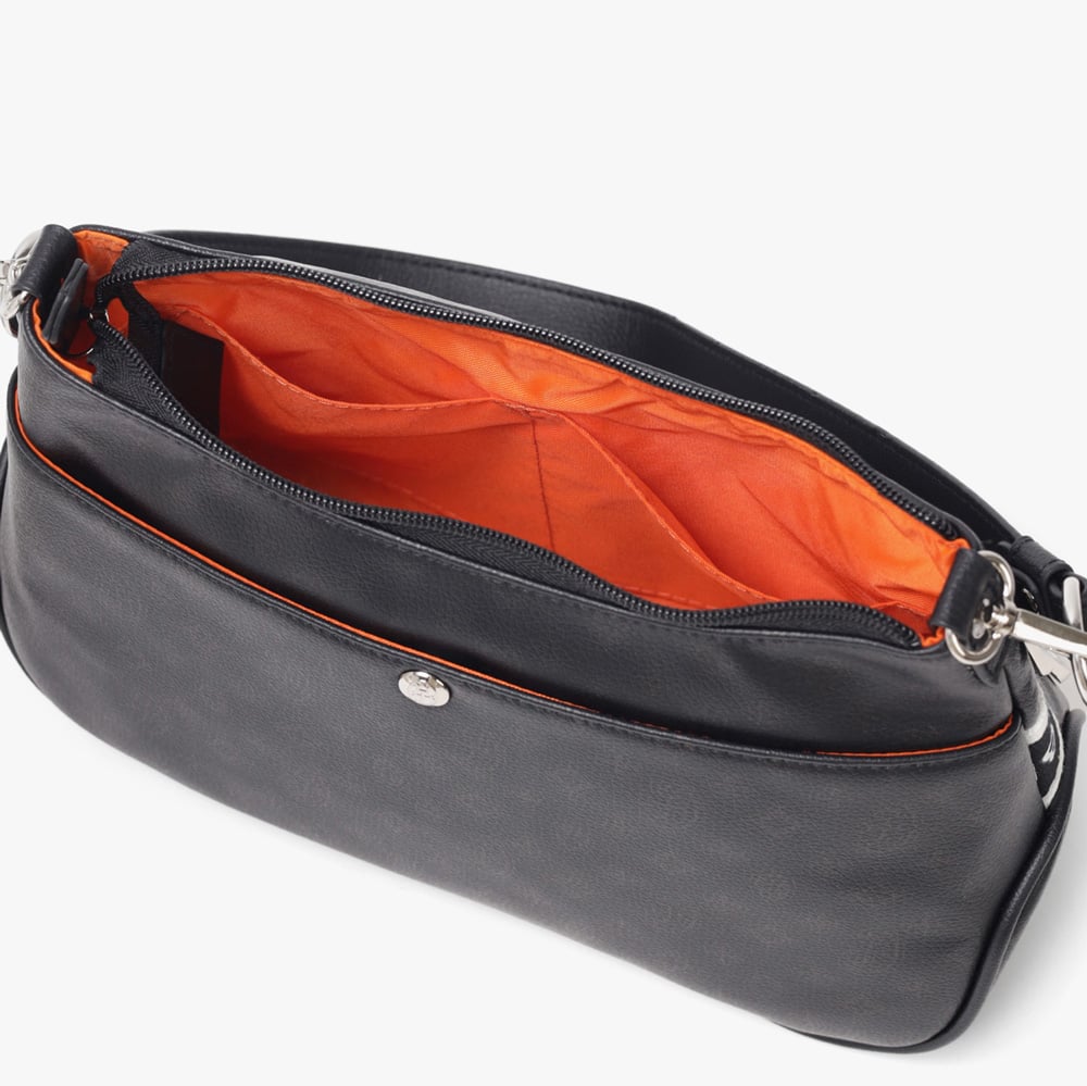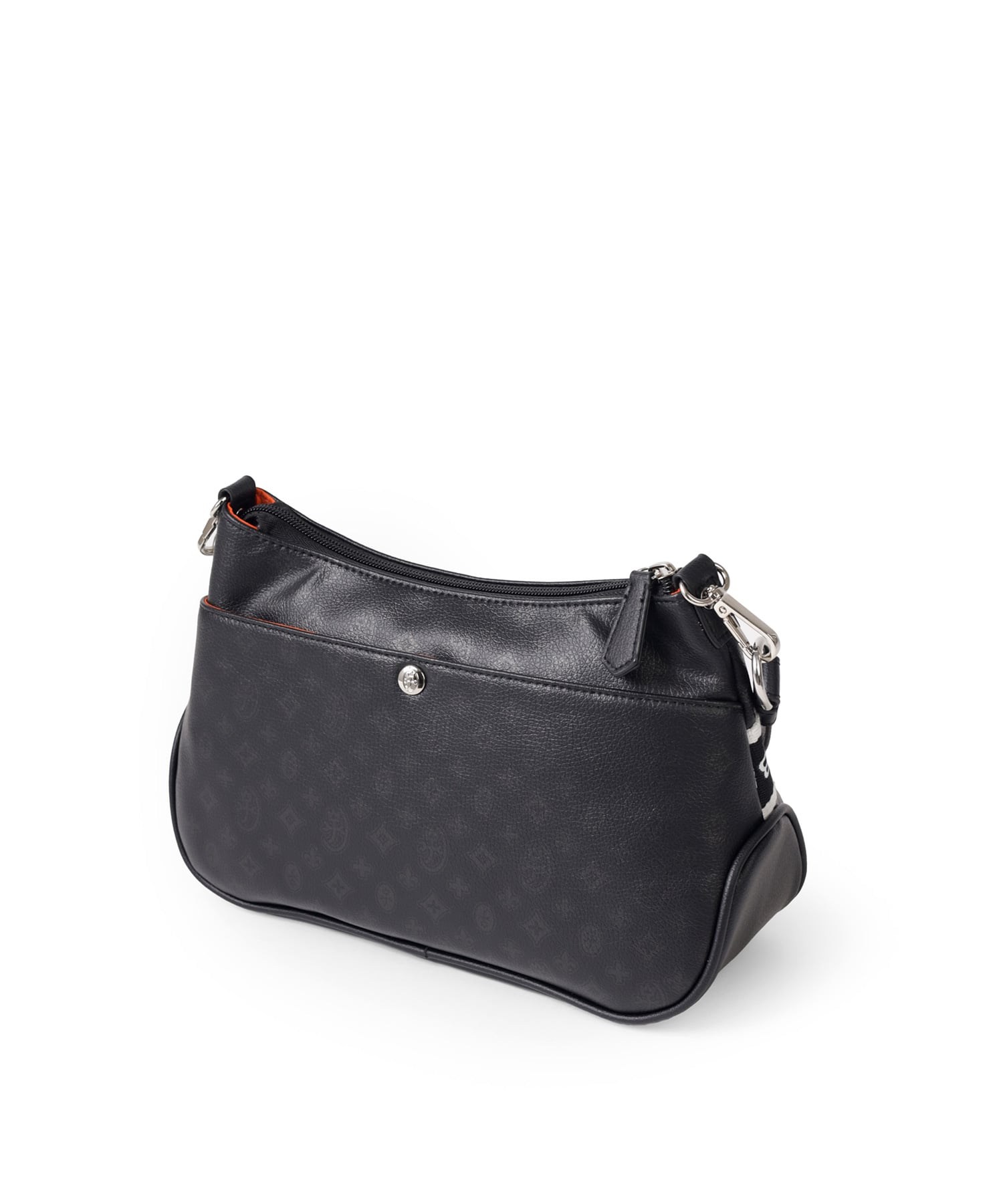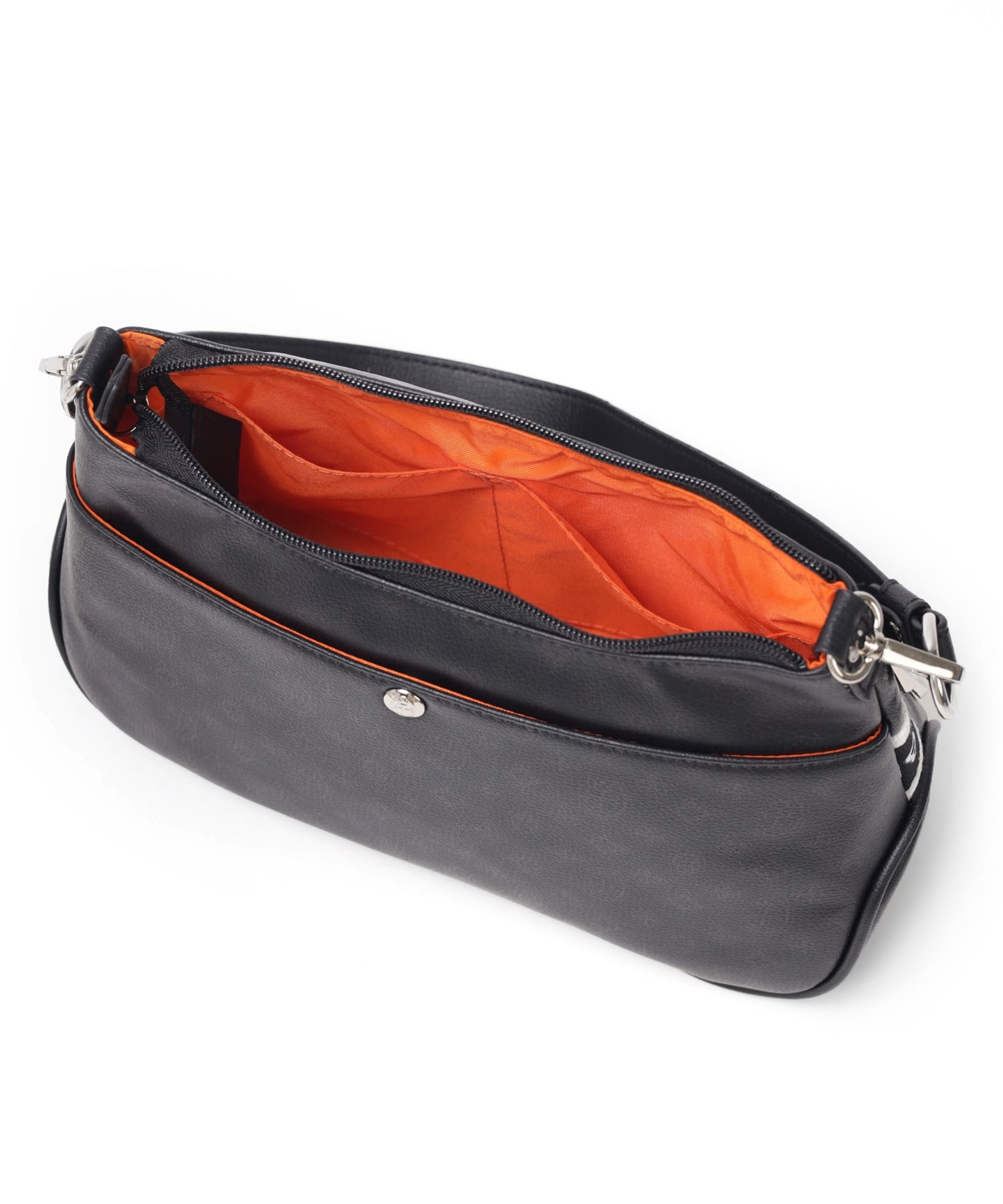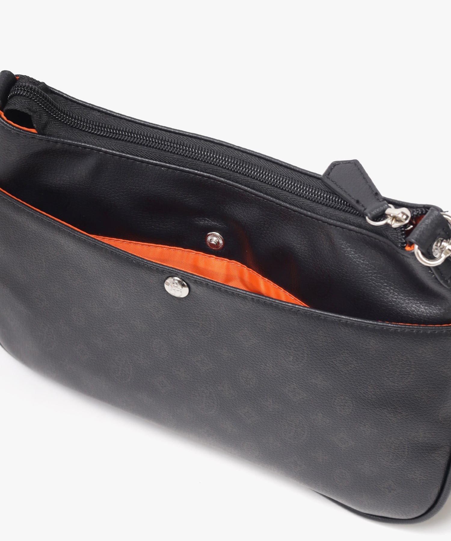 500mlペットボトルを横に寝かせて収納できるサイズ感のショルダーバッグです。メインルーム内には、ファスナーポケットが1つ、オープンポケットが2つ装備されています。バッグの前面にはファスナーポケットが2つあり、背面にもボタン付きポケットがございます。すぐに取り出したい小物収納に便利です。