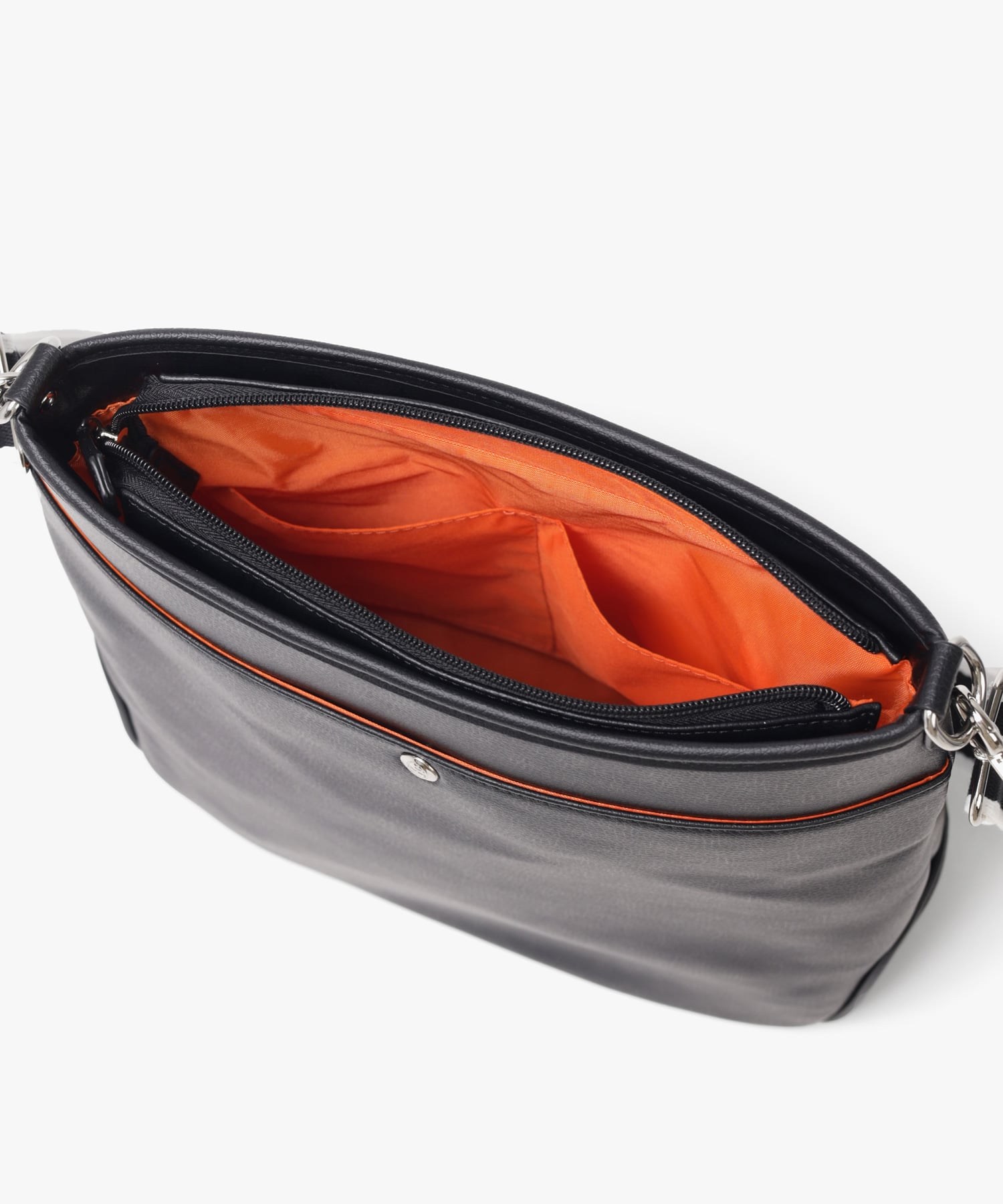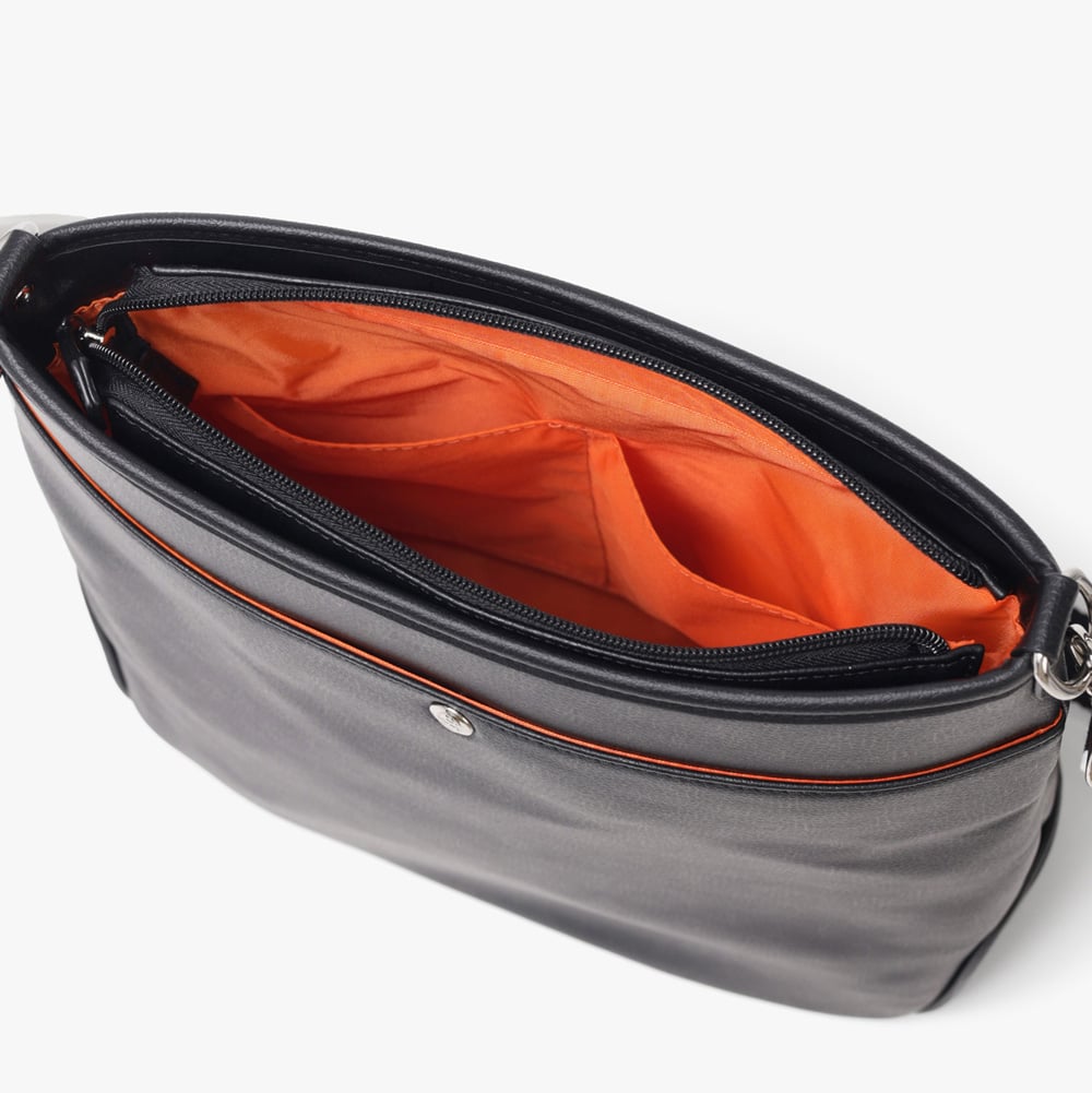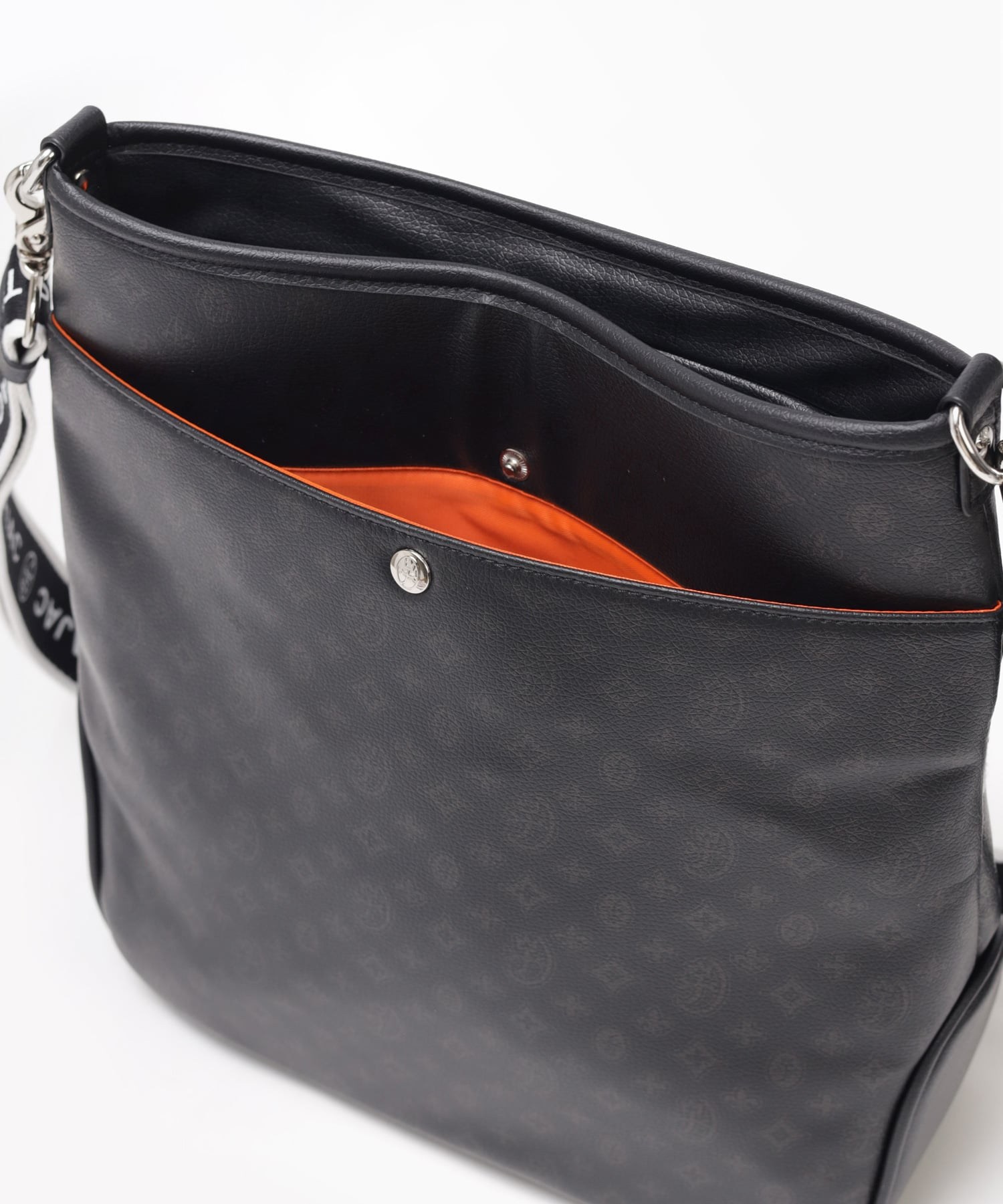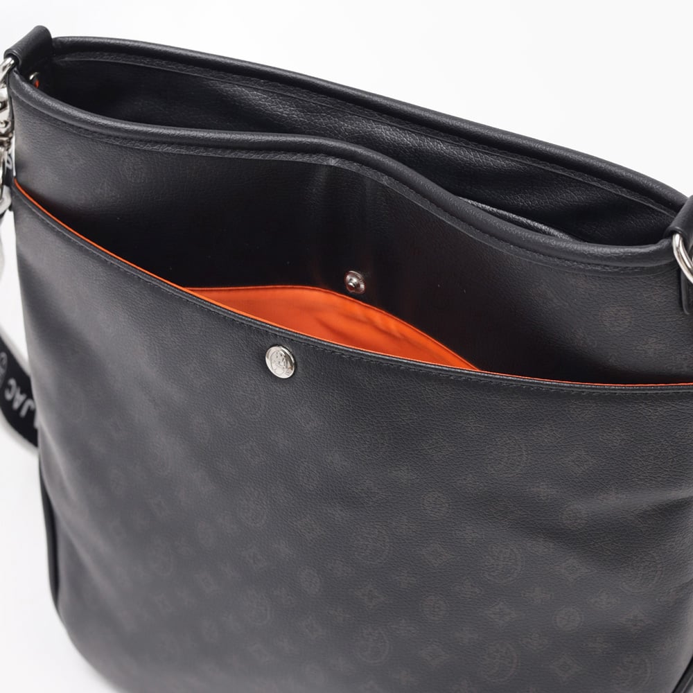 A4ジャストサイズのショルダーバッグ。メインルーム内には、ファスナーポケットが1つ、オープンポケットが2つ装備されています。バッグの前面にはファスナーポケットが2つあり、背面にもボタン付きポケットがございます。すぐに取り出したい小物収納に便利です。