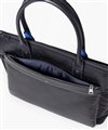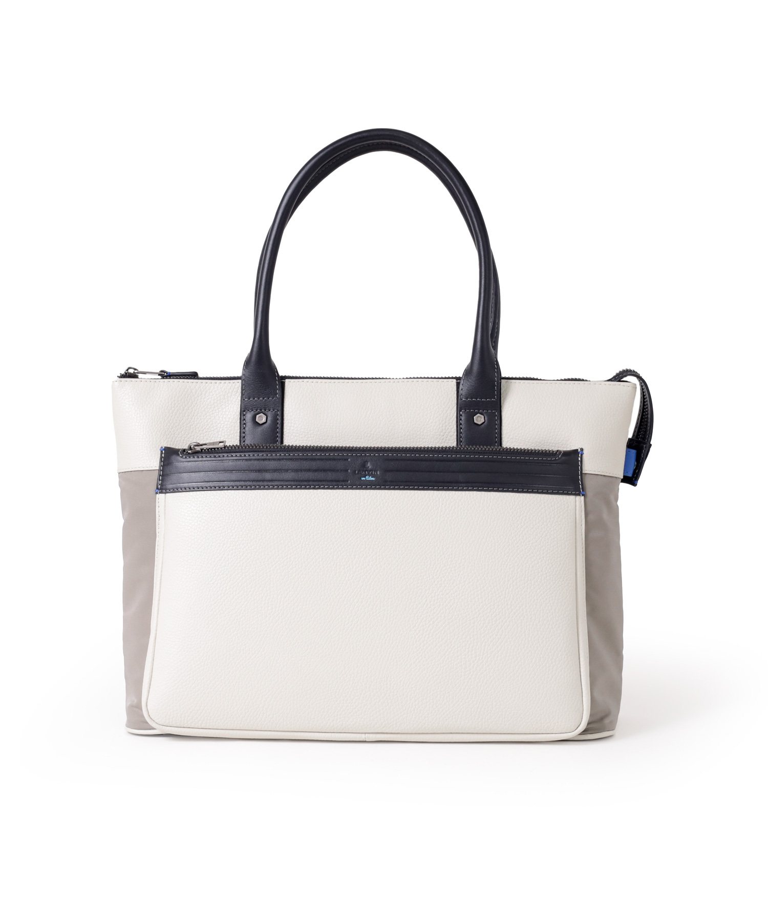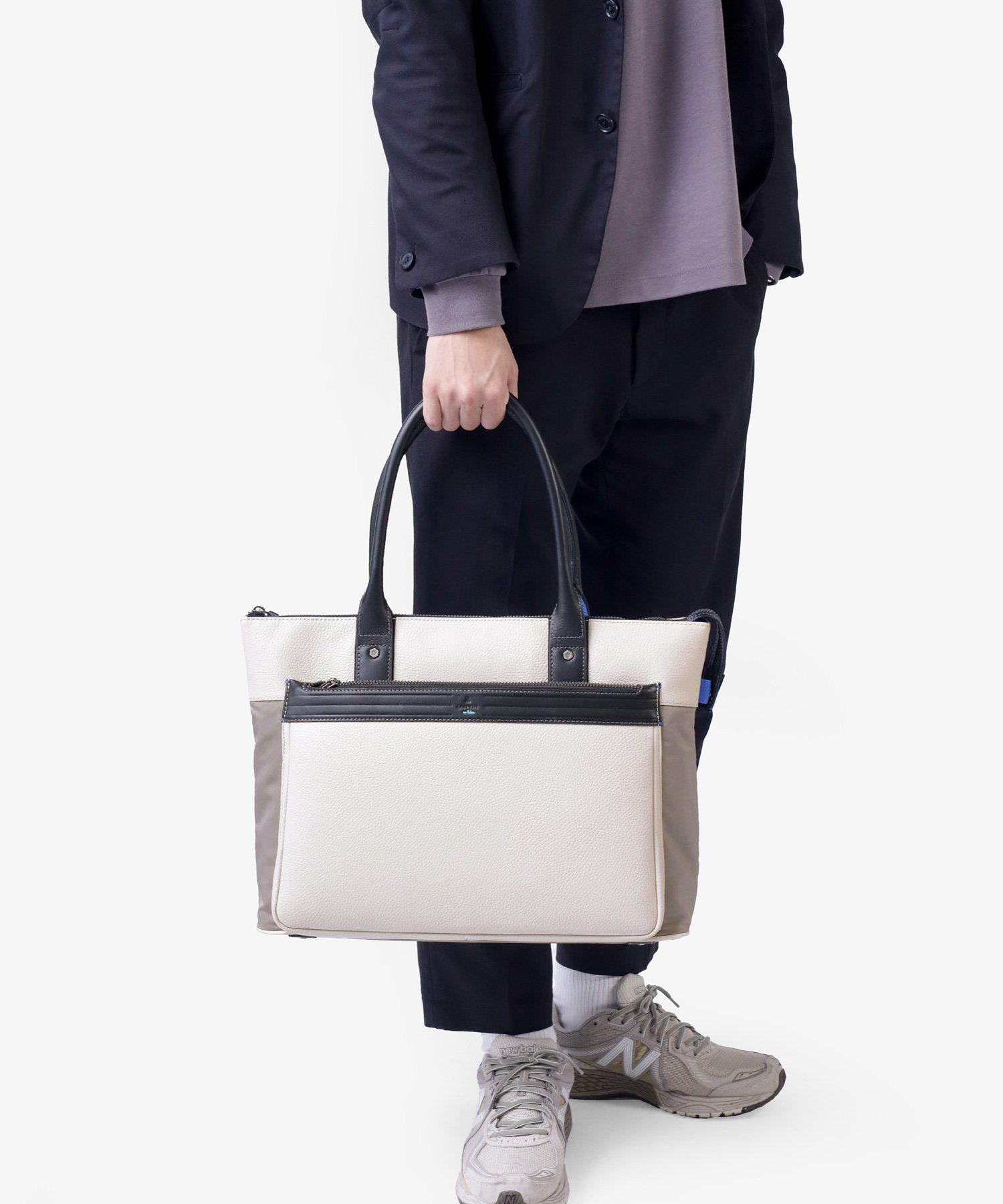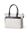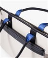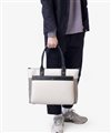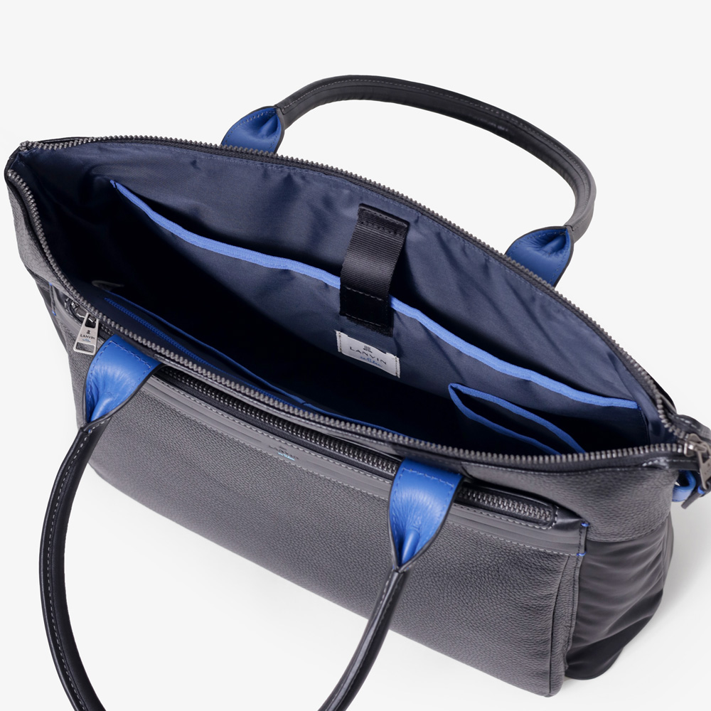 上品なテイストのカジュアルトートバッグに、3種類の素材を巧みにMIXしたLANVIN en BleuのB4サイズのトートバッグ。ベルト状のストライプエンボス加工がブランドらしい洗練されたポイントとなっています。メインルームは15.6インチのPCやペットボトルを収納可能で、小物ポケットも充実しています。