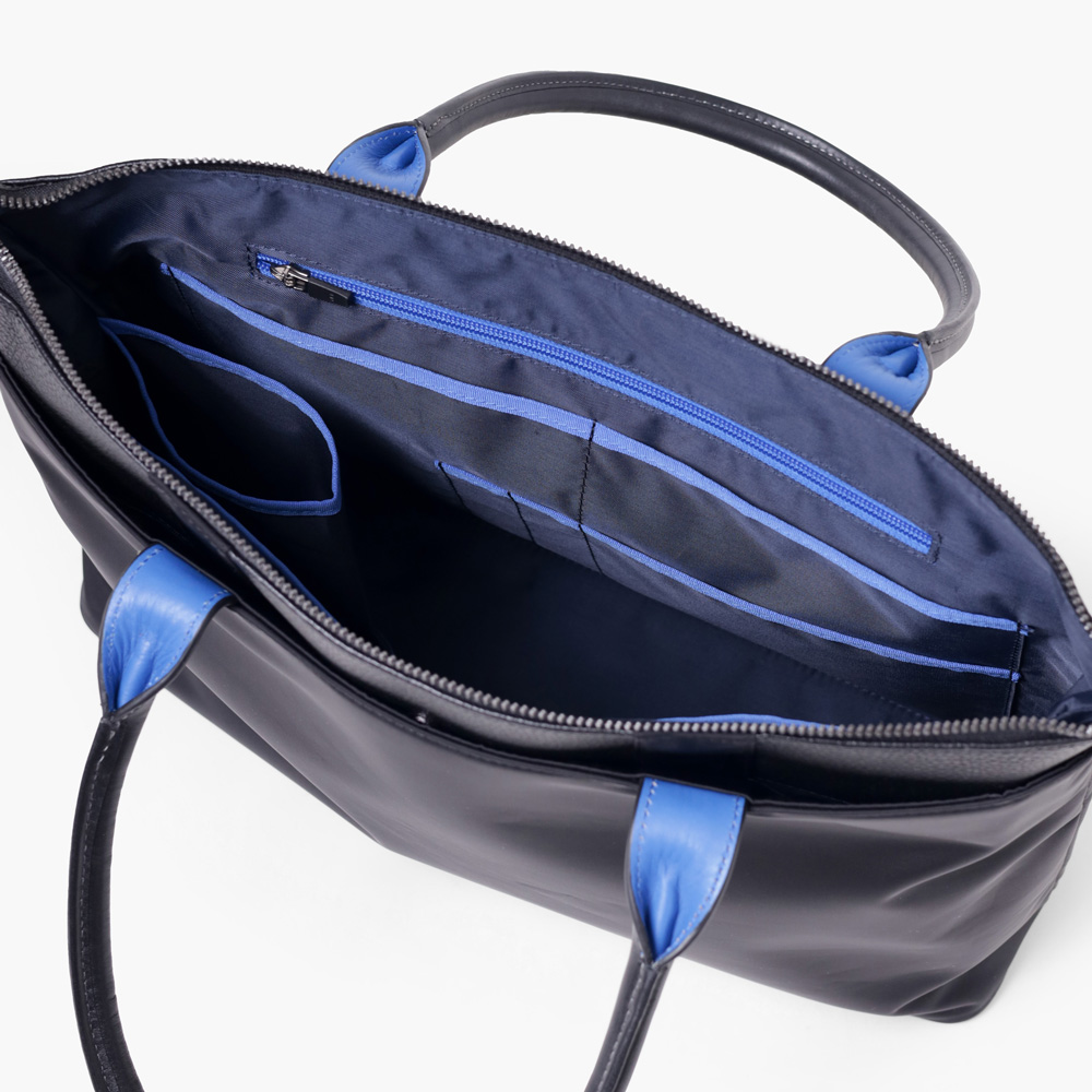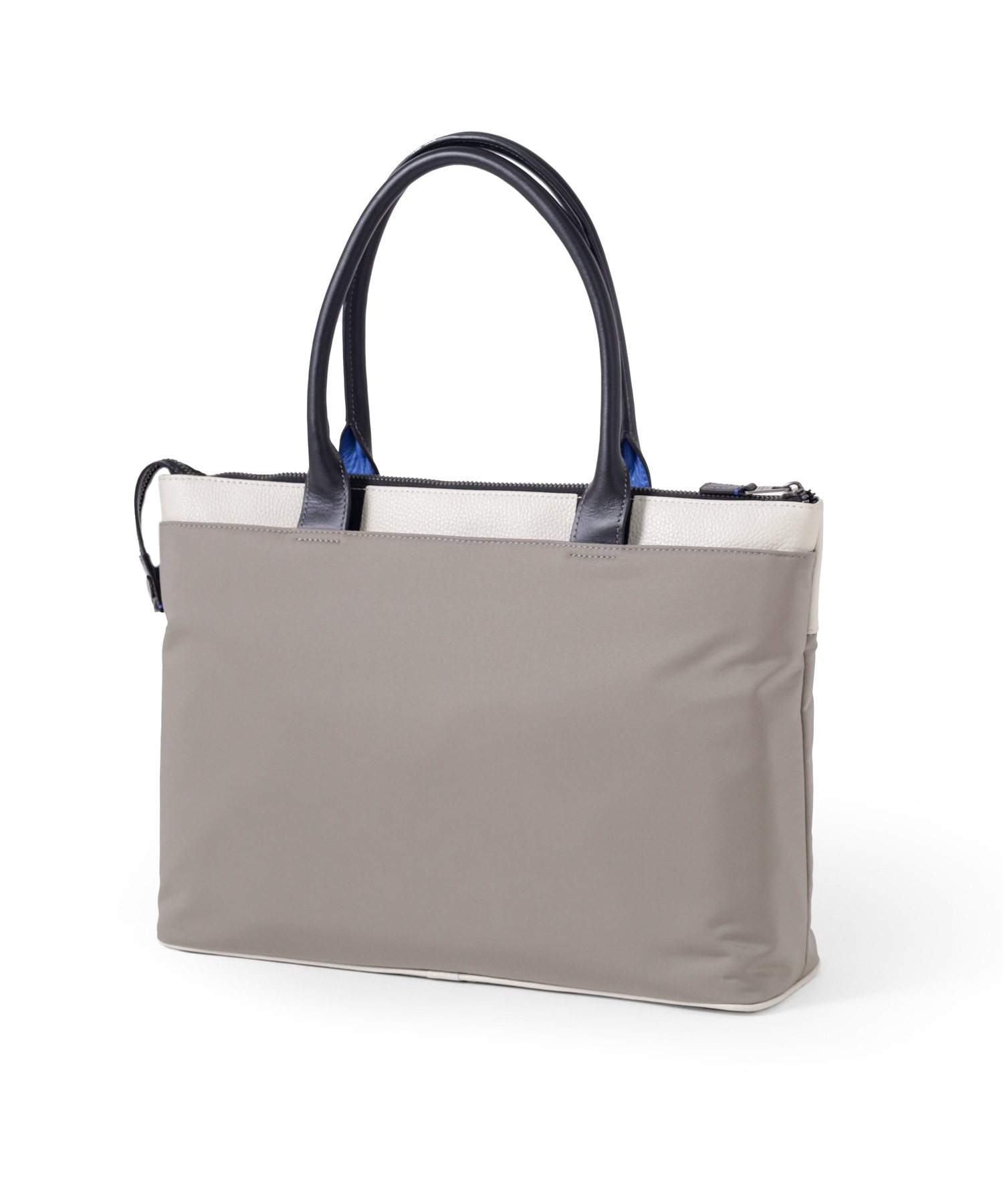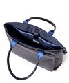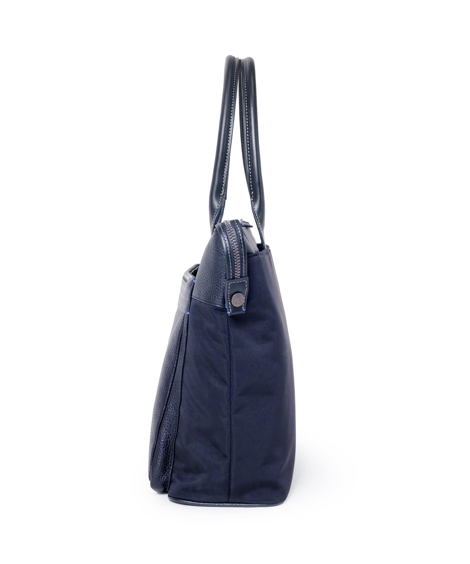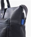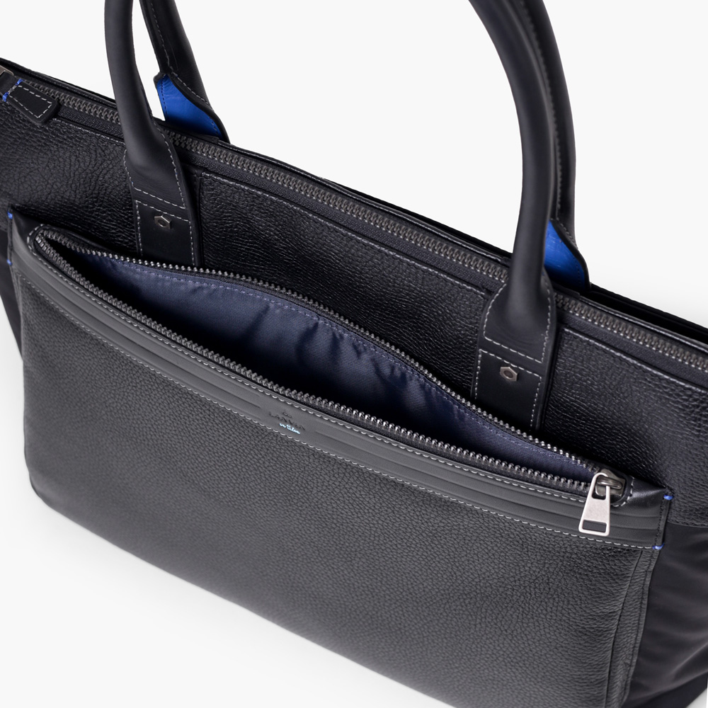 上品なテイストのカジュアルトートバッグに、3種類の素材を巧みにMIXしたLANVIN en BleuのB4サイズのトートバッグ。ベルト状のストライプエンボス加工がブランドらしい洗練されたポイントとなっています。メインルームは15.6インチのPCやペットボトルを収納可能で、小物ポケットも充実しています。