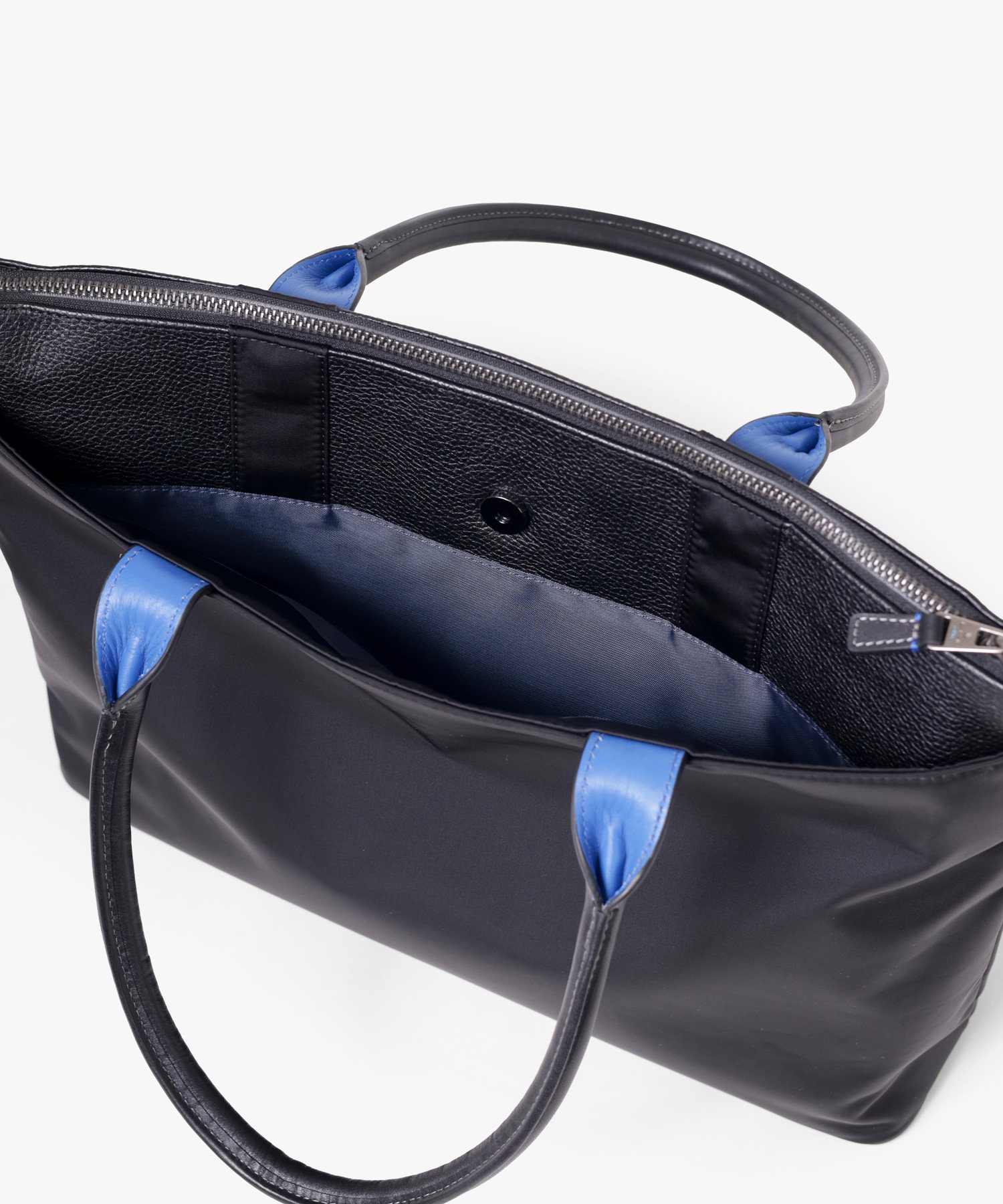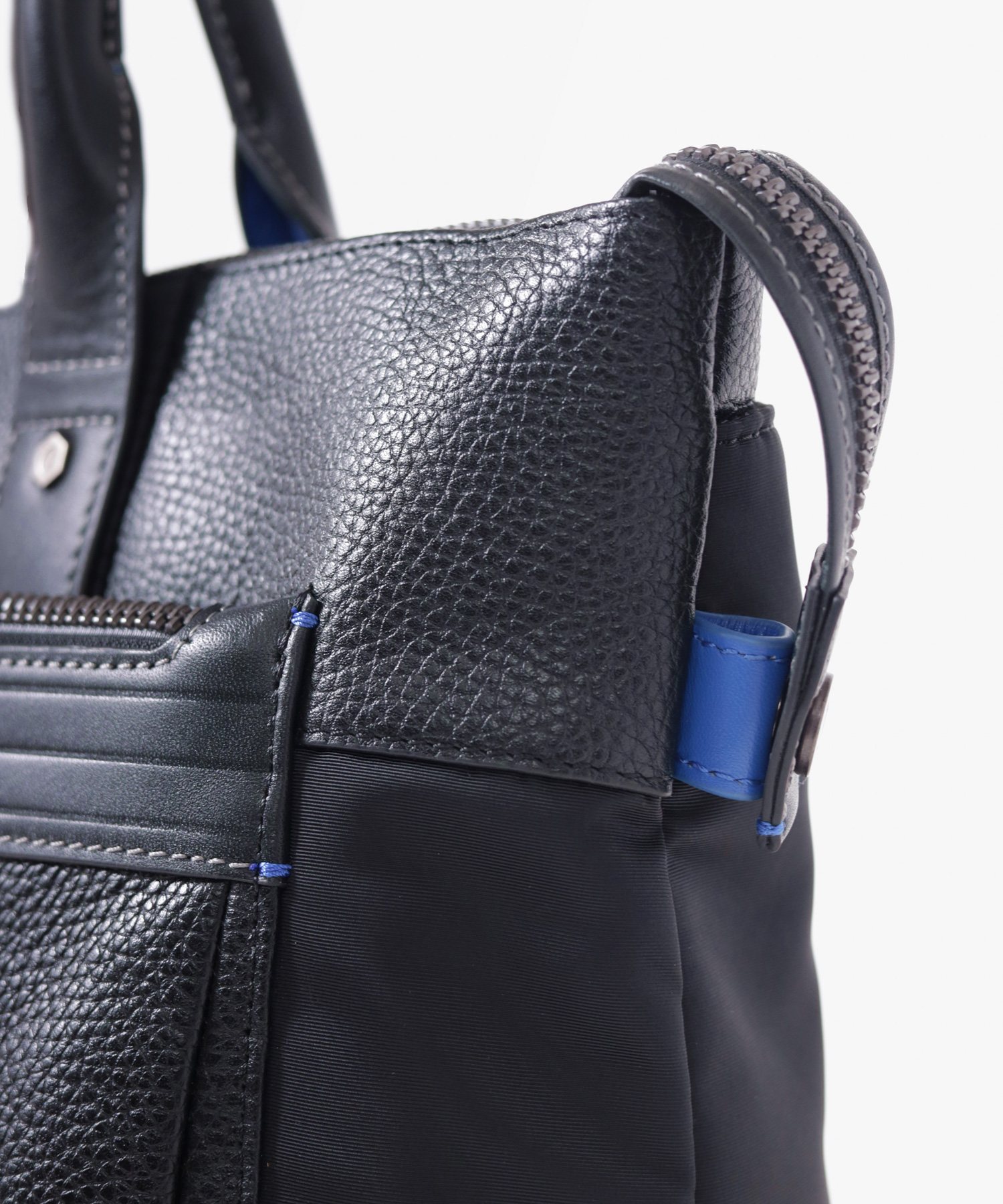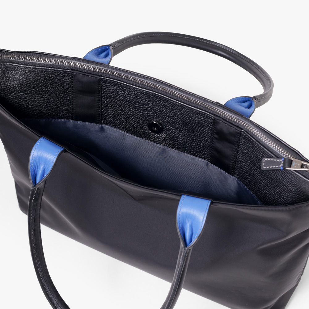 主素材には色落ちや表面強度に優れたシュリンクレザーを採用し、ヌメ調スムースレザーとナイロンとの3種類の素材を組み合わせ、LANVIN en Bleuらしい上品な印象を醸し出しています。特にナイロン部分には東レ株式会社のミラコスモRナイロン糸を使用し、非常に滑らかな肌触りと上品な光沢が特徴です。縦糸よりも太い横糸を用いたタッサー織りは、丈夫で耐久性にも優れています。