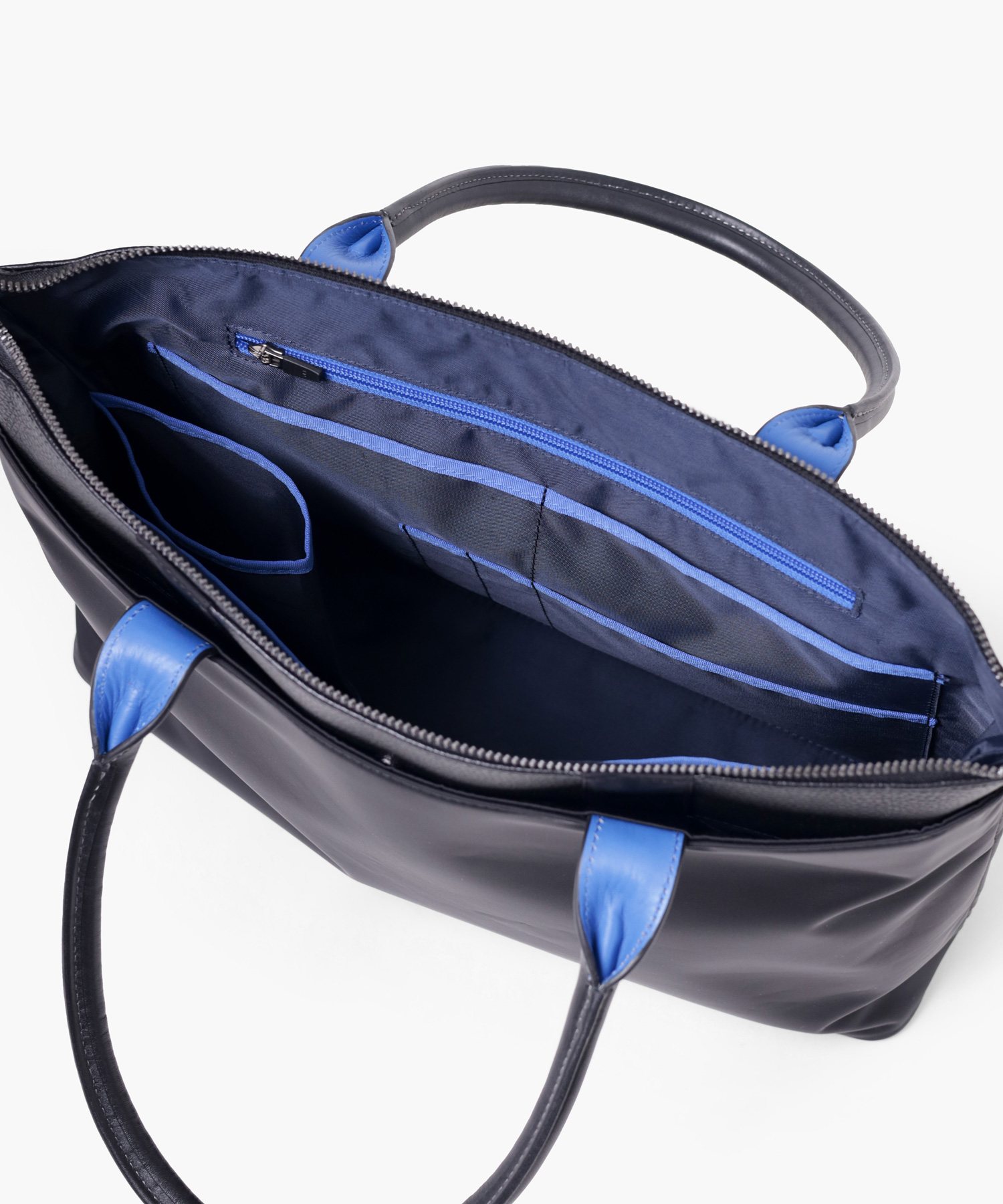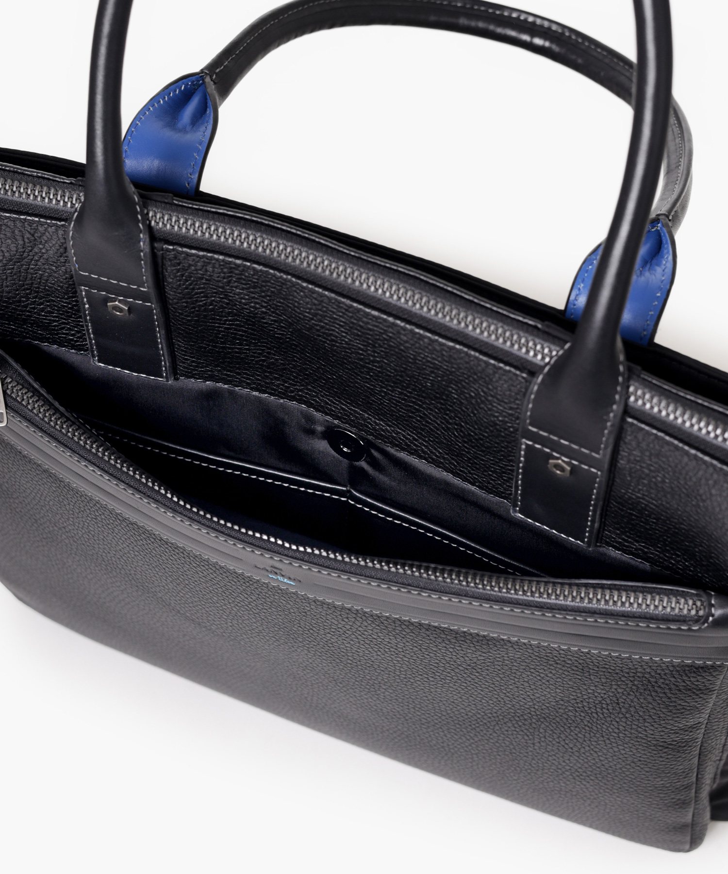 メインルームは、B4ファイルや15.6インチPCが入るサイズ感です。内側には、PCやタブレット収納に便利なクッション付きポケット(幅35 x 高23cm)、ペットボトルホルダー、ファスナーポケット、オープンポケット、ペン差しが搭載。前面ポケットはファスナーポケットとホックポケットの2層式で、背面にもホックポケットがございます。