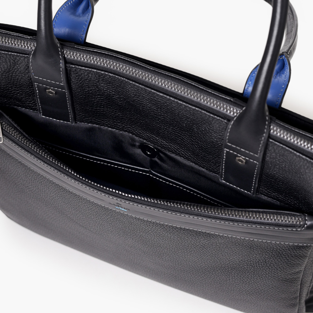 ファスナー下に配されたベルト状のストライプエンボス部分は、心材を入れたような独特な凹凸感を出し、洗練された印象を与えます。ファスナーには「METALUXE Tough」を使用し、ガラスファイバーを練り込んだ高強度化と、通常の金属ファスナーよりも軽量な仕上がりを実現。ブランドの象徴的なブルーカラーも、アクセントとして魅力を加えています。