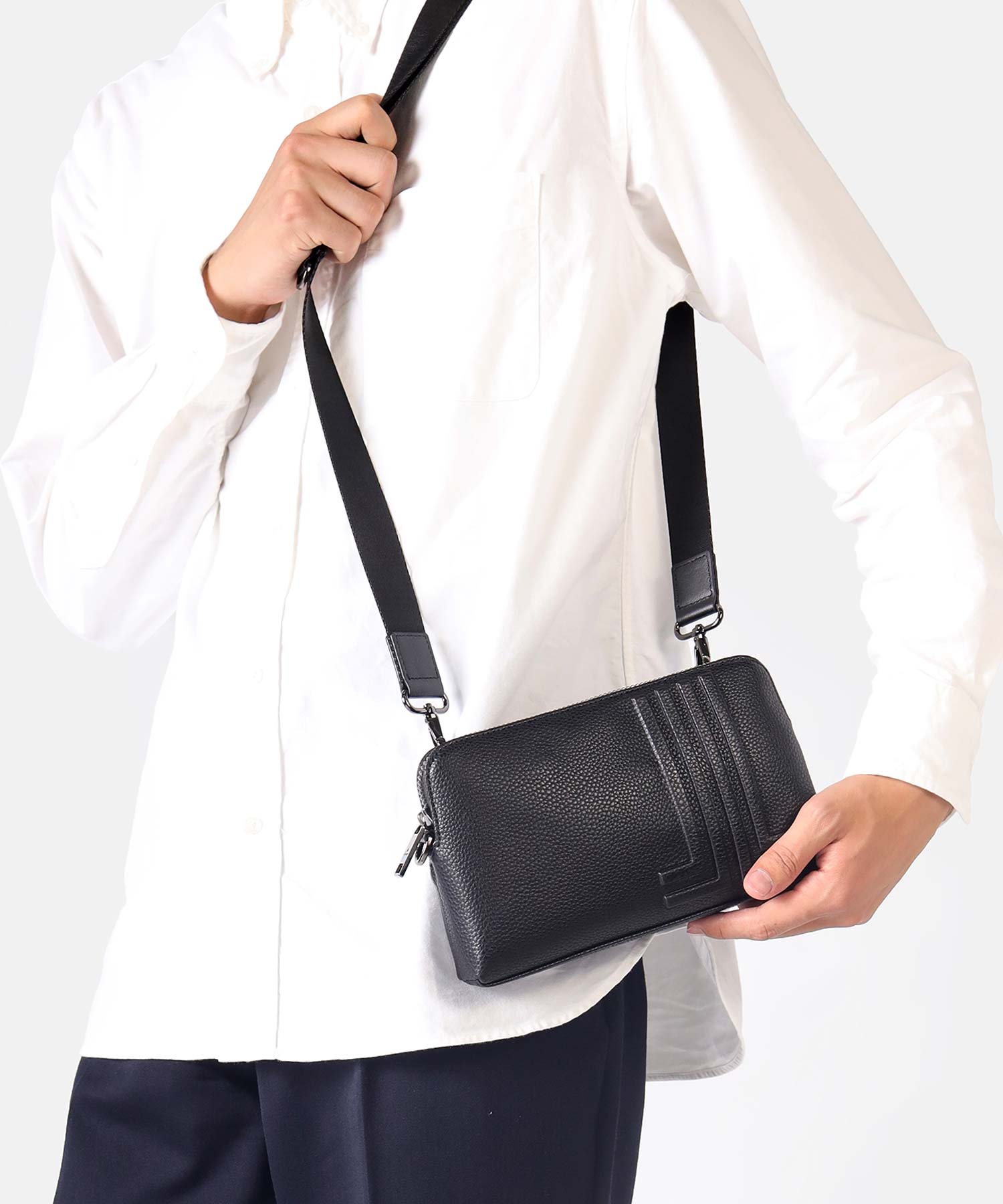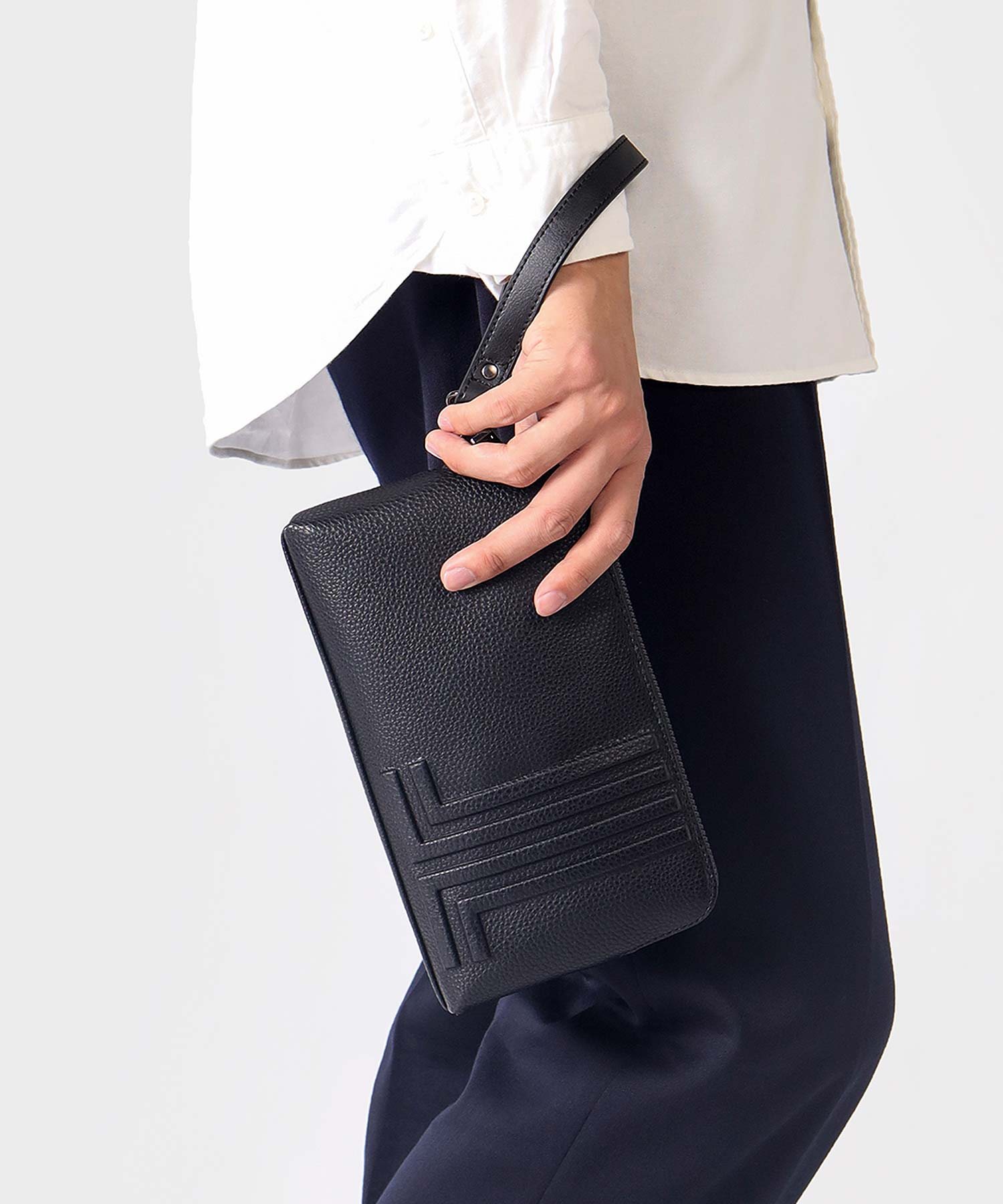 内装にカード段があり、カード収納が可能になっております。ブランドを象徴するJLマークを前面に表現しており、コンパクトながらモードなインパクトを演出しています。また、クラッチバッグ用持ち手とショルダーベルトを付け替えることによってクラッチバッグとショルダーバッグの2種類の鞄に使い分けることも可能です。