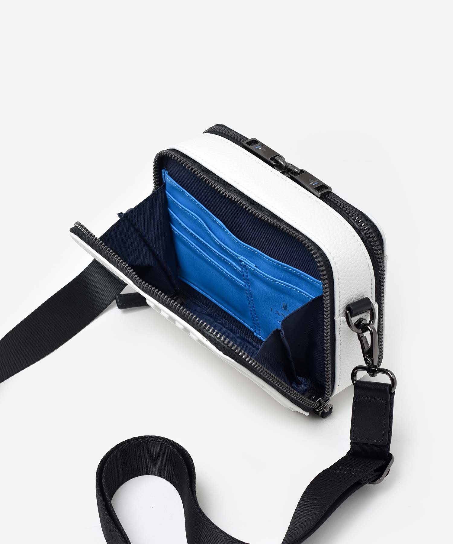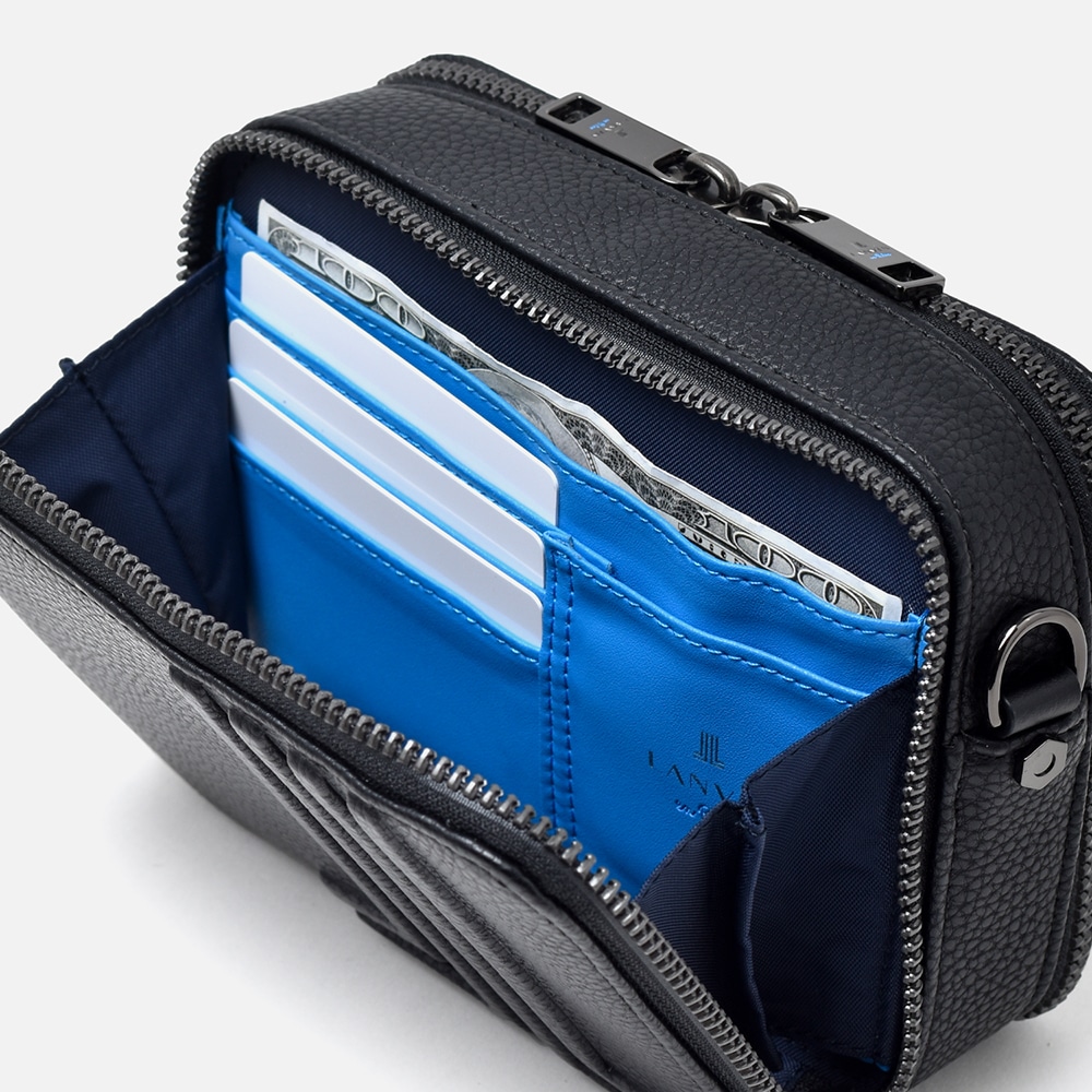 財布を持たないミニマリストのためのコンパクトなLANVIN en Bleuのショルダーバッグ。内装にカード段があり、カード収納が可能になっております。ブランドを象徴するJLマークを前面に表現しており、コンパクトながらモードなインパクトを演出しています。