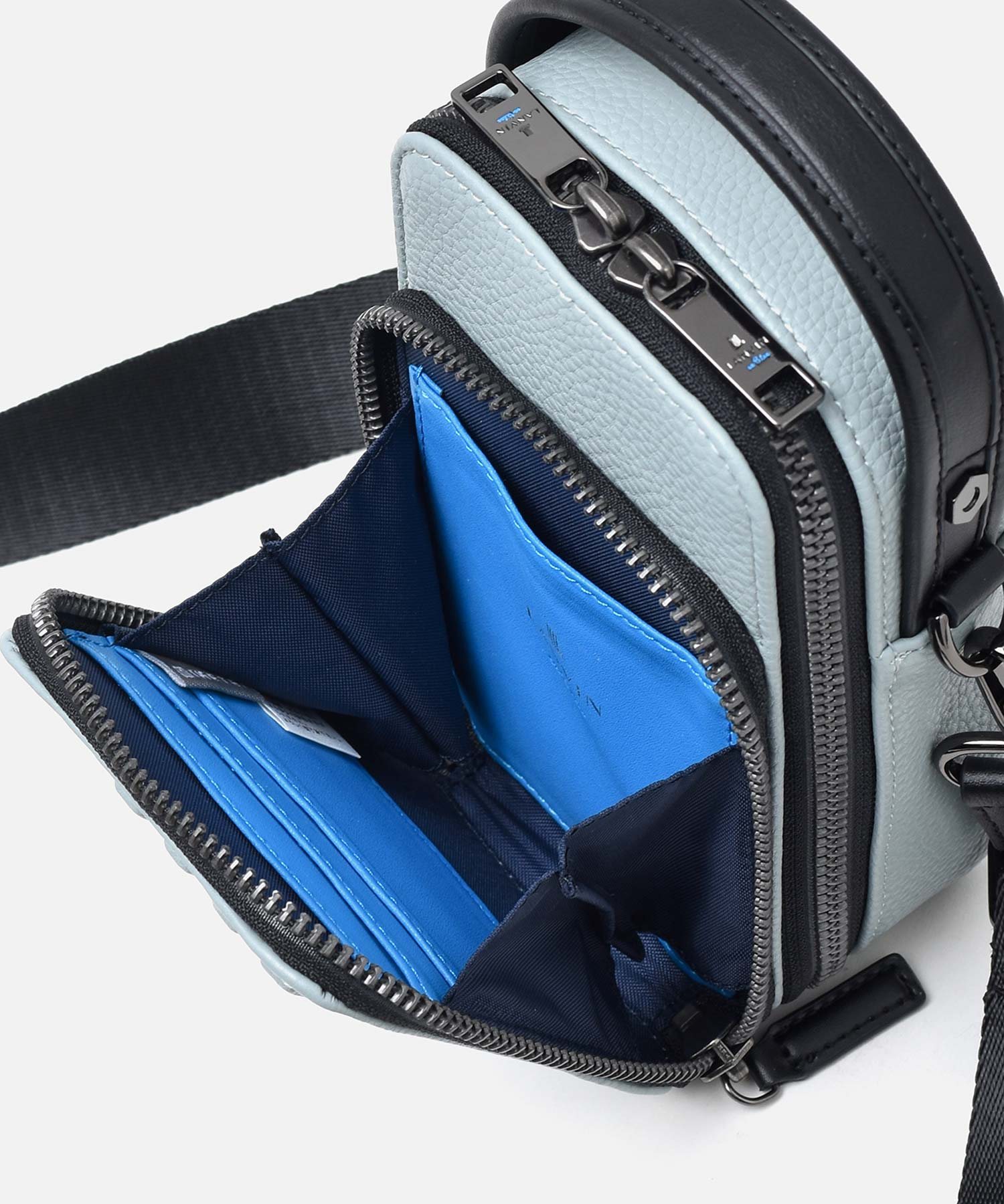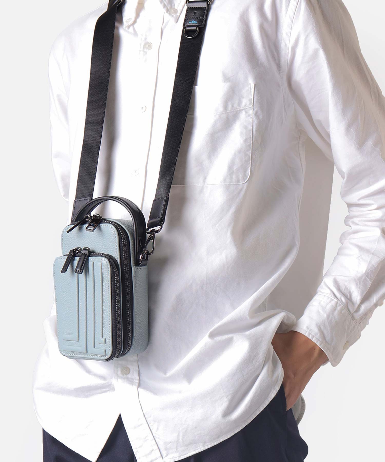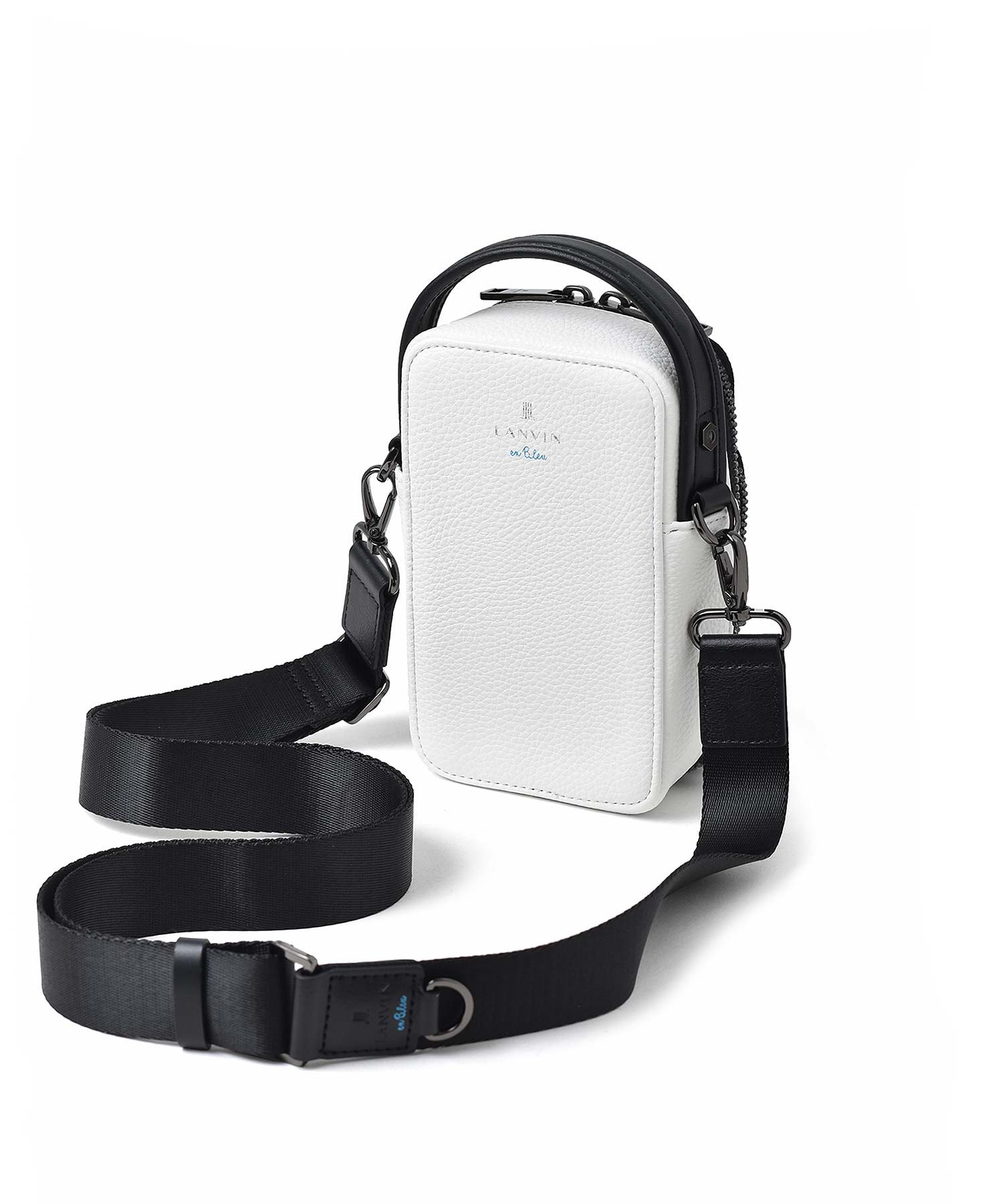 財布を持たないミニマリストのためのコンパクトなLANVIN en Bleuの2WAYスマホショルダーバッグ。内装にカード段があり、カード収納が可能になっております。ブランドを象徴するJLマークを前面に表現しており、コンパクトながらモードなインパクトを演出しています。また、ショルダーベルトを取り外すことによってハンドバッグとしてもお使いいただくことも可能です。