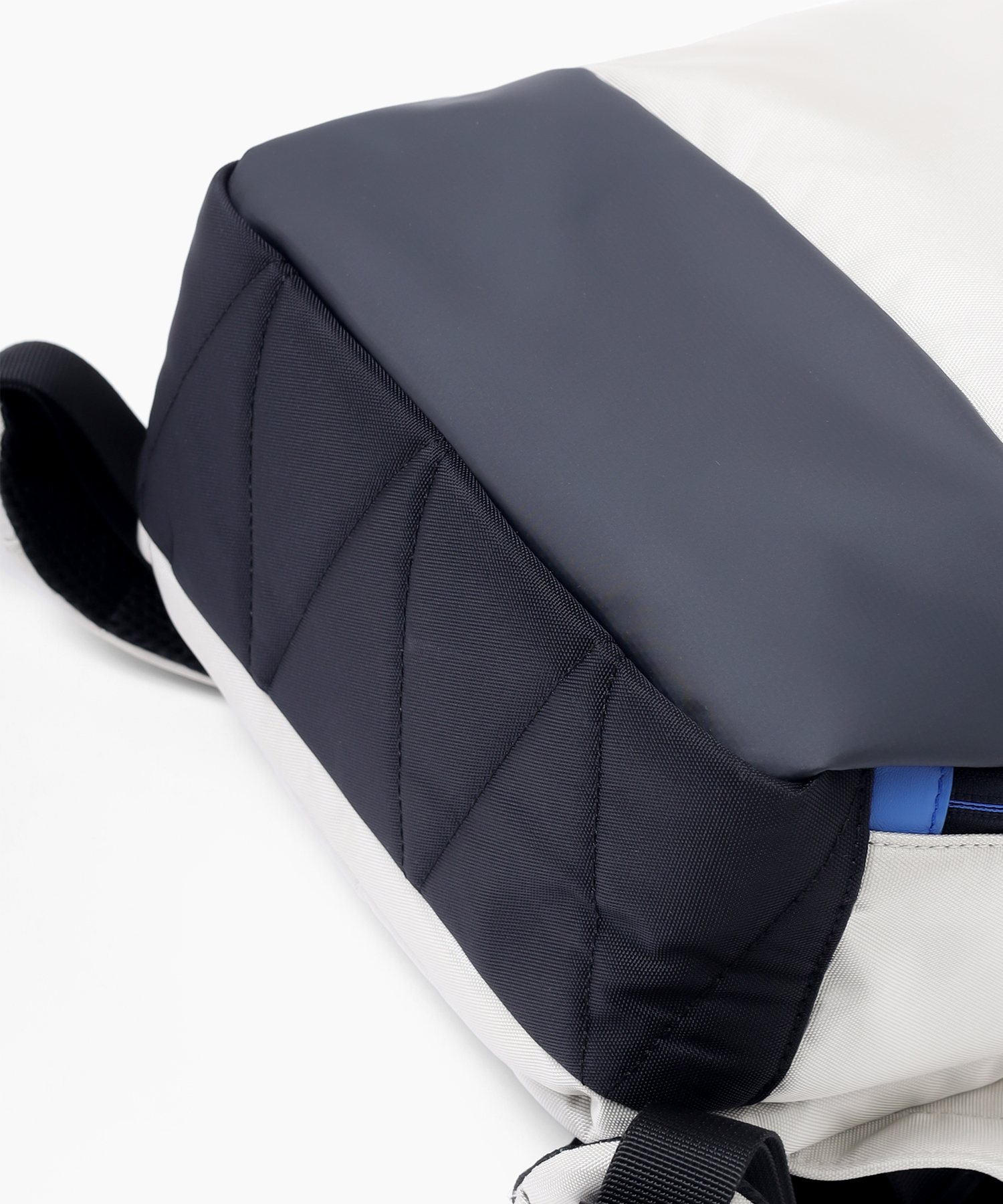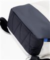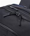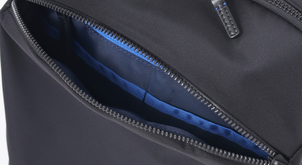 本体素材には、程よいボリューム感のあるナイロンオックス生地を使用しています。中空糸を使用することで、強撚・高密度で織られているため、上品な艶感や織り目が大人っぽく落ち着いた雰囲気を演出しています。付属生地には、インプット資料からピックアップしたターポリン生地を使用しています。また、ファスナーには2種類のファスナーを使用しており、メタル類やブルーラインを施すなど細部にまでこだわりぬいたデザインに仕上げています。