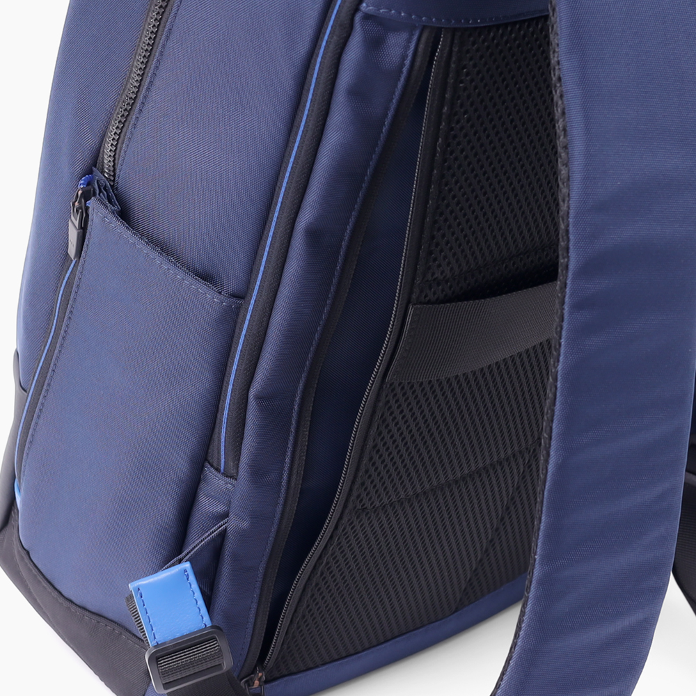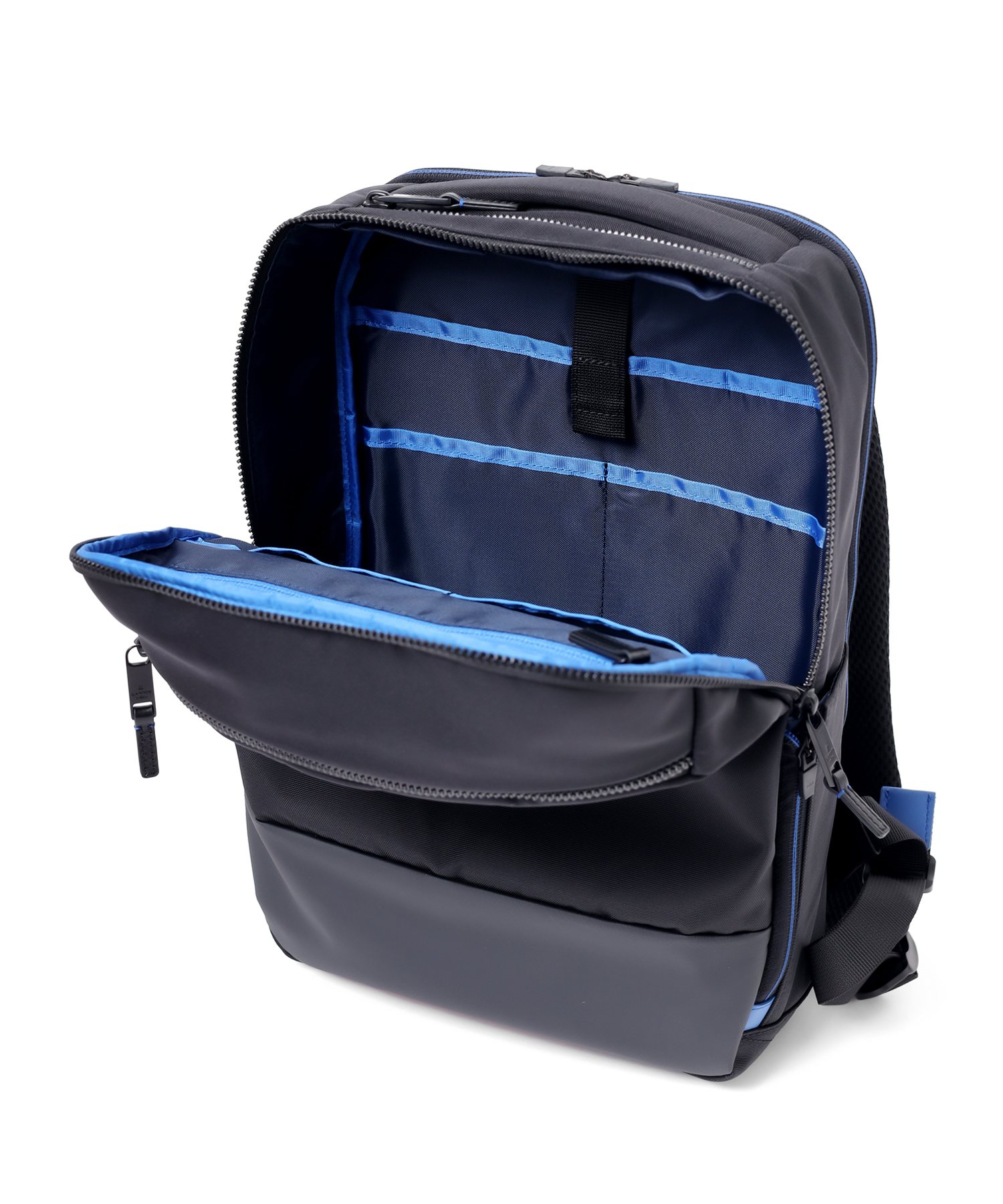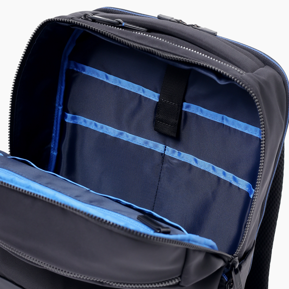 内装にはA4ファイルがすっぽり収まるサイズ感で、ボトルや手帳、長財布などビジネスシーンで持ち歩くアイテムも十分入る、収納性のあるリュックです。後室にはPCの収納に最適なクッションポケットが備わっております。ポケットサイズは幅25cmx高さ30cmで、13.3インチのPCを収納することができます。