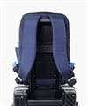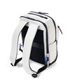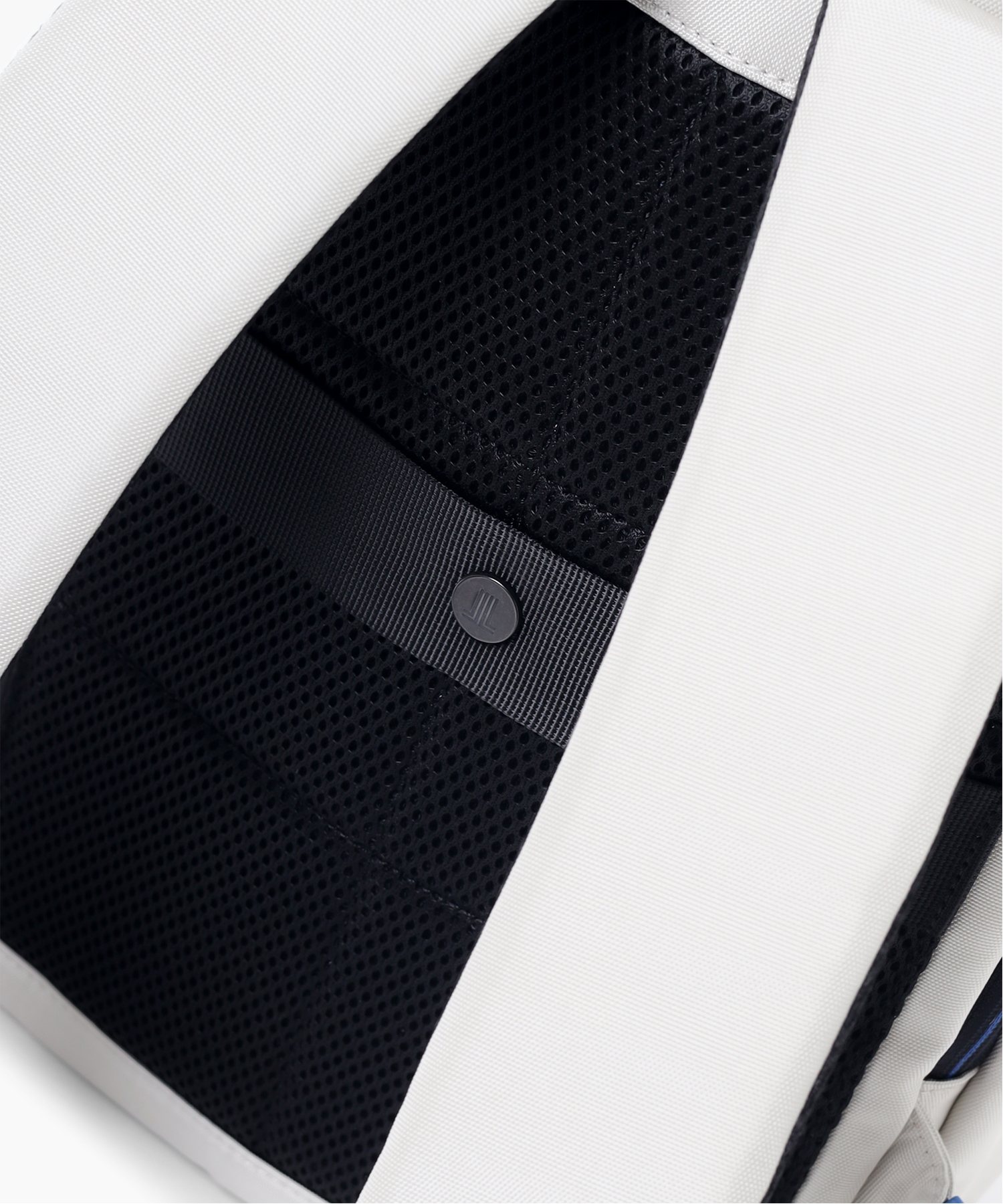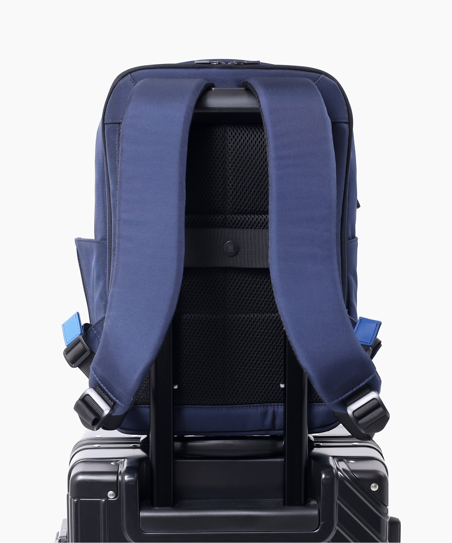 セットアップ機能背面にはセットアップベルトが備わっておりますので、キャリーケースに通すことができ、出張にも最適なリュックです。センター部分にはブランドロゴ入りのボタンが付いていますので、キャリーケースに通さない際はボタンを留めておくことができます。