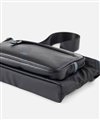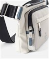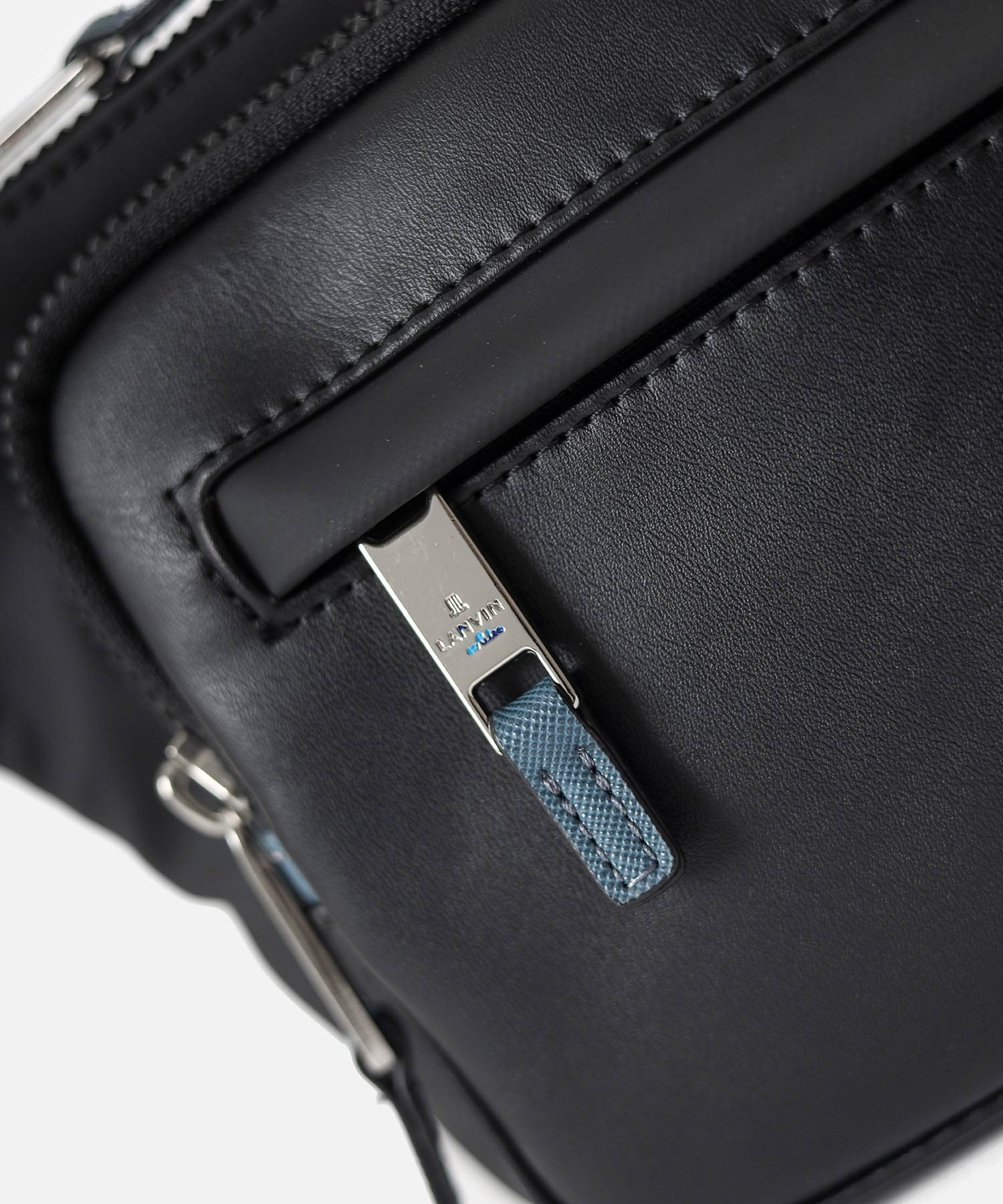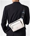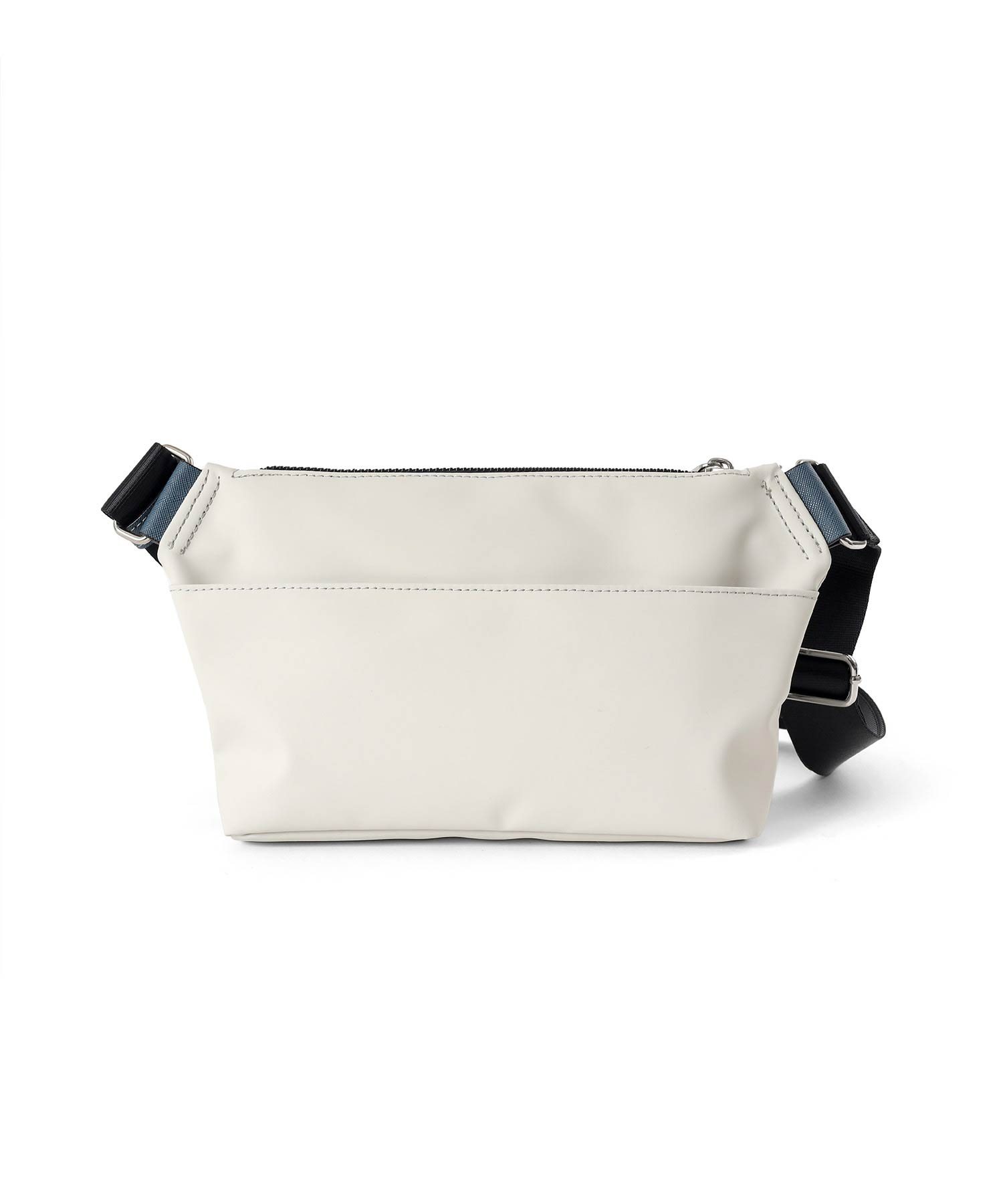 メイン素材には、ゴムライクな質感で高純度のウレタン樹脂を使用しています。耐水性があり表面にキズが付きにくく、特別な製法により揮発性有害物質とCO2排出量を大幅に削減させた環境配慮型ポリウレタンを使用しています。付属で使用している合成皮革は2種類あり、ブルーカラーのポイント使いが特徴的なサフィアーノ型押しの合成皮革(PVC)と、フロントポケット部に使用している合成皮革(PU)です。合計3素材の異素材MIXがランバンオンブルーらしい遊び心のあるカジュアルバッグです。