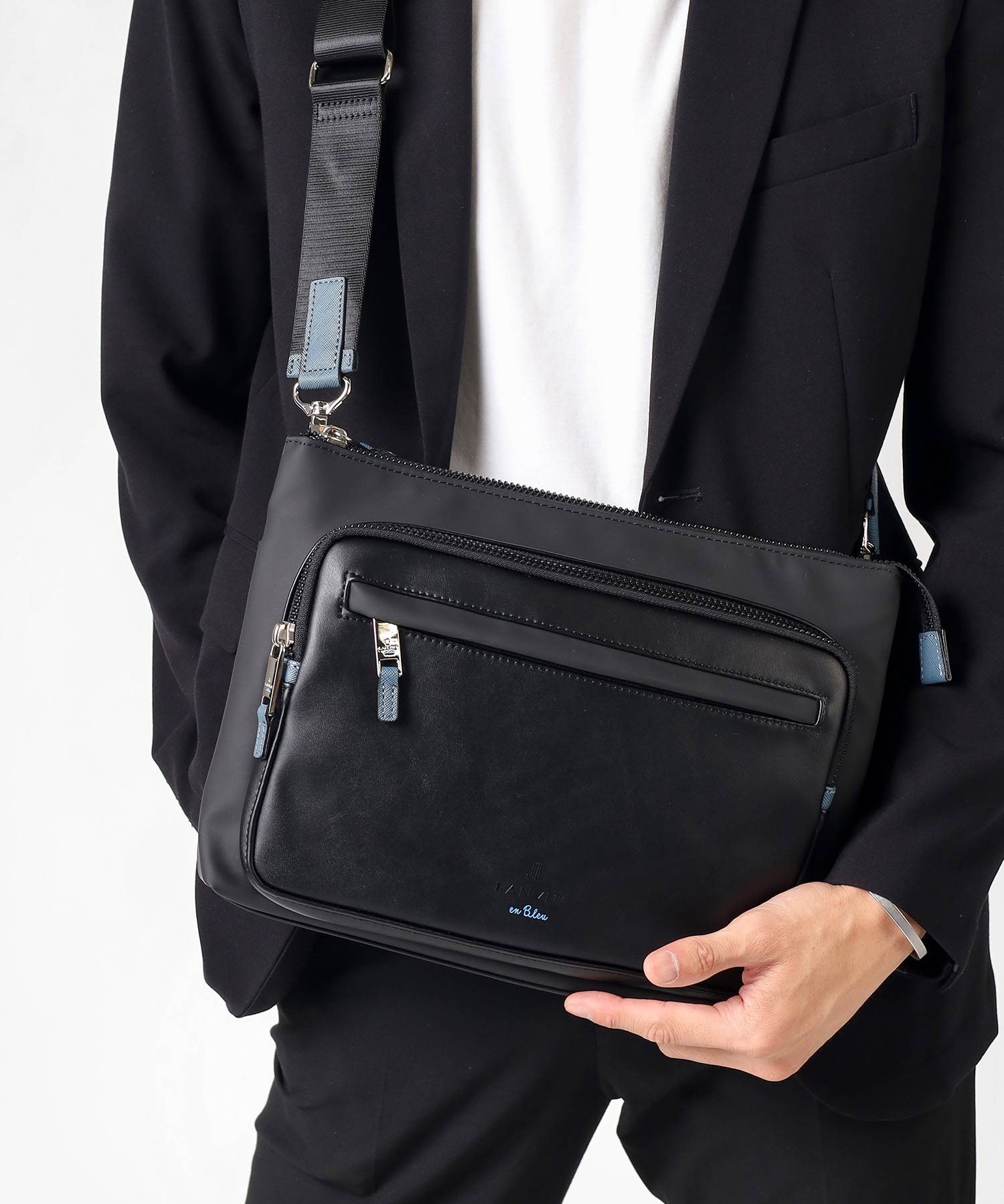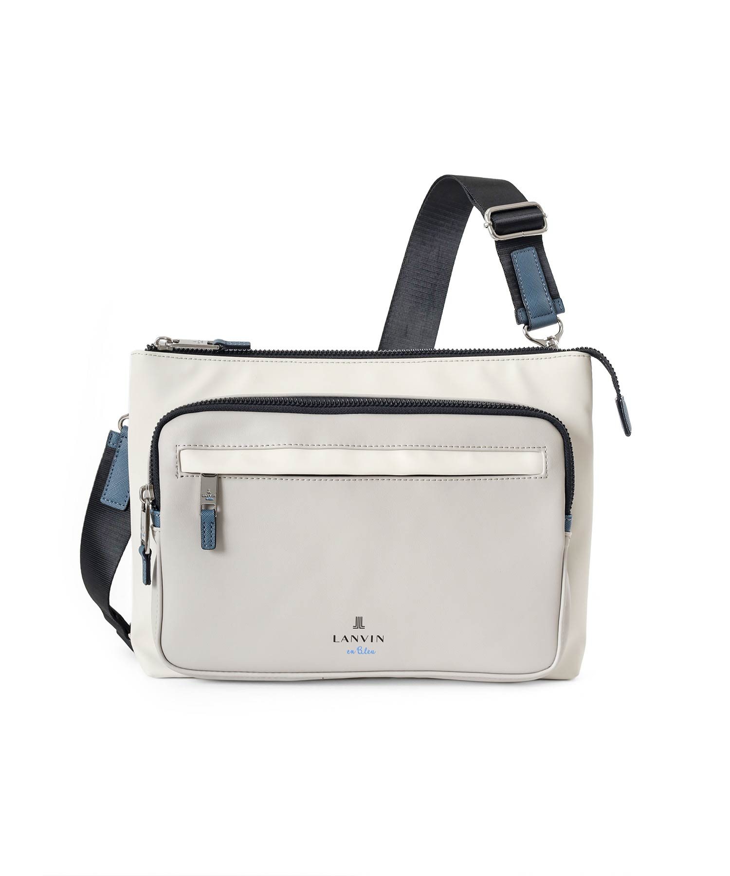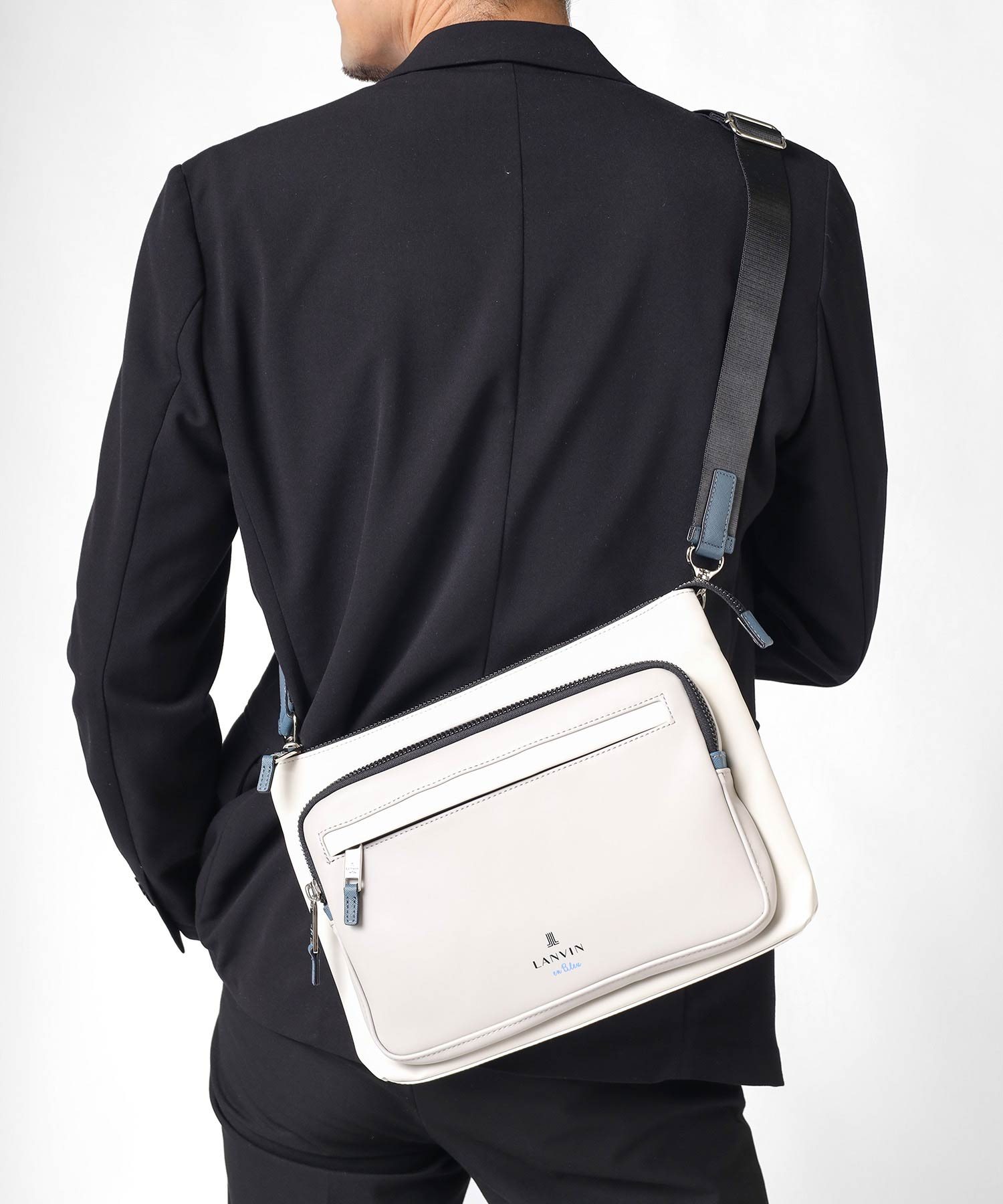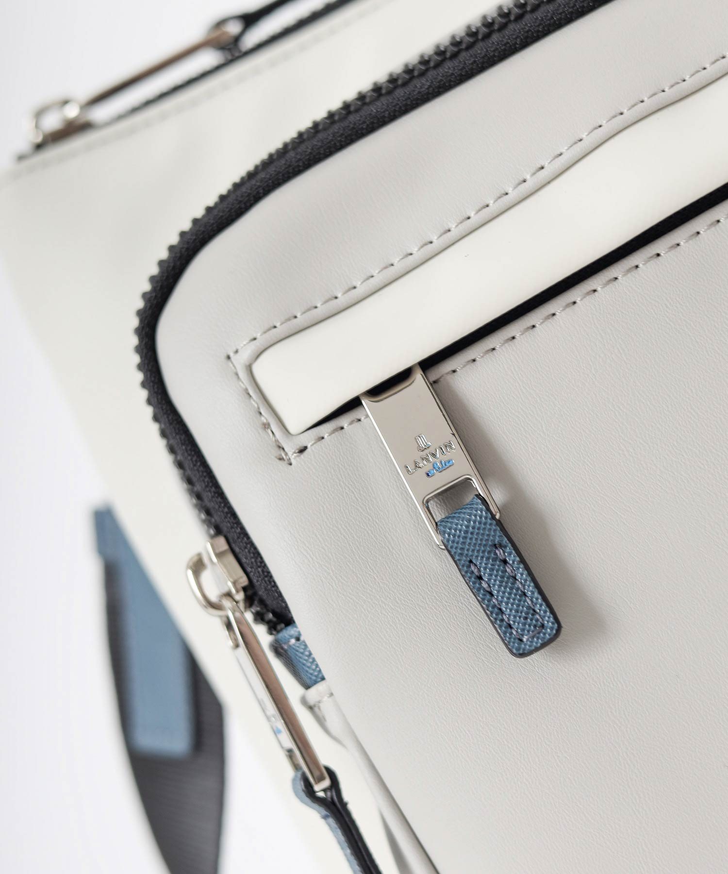 3素材MIXでブランドらしい遊び心を表現したランバンオンブルーのカジュアルB5ショルダーバッグ。ブルーカラーのポイント使いが、シンプルながらもデザインにアクセントを加えています。貴重品や日用品が収まるお出かけにちょうど良いショルダーバッグです。