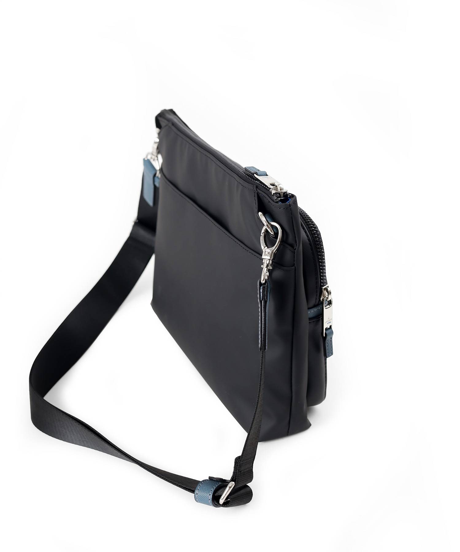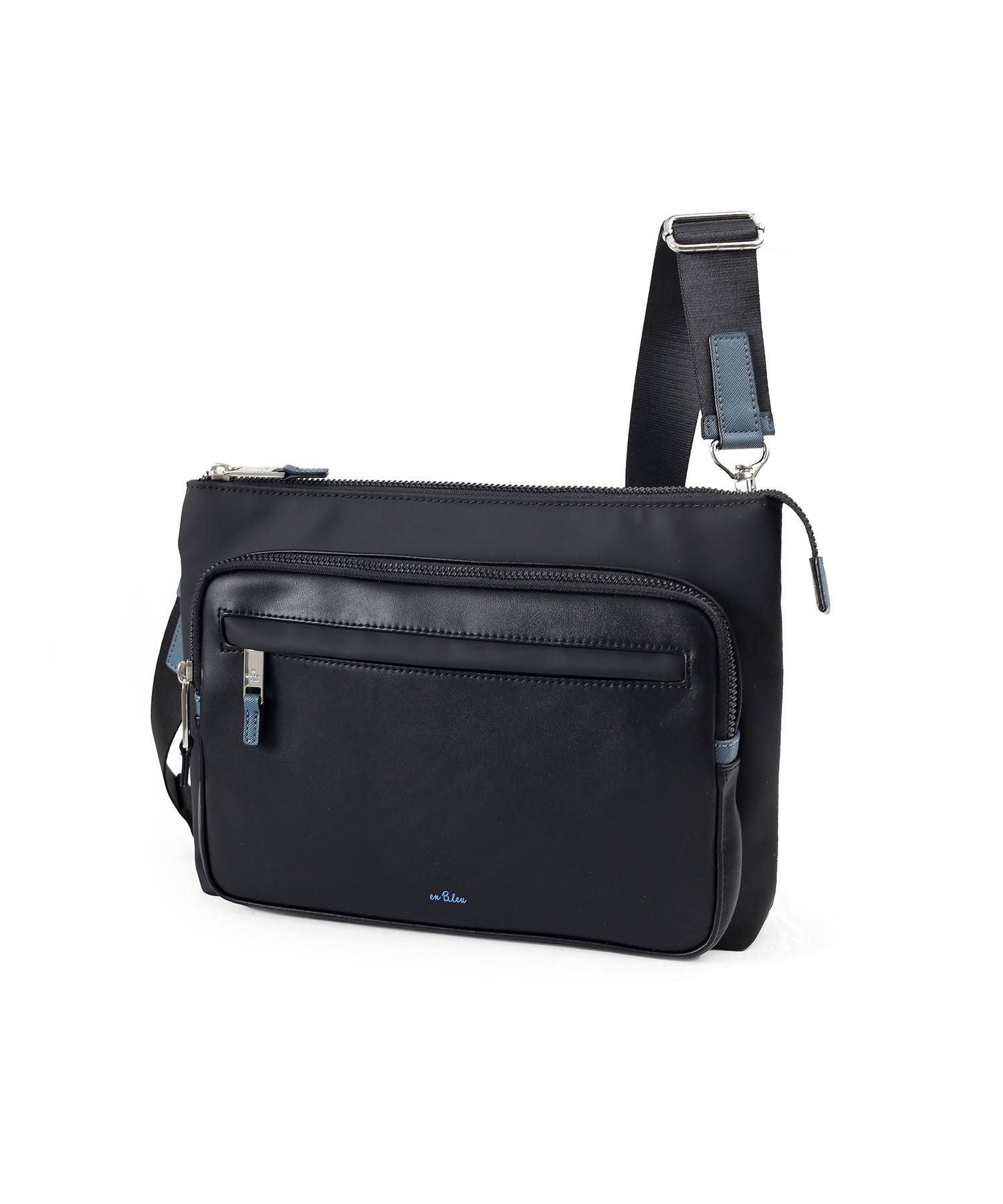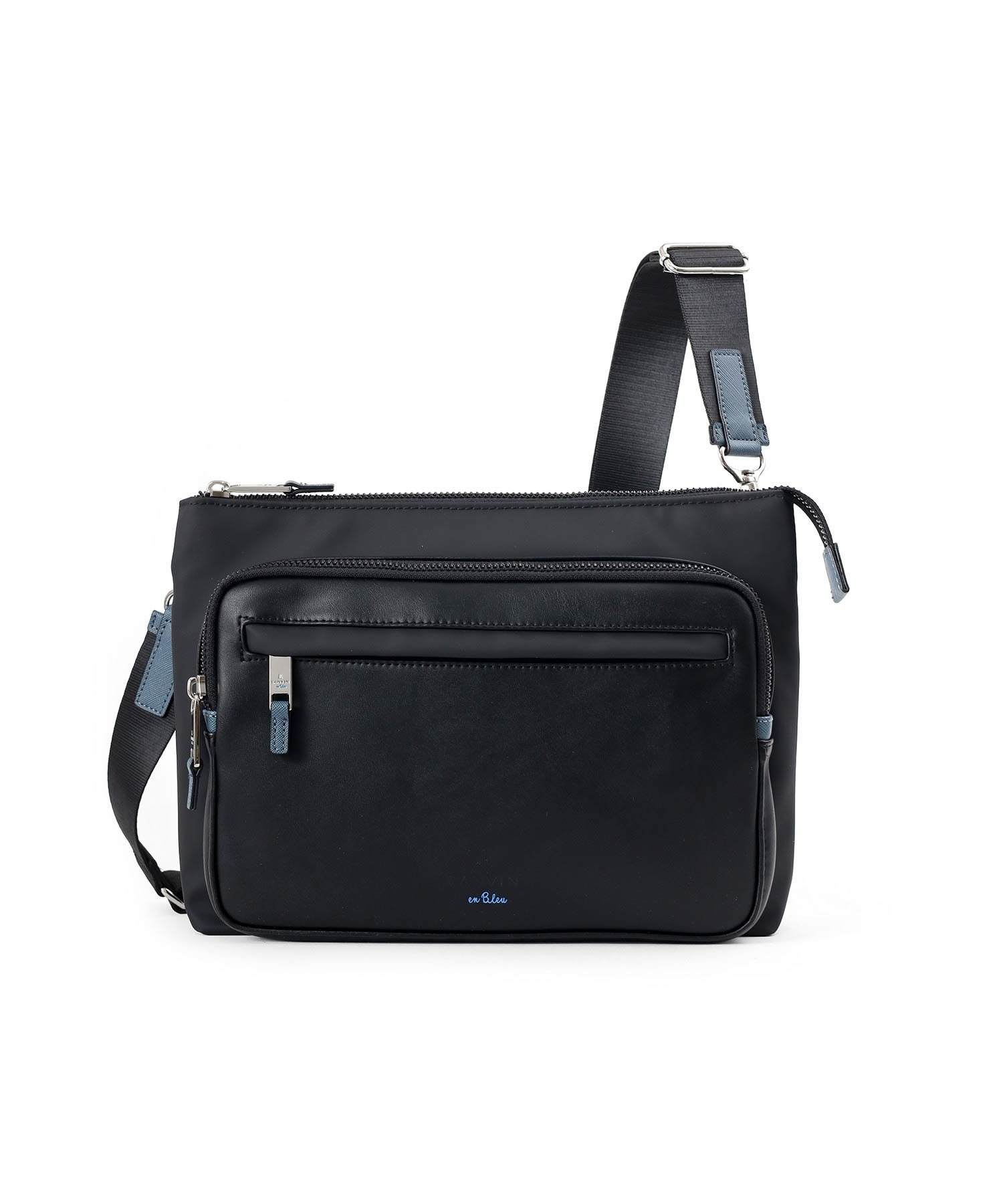 3素材MIXでブランドらしい遊び心を表現したランバンオンブルーのカジュアルB5ショルダーバッグ。ブルーカラーのポイント使いが、シンプルながらもデザインにアクセントを加えています。貴重品や日用品が収まるお出かけにちょうど良いショルダーバッグです。