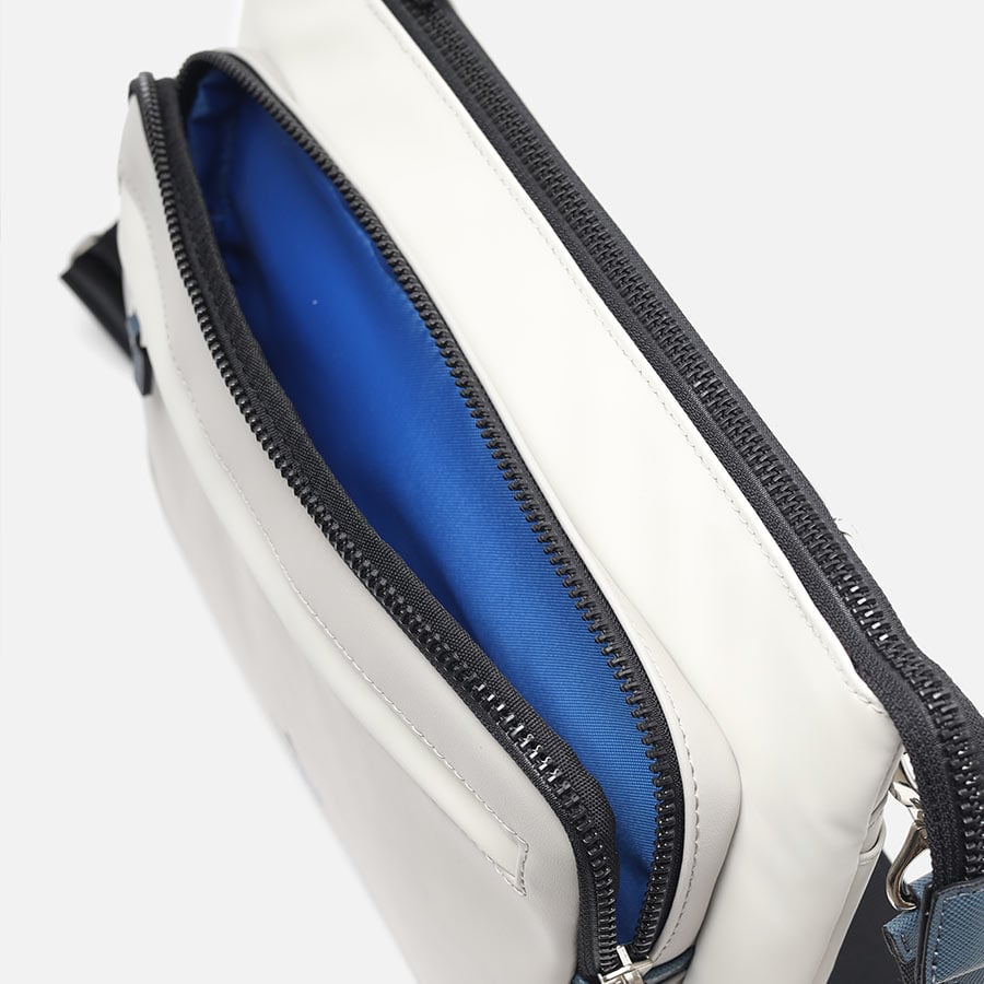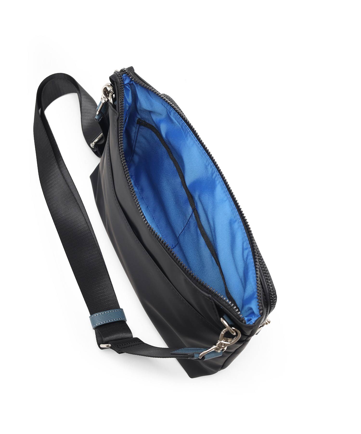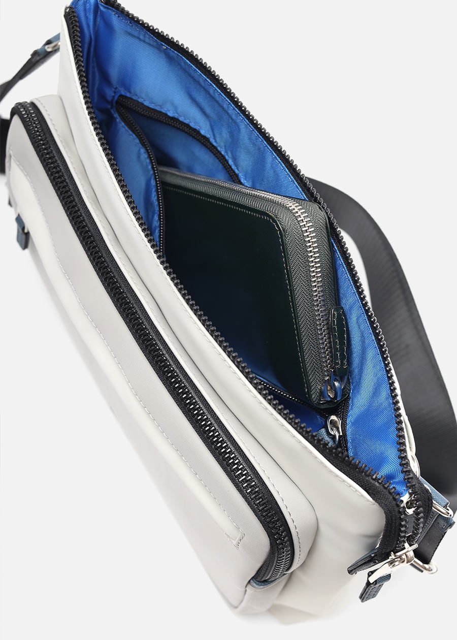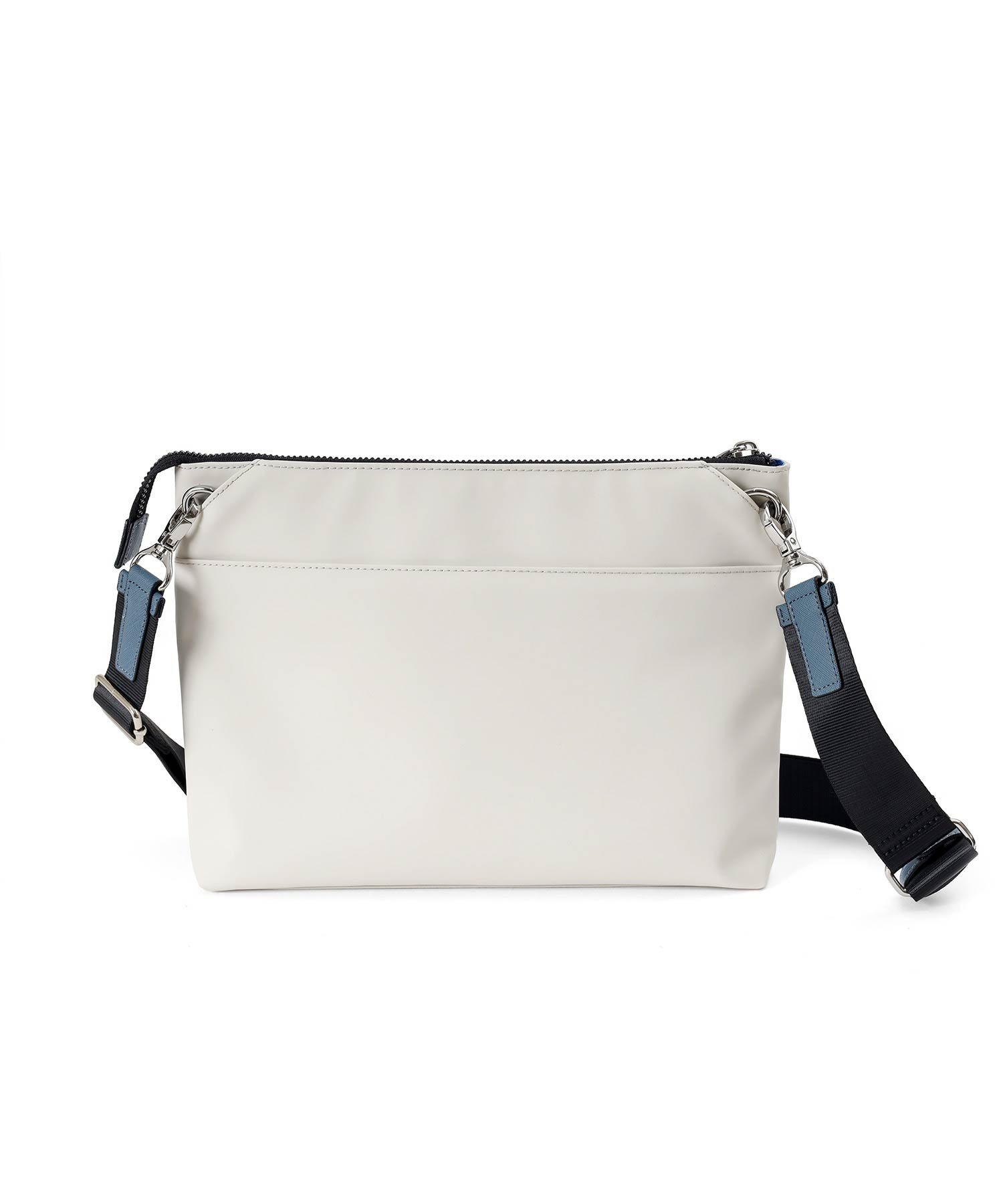 3素材MIXでブランドらしい遊び心を表現したランバンオンブルーのカジュアルB5ショルダーバッグ。ブルーカラーのポイント使いが、シンプルながらもデザインにアクセントを加えています。貴重品や日用品が収まるお出かけにちょうど良いショルダーバッグです。