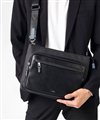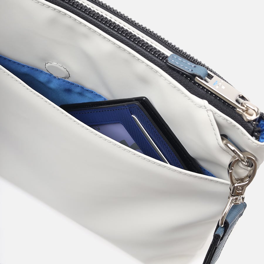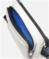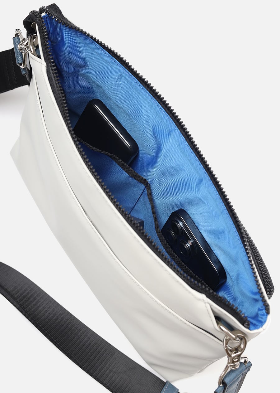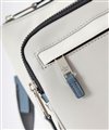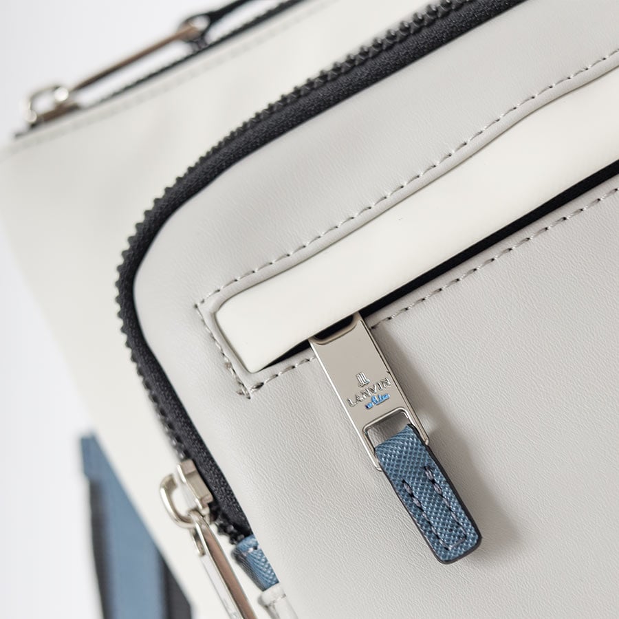 メイン素材には、ゴムライクな質感で高純度のウレタン樹脂を使用しています。耐水性があり表面にキズが付きにくく、特別な製法により揮発性有害物質とCO2排出量を大幅に削減させた環境配慮型ポリウレタンを使用しています。付属で使用している合成皮革は2種類あり、ブルーカラーのポイント使いが特徴的なサフィアーノ型押しの合成皮革(PVC)と、フロントポケット部に使用している合成皮革(PU)です。合計3素材の異素材MIXがランバンオンブルーらしい遊び心のあるカジュアルバッグです。