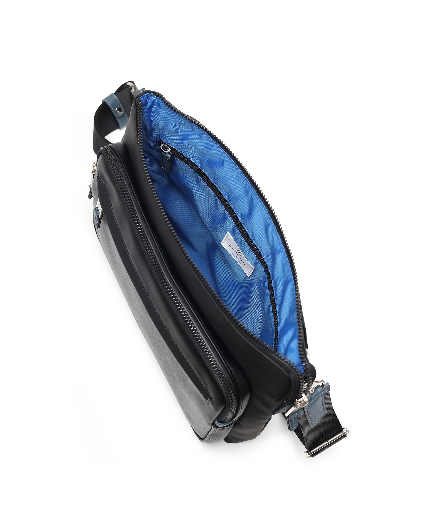 3素材MIXでブランドらしい遊び心を表現したランバンオンブルーのカジュアルB5ショルダーバッグ。ブルーカラーのポイント使いが、シンプルながらもデザインにアクセントを加えています。上品さもある素材感で、カジュアル・ジャケパンどちらのスタイルにもお使いいただけます。貴重品や日用品が収まるお出かけにちょうど良いショルダーバッグです。