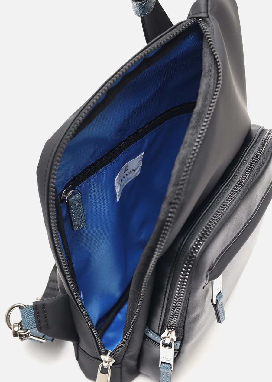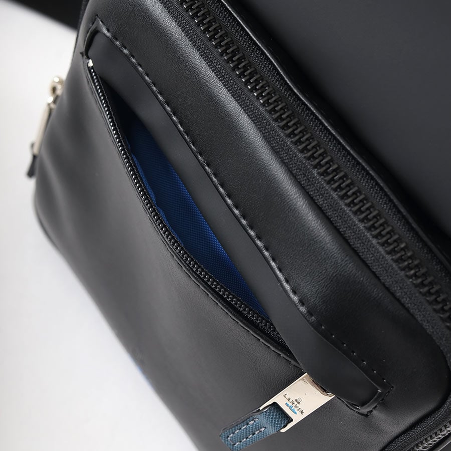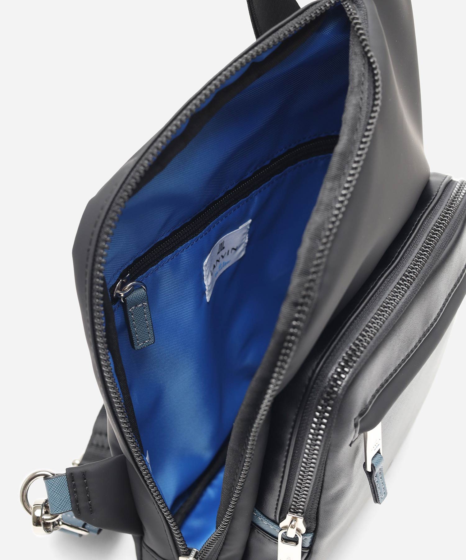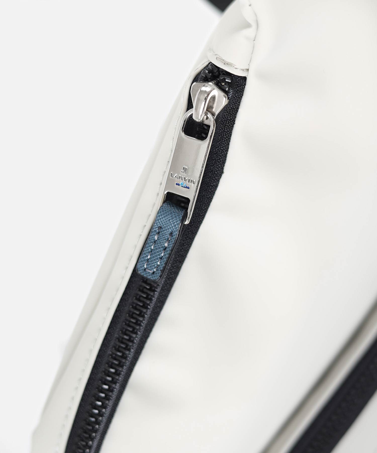メイン素材には、ゴムライクな質感で高純度のウレタン樹脂を使用しています。耐水性があり表面にキズが付きにくく、特別な製法により揮発性有害物質とCO2排出量を大幅に削減させた環境配慮型ポリウレタンを使用しています。付属で使用している合成皮革は2種類あり、ブルーカラーのポイント使いが特徴的なサフィアーノ型押しの合成皮革(PVC)と、フロントポケット部に使用している合成皮革(PU)です。合計3素材の異素材MIXがランバンオンブルーらしい遊び心のあるカジュアルバッグです。