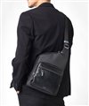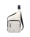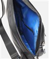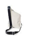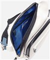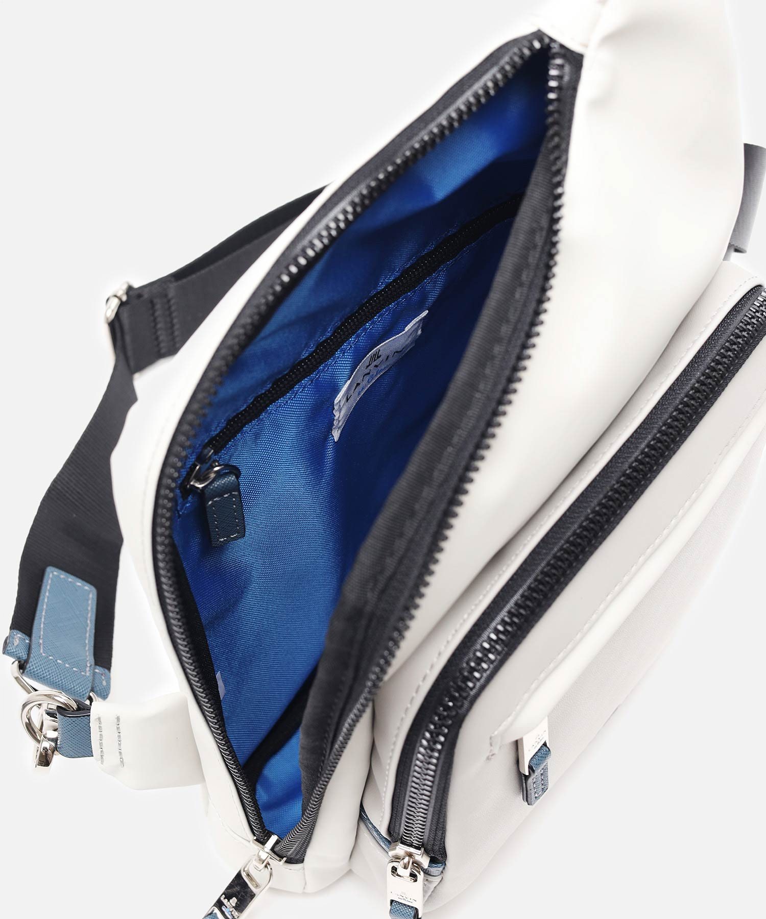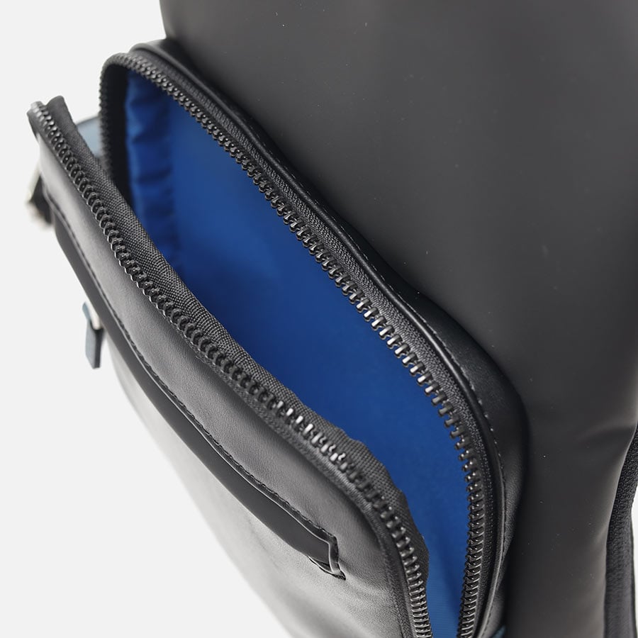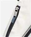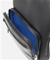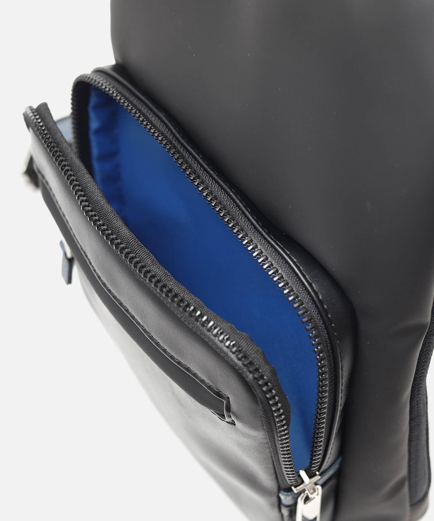 メイン素材には、ゴムライクな質感で高純度のウレタン樹脂を使用しています。耐水性があり表面にキズが付きにくく、特別な製法により揮発性有害物質とCO2排出量を大幅に削減させた環境配慮型ポリウレタンを使用しています。付属で使用している合成皮革は2種類あり、ブルーカラーのポイント使いが特徴的なサフィアーノ型押しの合成皮革(PVC)と、フロントポケット部に使用している合成皮革(PU)です。合計3素材の異素材MIXがランバンオンブルーらしい遊び心のあるカジュアルバッグです。