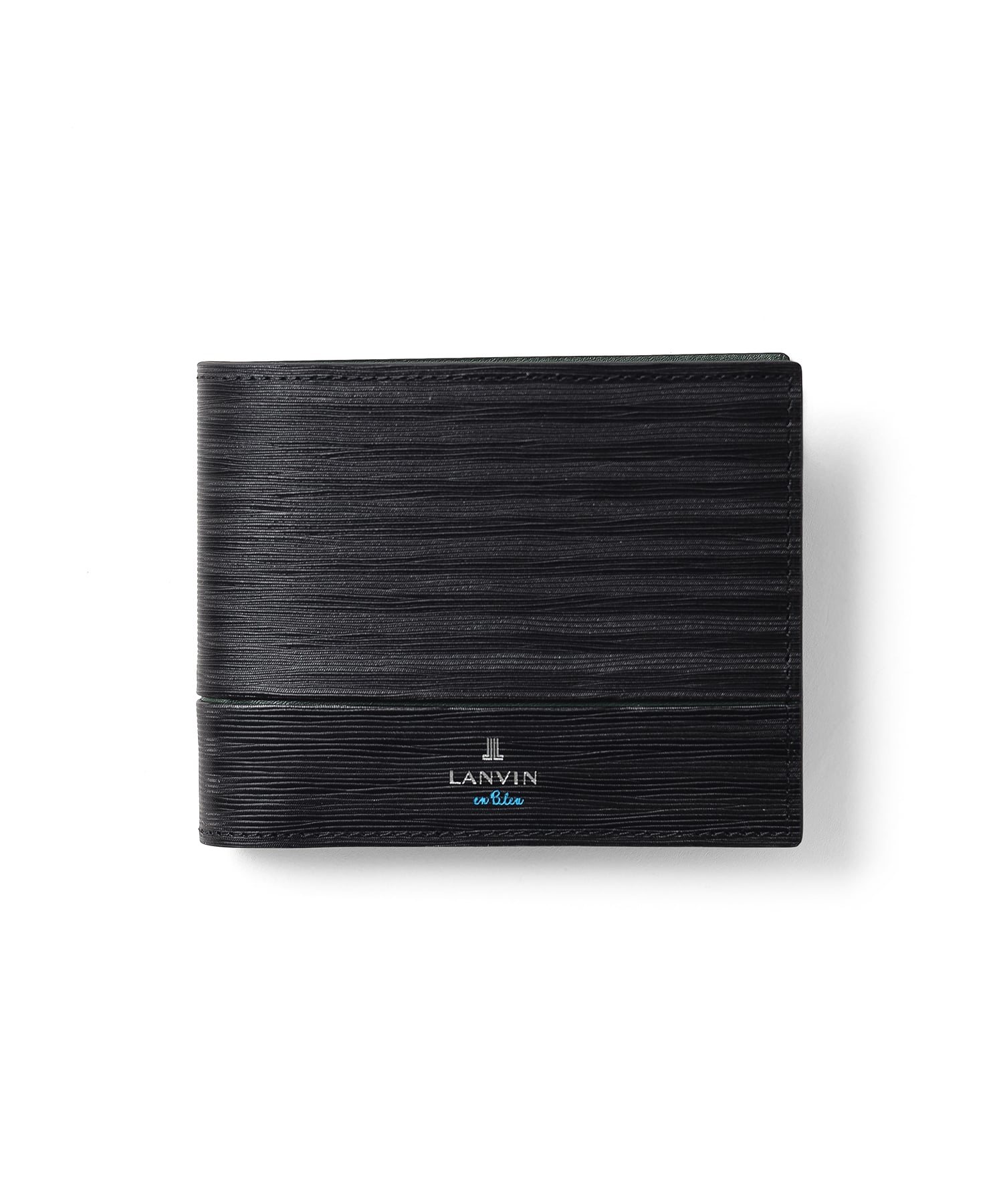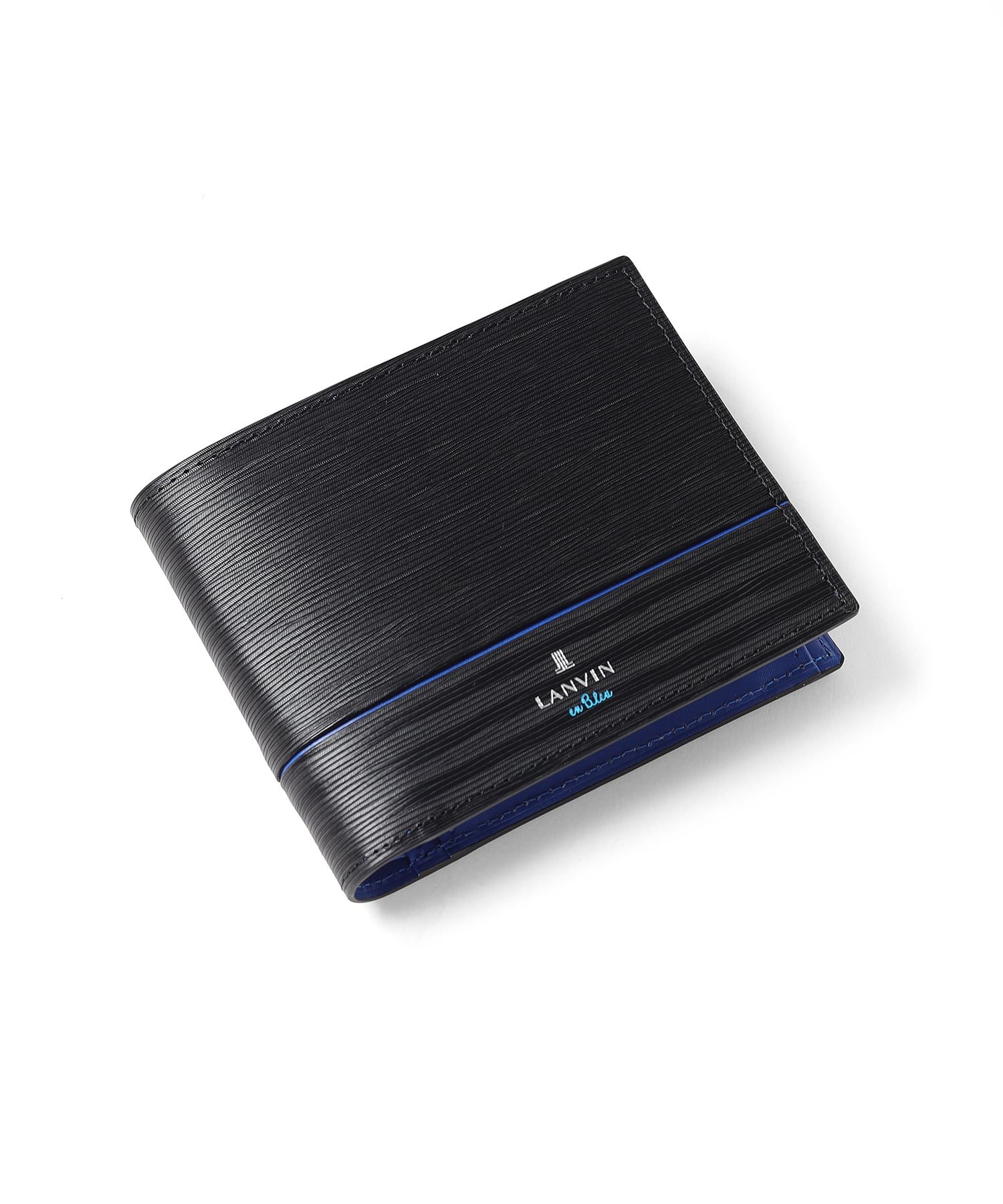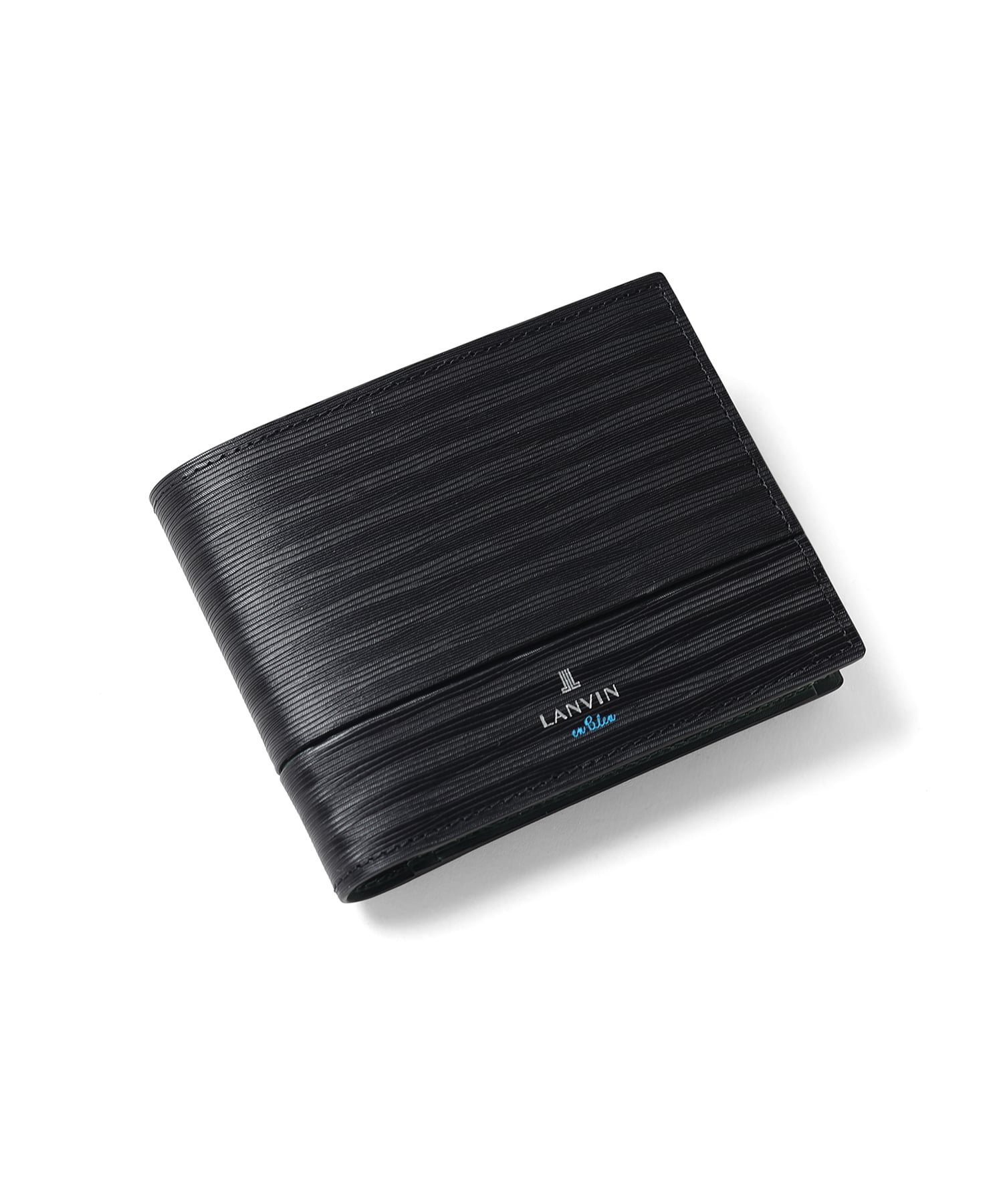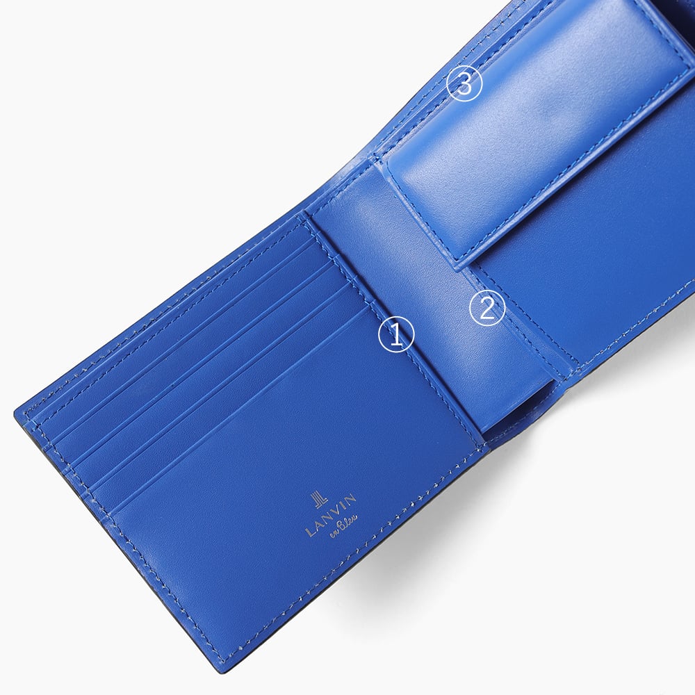 ポイントのラインカラーと、見る角度によって模様が浮かび上がる、深みあるデザインに仕上げたランバンオンブルーの二つ折り財布です。内装は、ラインカラーに合わせたバイカラー仕様になっております。