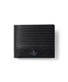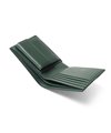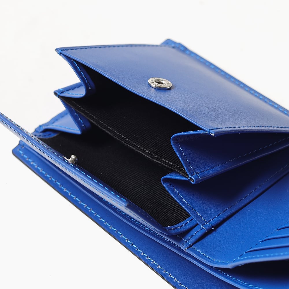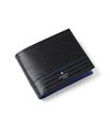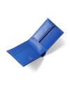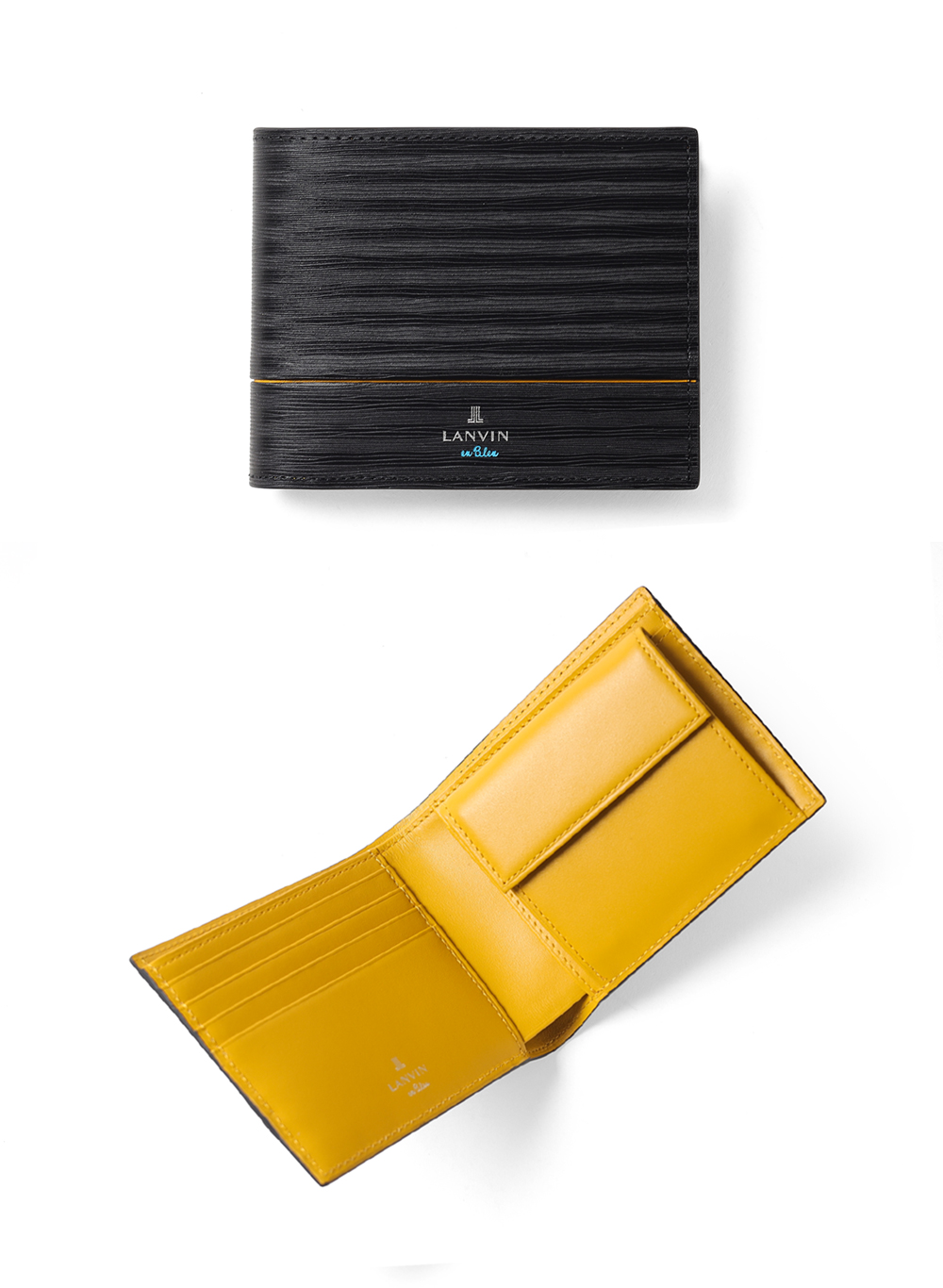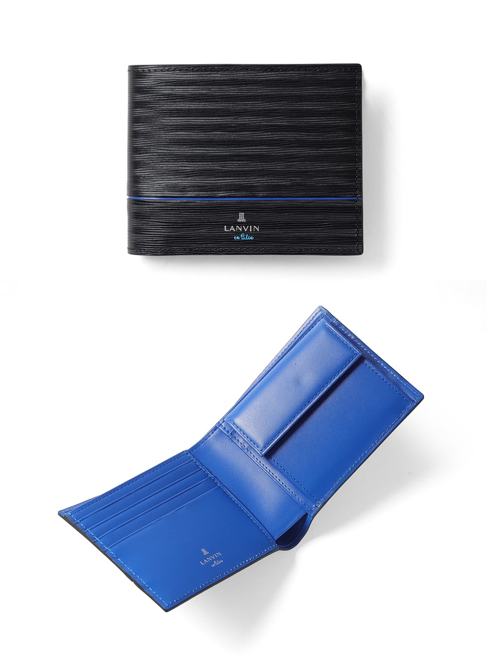 ポイントのラインカラーと、見る角度によって模様が浮かび上がる、深みあるデザインに仕上げたランバンオンブルーの二つ折り財布です。内装は、ラインカラーに合わせたバイカラー仕様になっております。