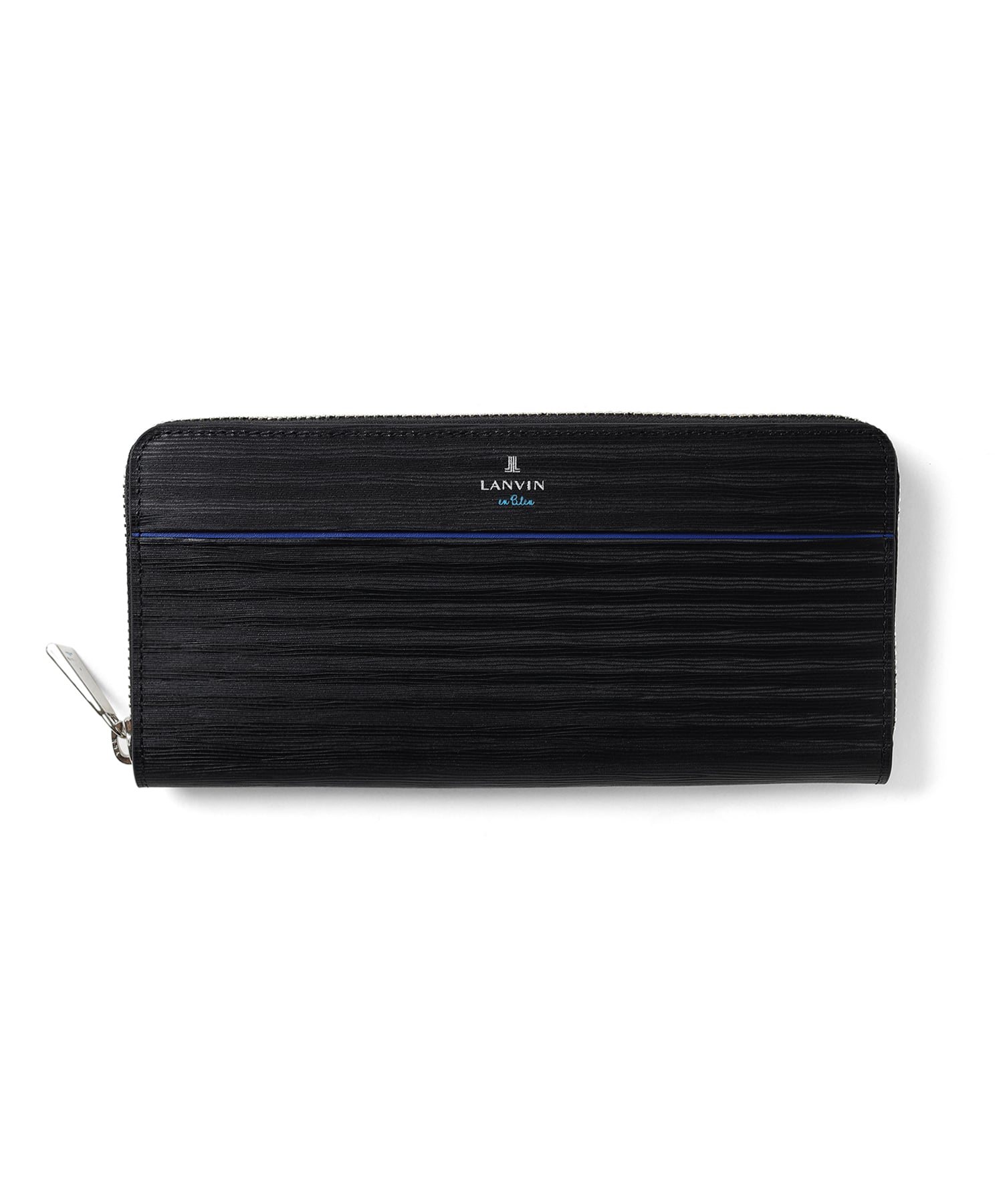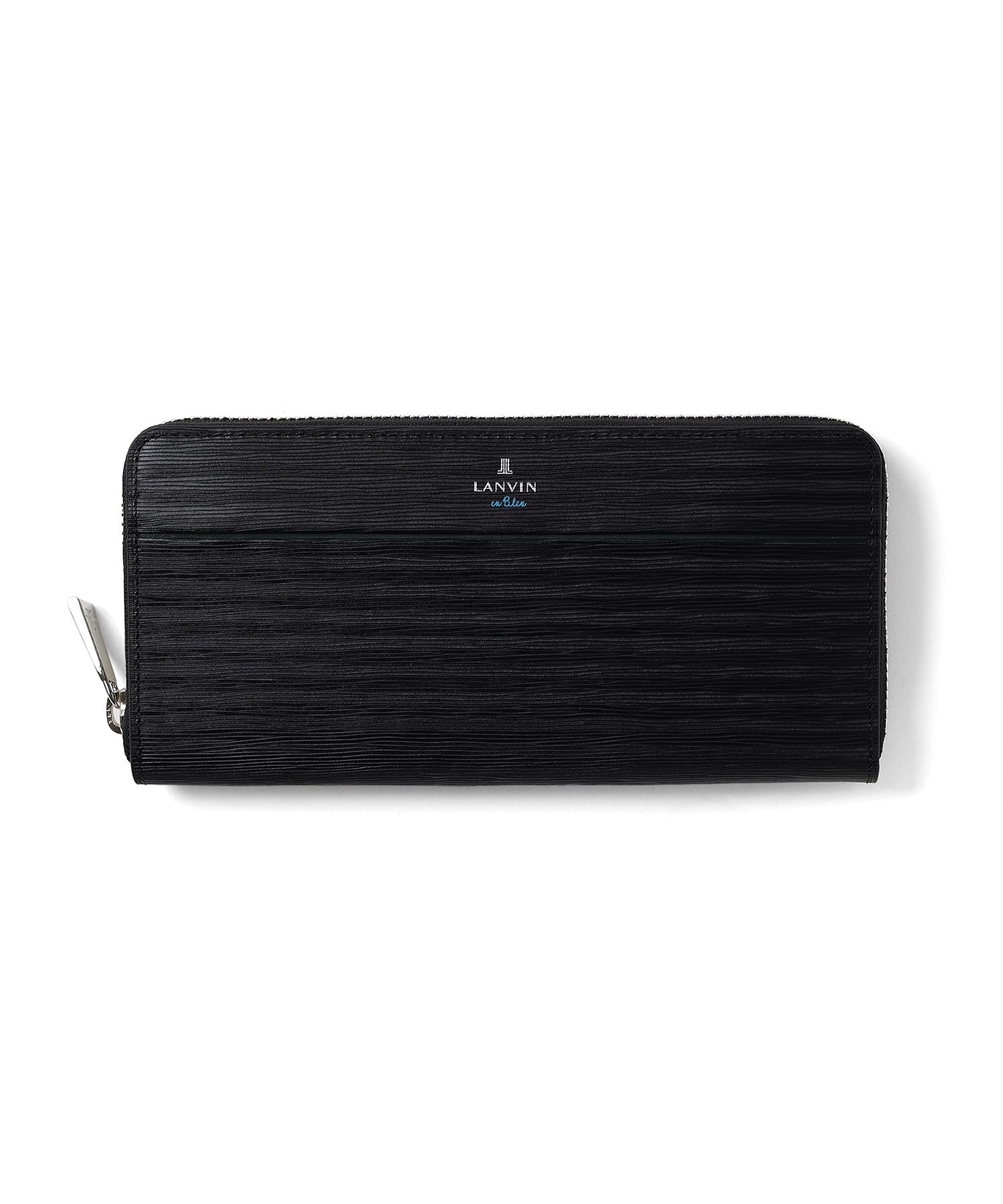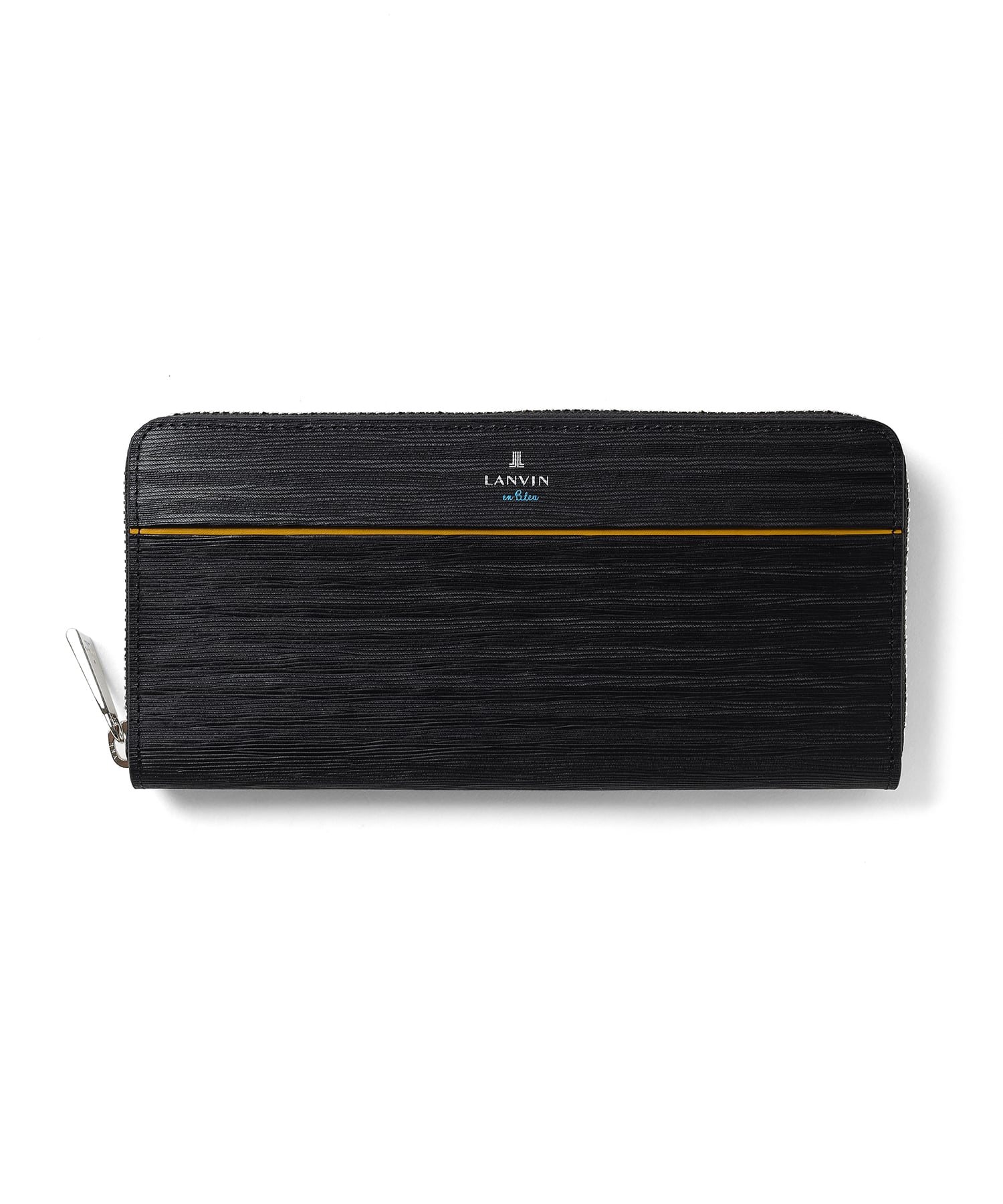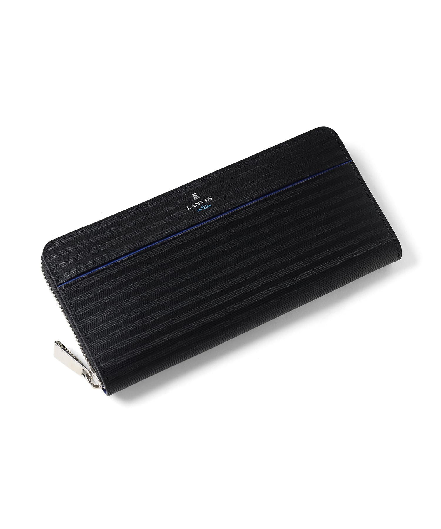 ポイントのラインカラーと、見る角度によって模様が浮かび上がる、深みあるデザインに仕上げたランバンオンブルーのラウンドファスナー型長財布です。内装は、ラインカラーに合わせたバイカラー仕様になっております。
