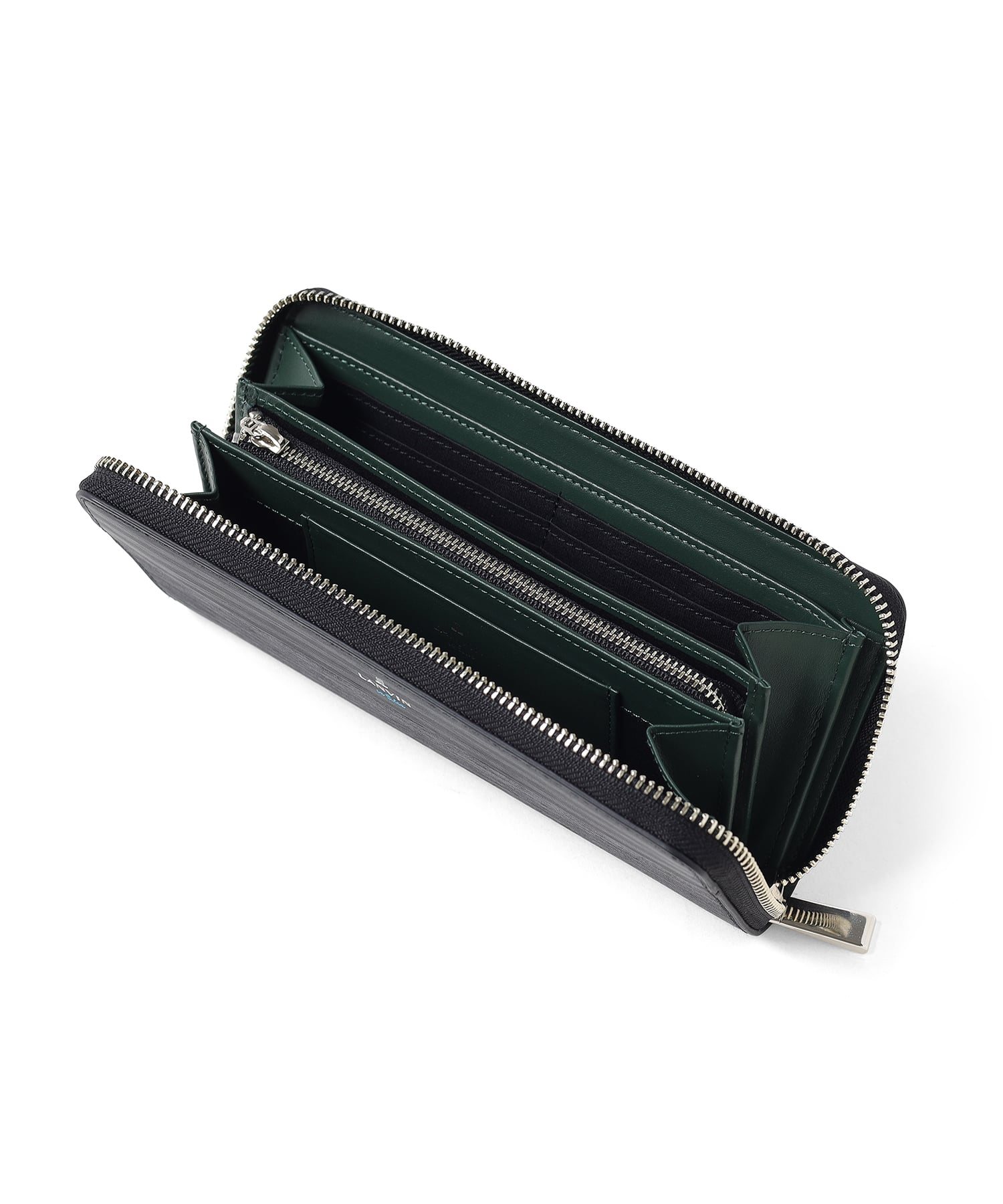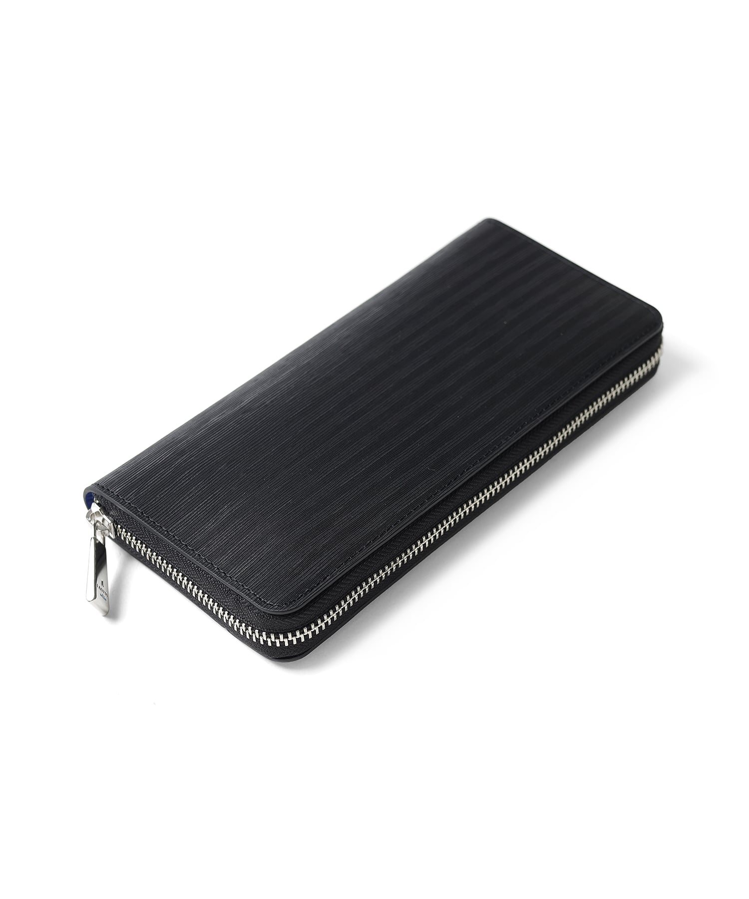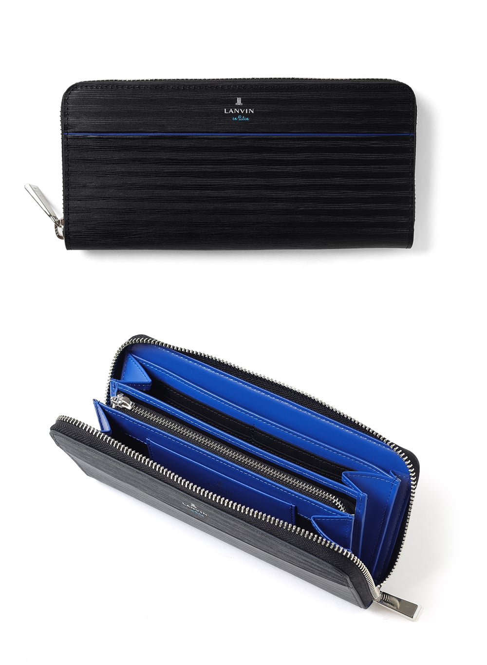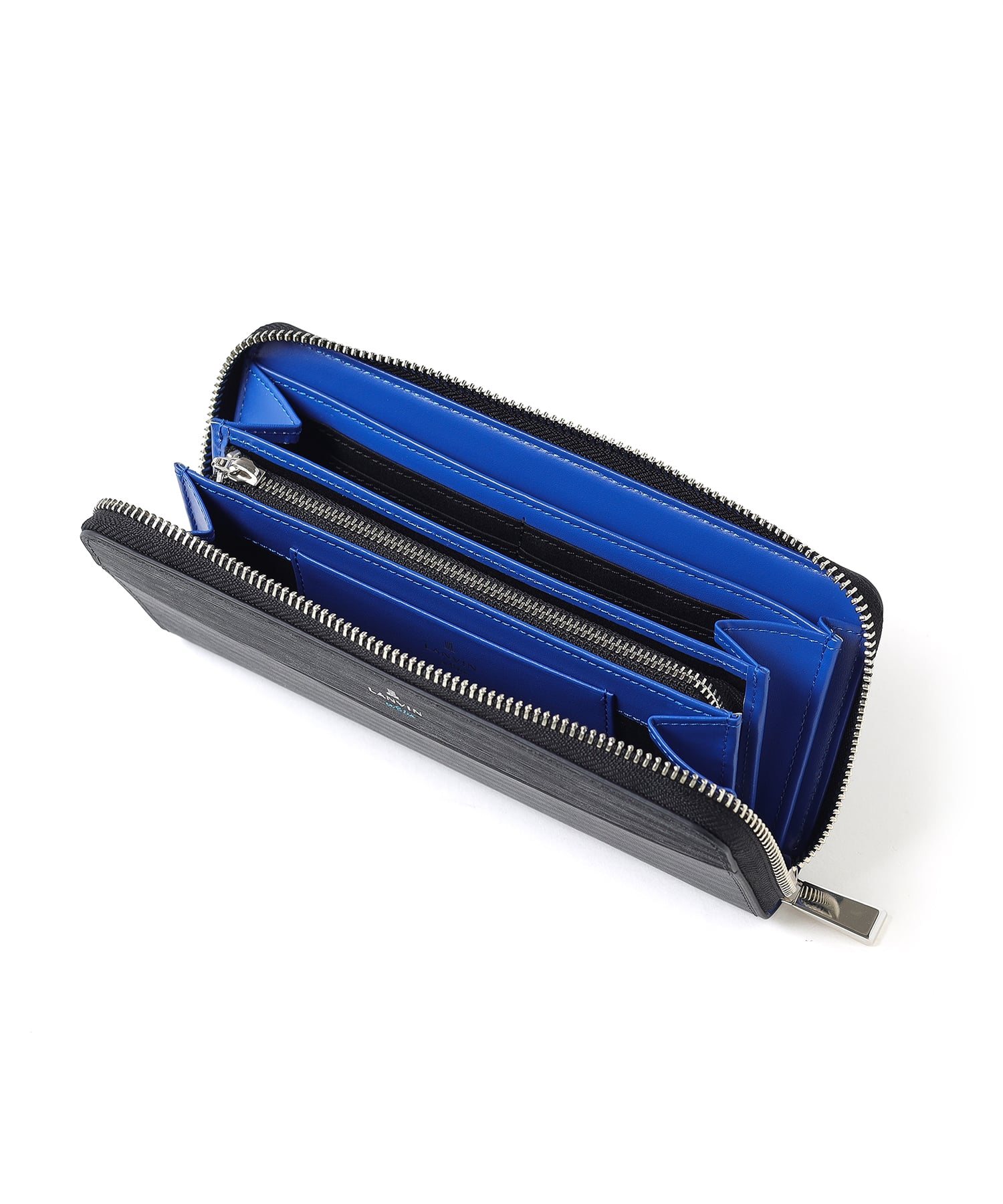 ポイントのラインカラーと、見る角度によって模様が浮かび上がる、深みあるデザインに仕上げたランバンオンブルーのラウンドファスナー型長財布です。内装は、ラインカラーに合わせたバイカラー仕様になっております。