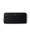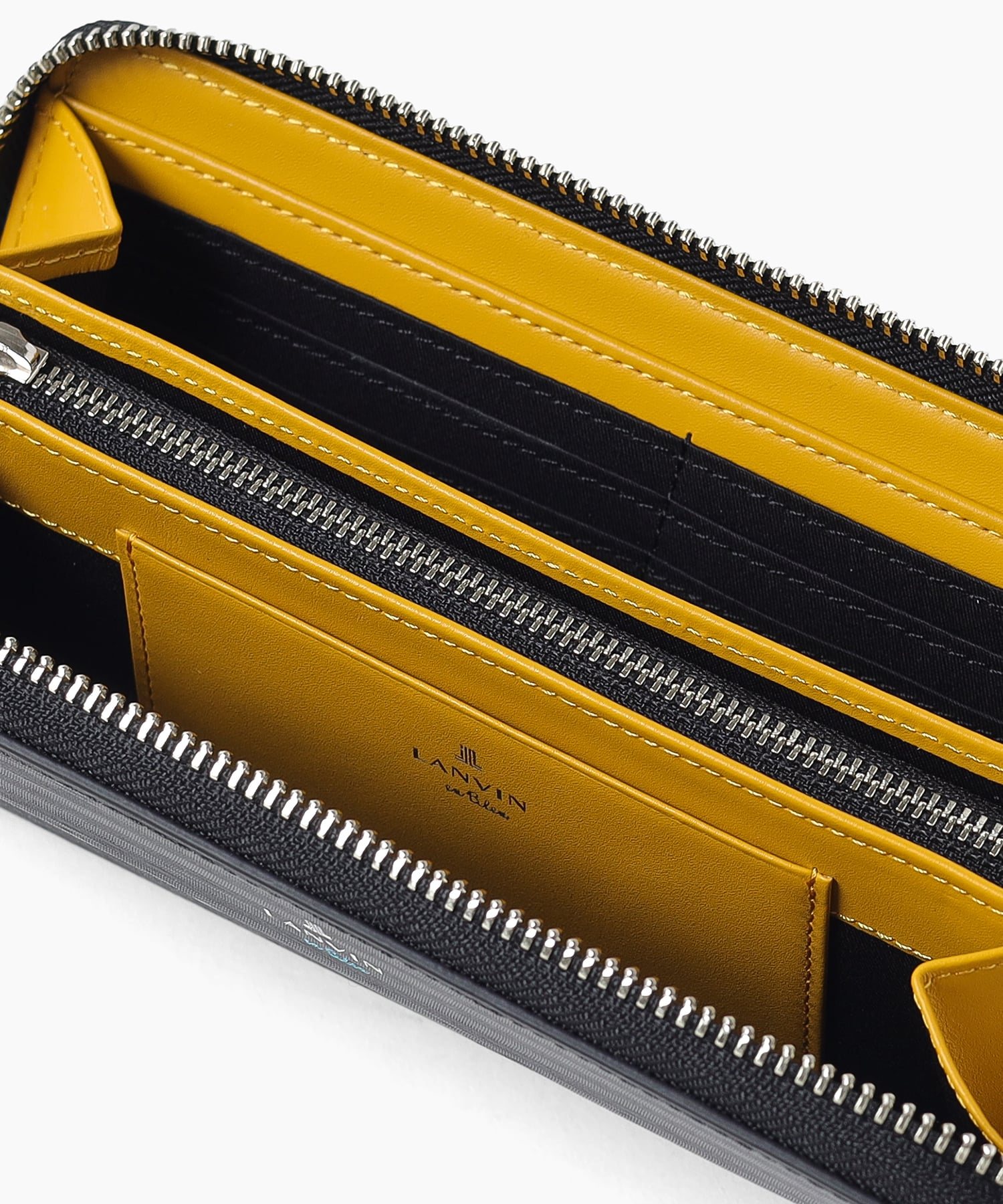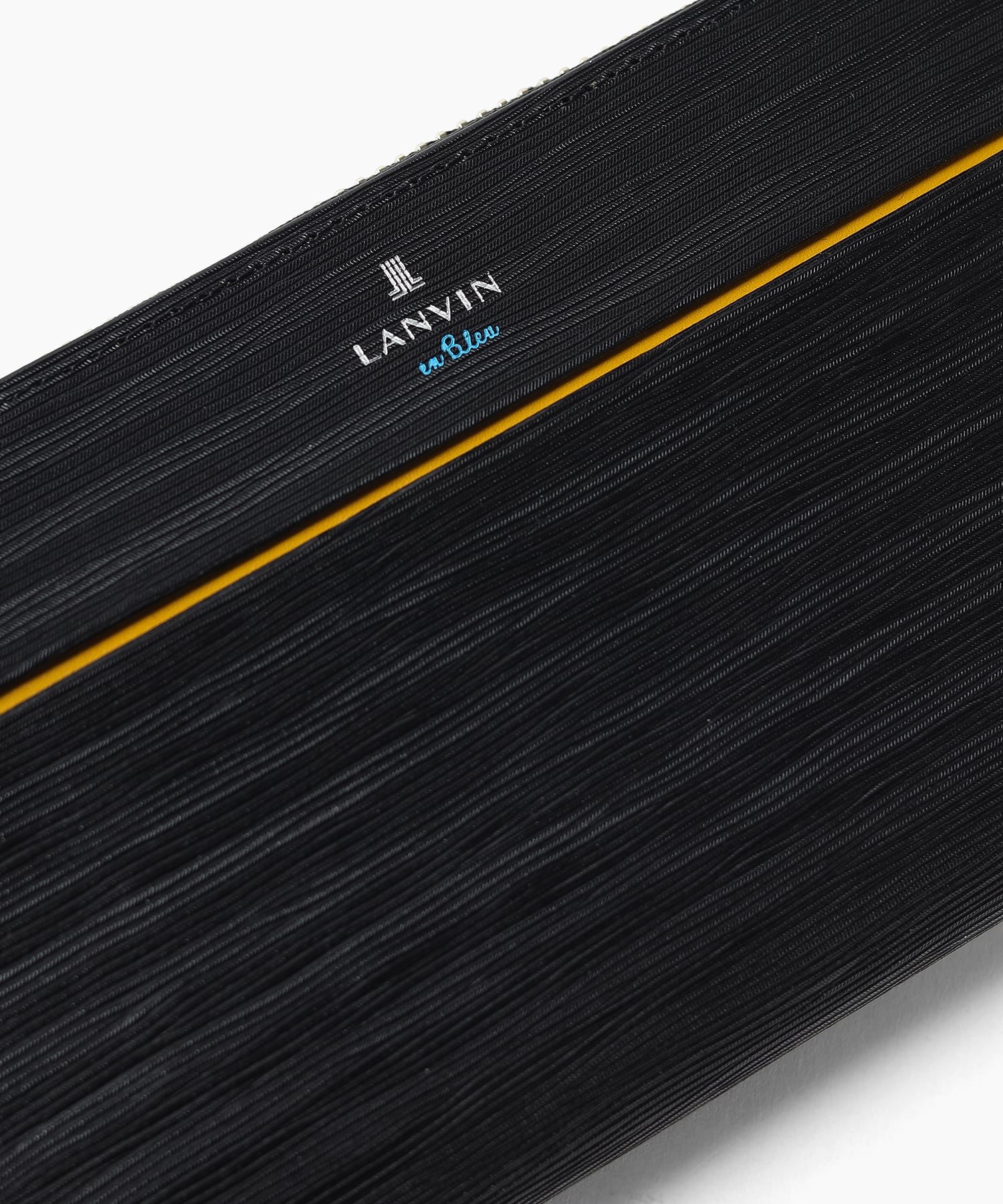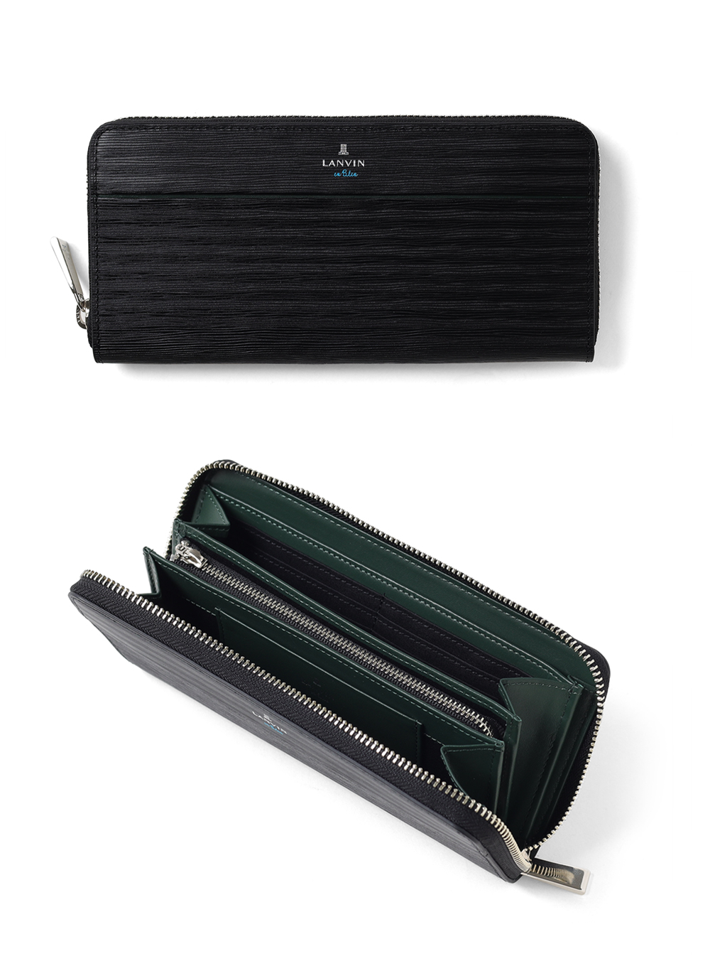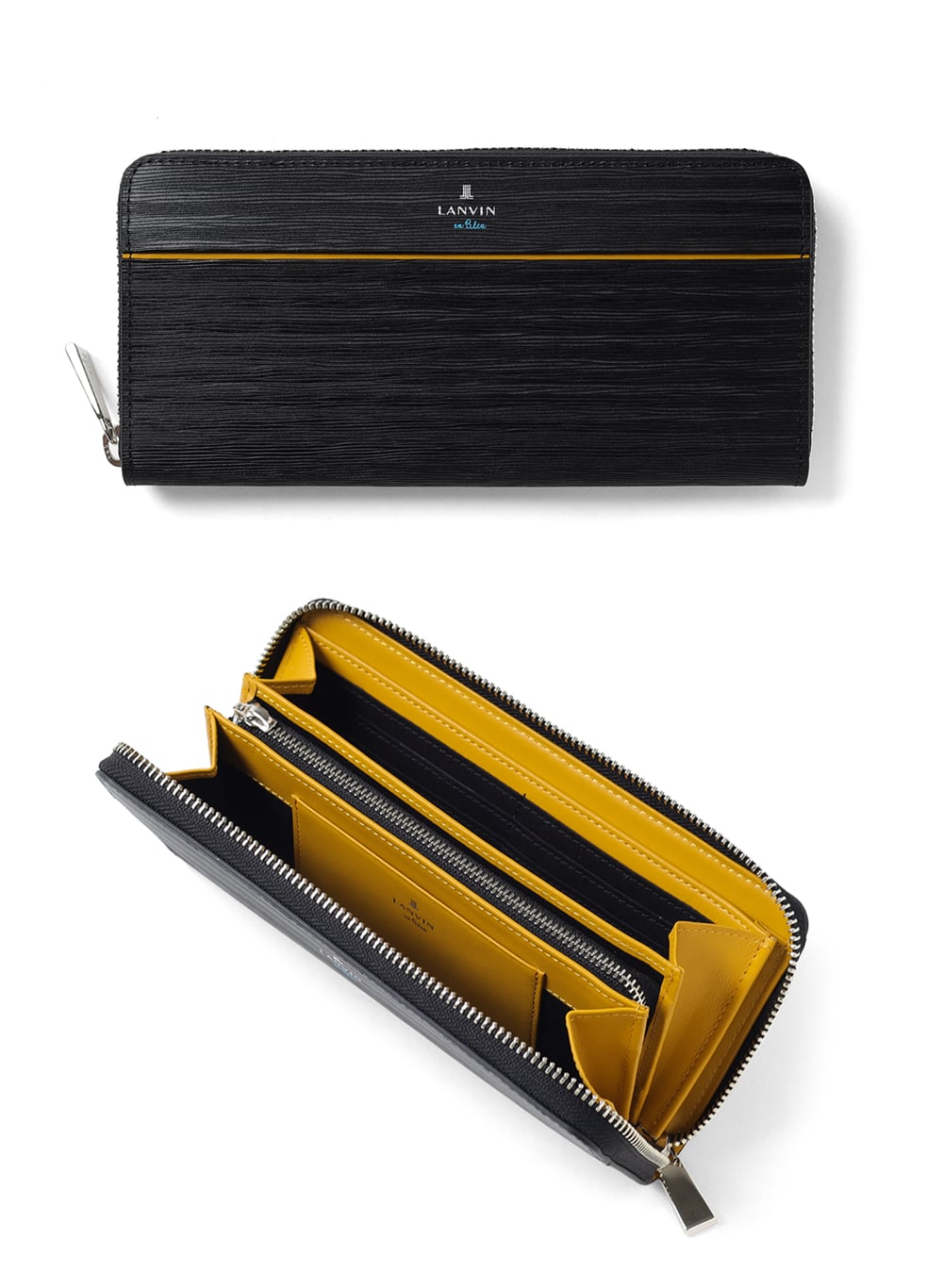 ポイントのラインカラーと、見る角度によって模様が浮かび上がる、深みあるデザインに仕上げたランバンオンブルーのラウンドファスナー型長財布です。内装は、ラインカラーに合わせたバイカラー仕様になっております。