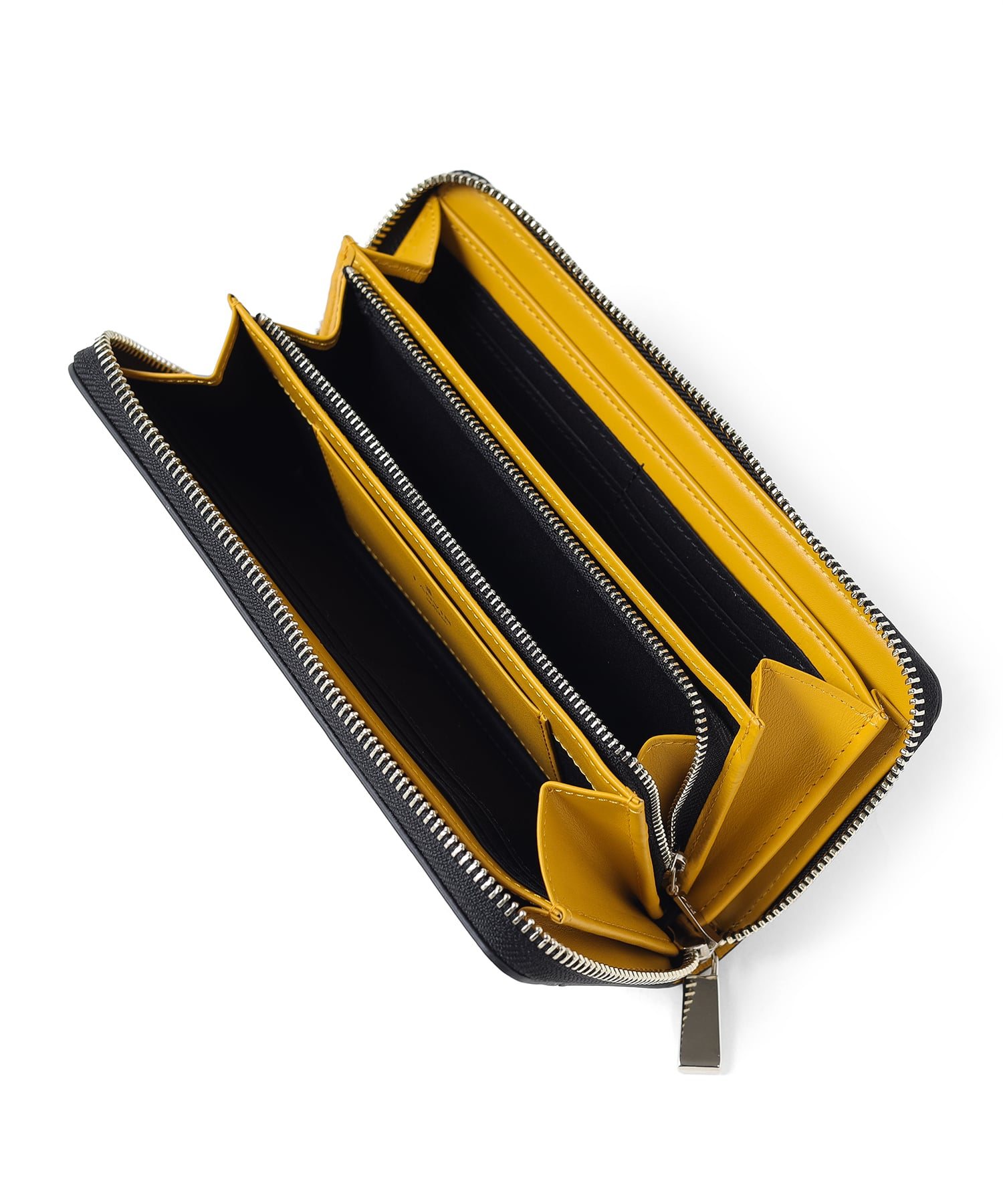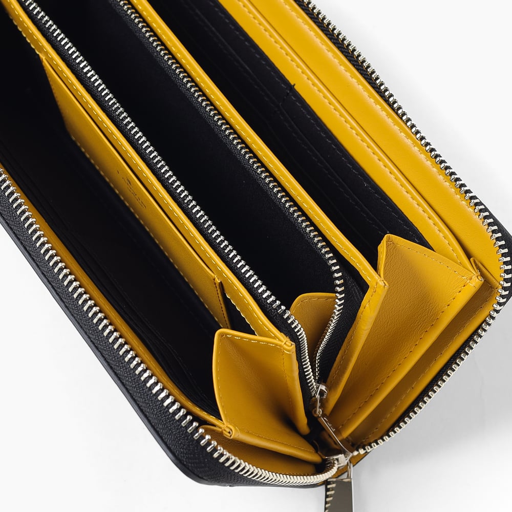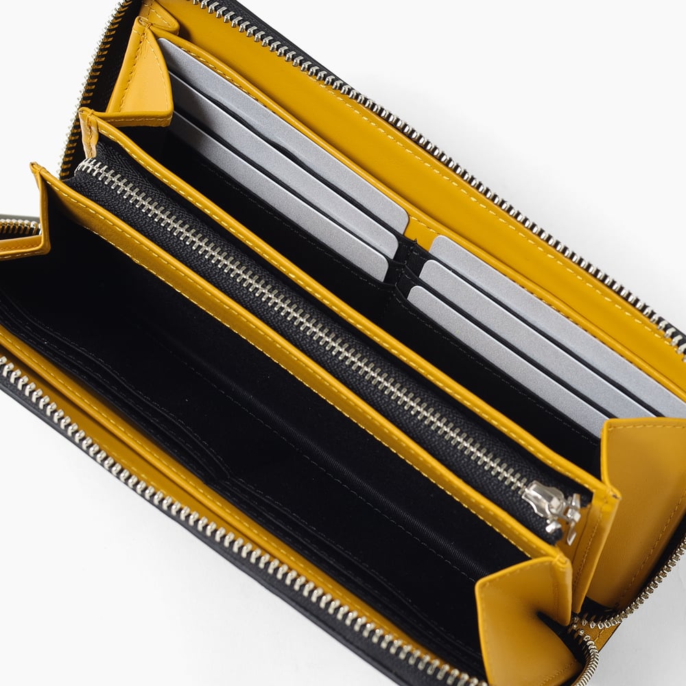 エンボス加工を施した牛革を使用しており、傷が付きにくい素材感となっています。メインカラーのクロにポイント使いしたラインカラーが手元を彩ってくれます。また、内装にはポイントカラーと同色に仕上げております。