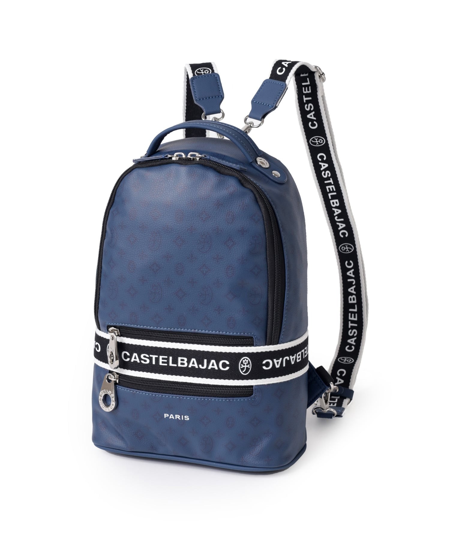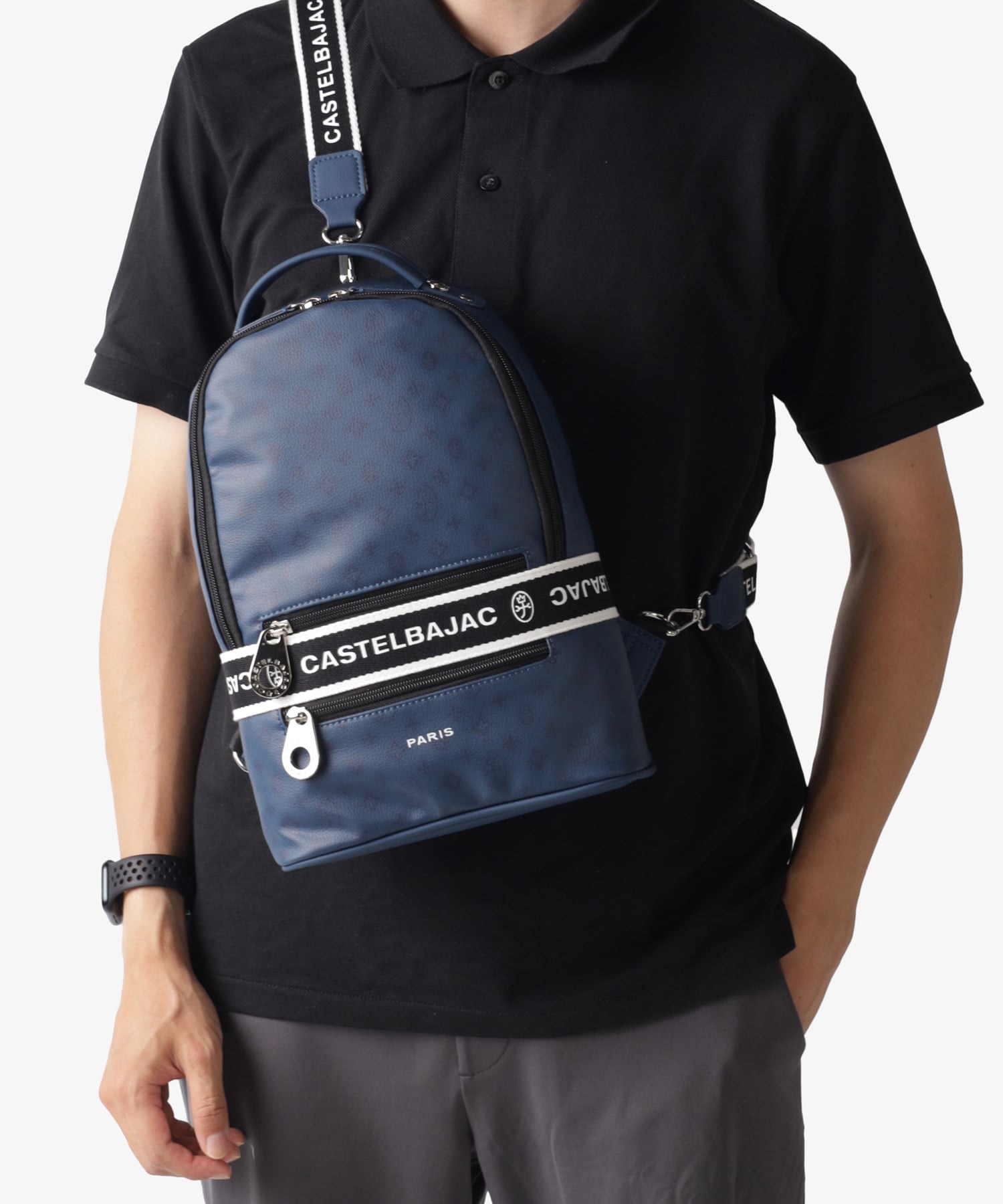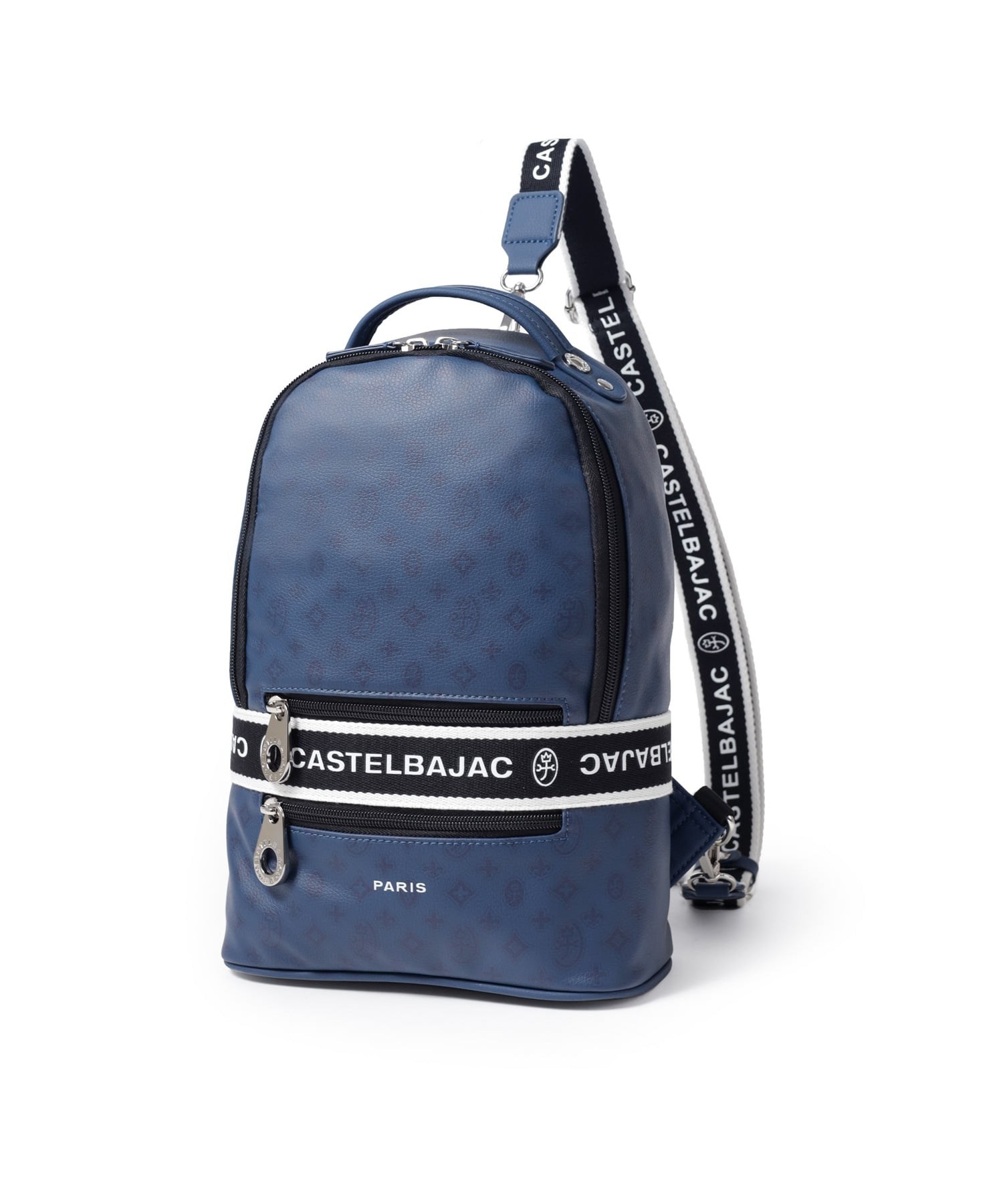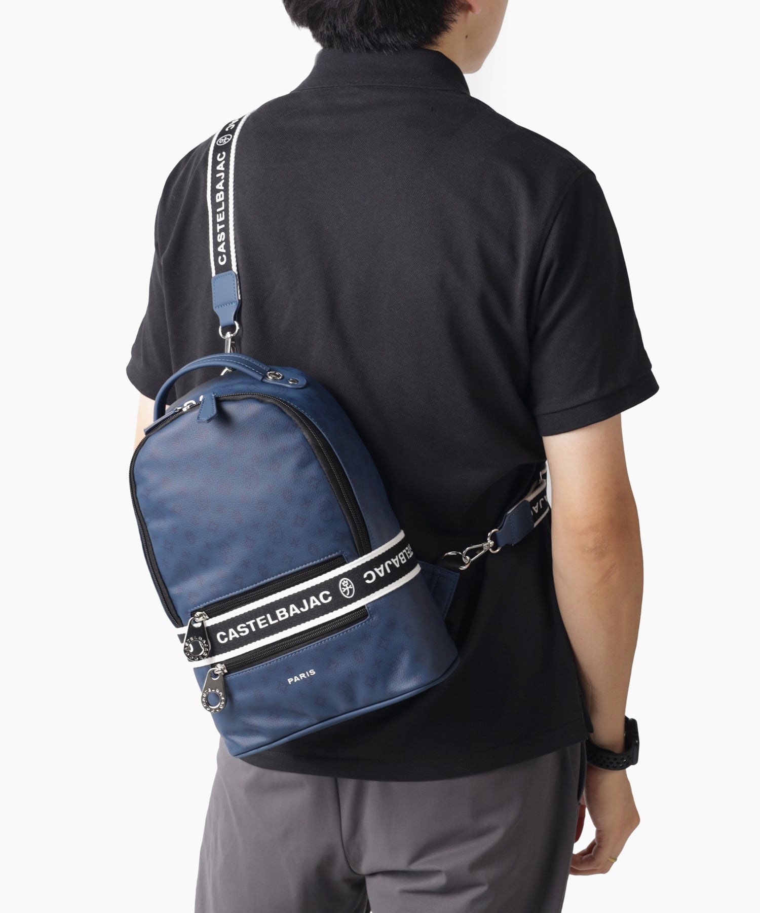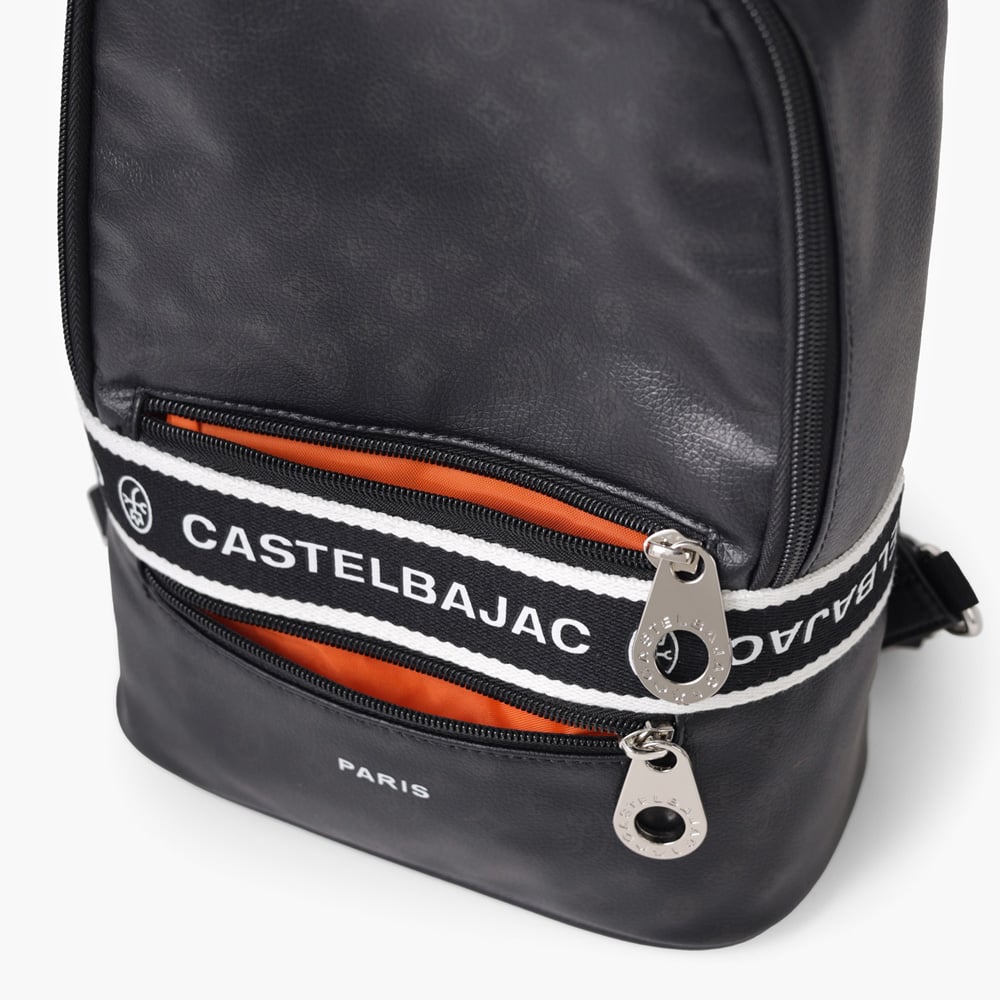 タウンからトラベルまで幅広く使える多機能なカステルバジャックのワンショルダーバッグ。取り外し可能なショルダーベルト2つが付属し、リュックスタイルでもお使いいただける2WAY仕様です。このバッグの素材には、プリントにWコーティングを施し、奥深く透明感のある生地に仕上げています。耐久性と美しさを兼ね備え、あらゆるシーンでスタイリッシュにお使いいただけます。