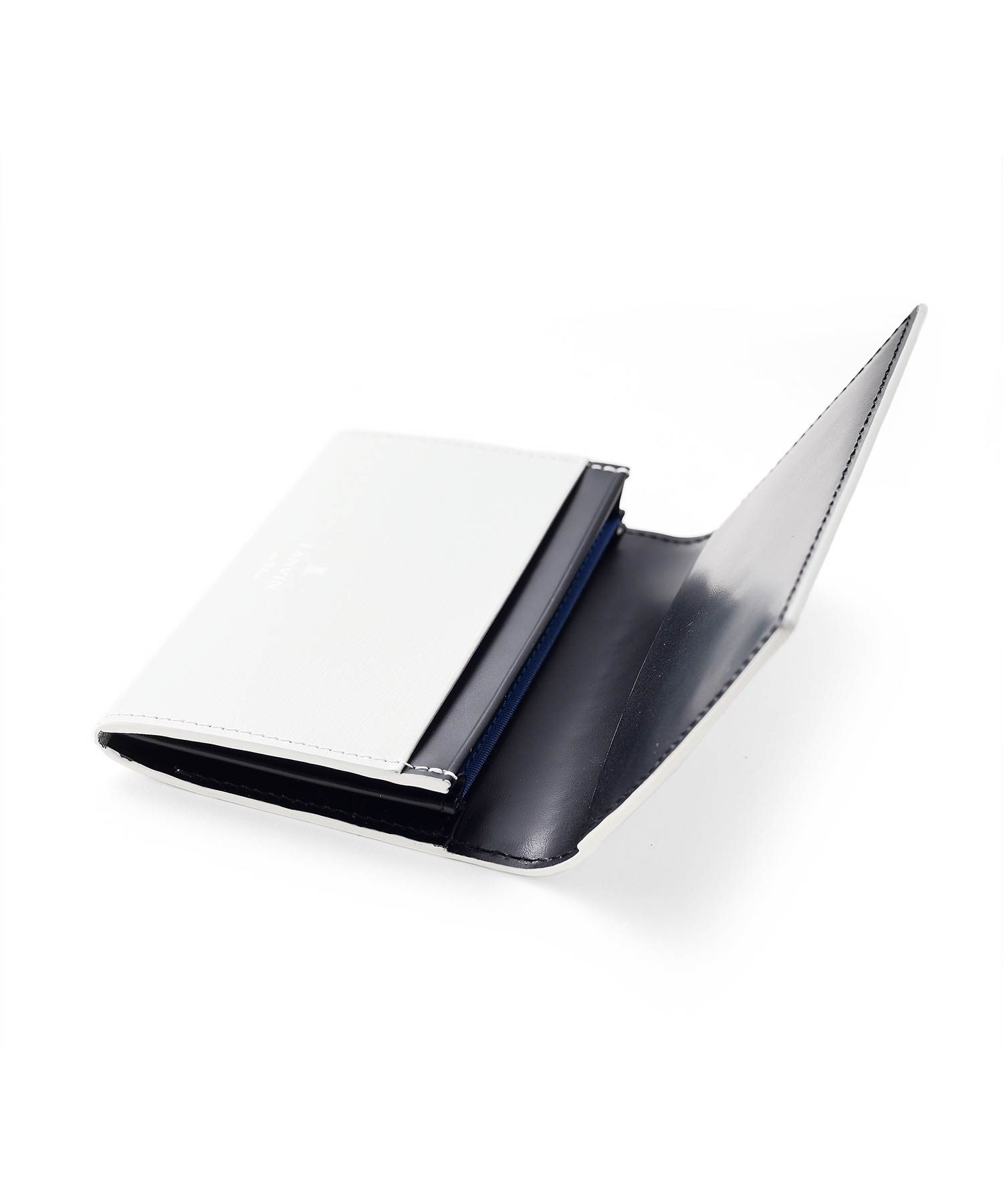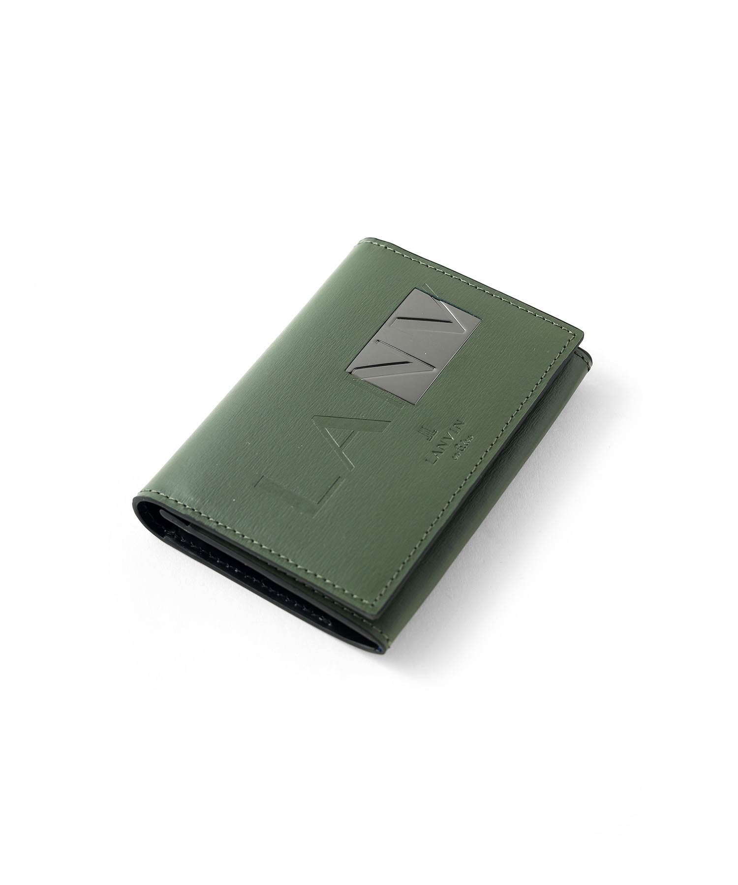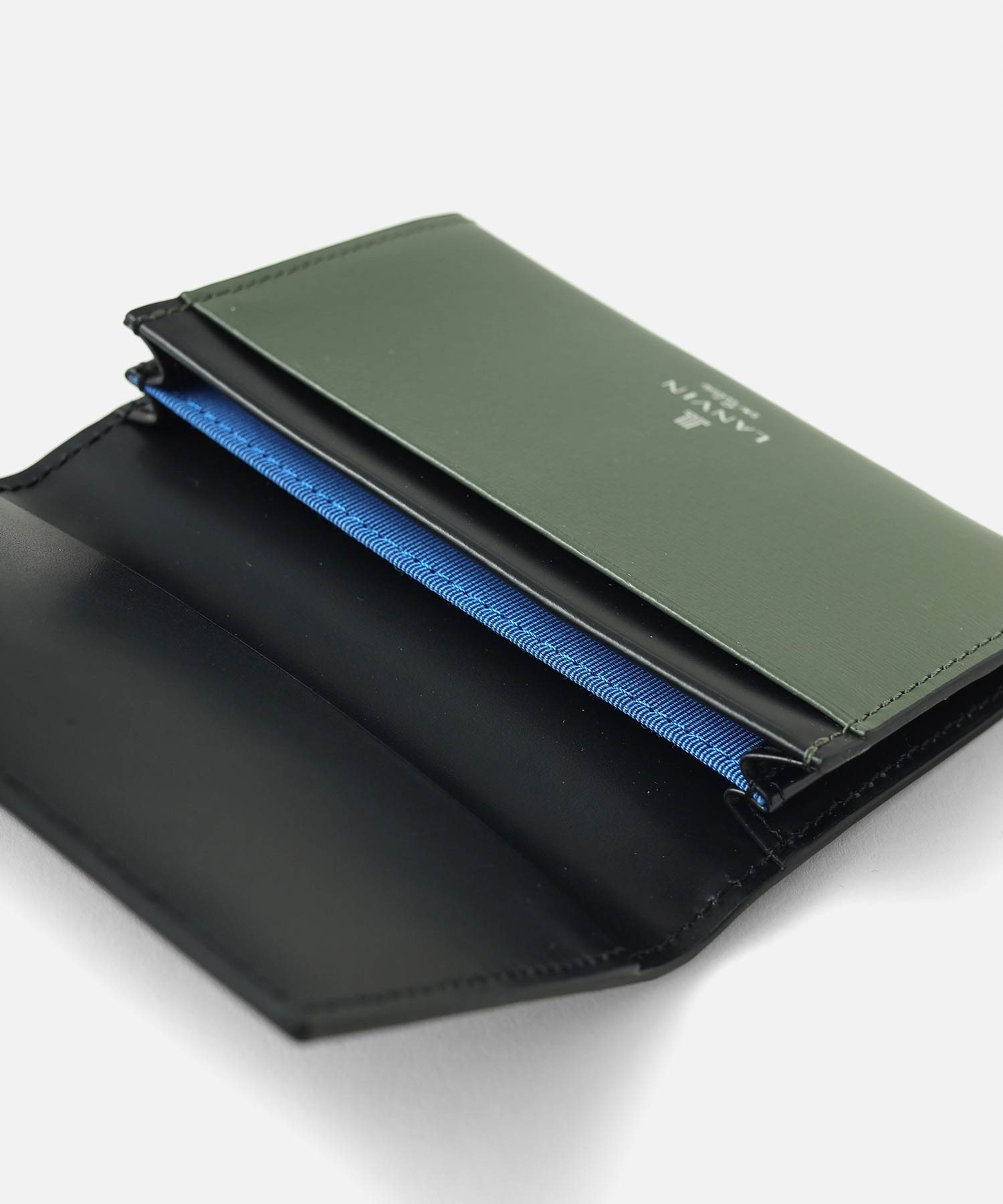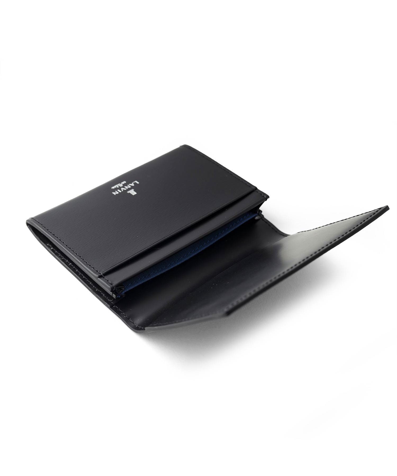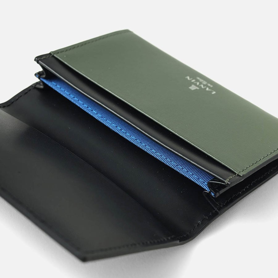 プレートと本体に押されたブランドロゴが繋がったように表現したモードなランバンオンブルーの名刺入れです。プレートをあえて大きめにすることで全体のワンポイントにもなり、シンプルベーシックな中にも上品さを演出してくれています。