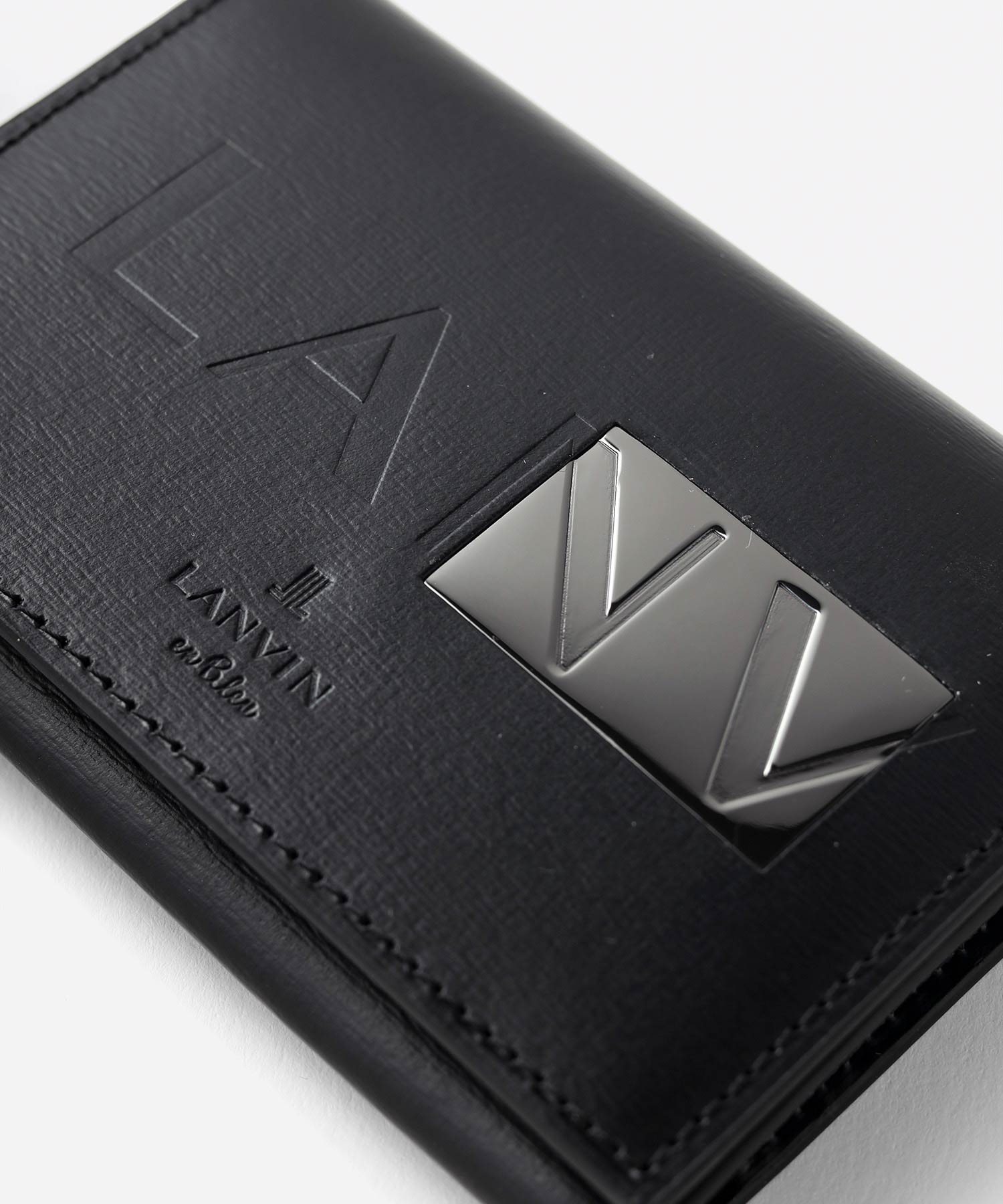 本体生地には細かい型押しが施されており、傷が付きにくい特性があります。また、デザインポイントであるプレートと、本体に押されたLANVIN en Bleuのロゴが繋がっているように表現したデザインです。