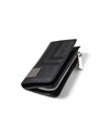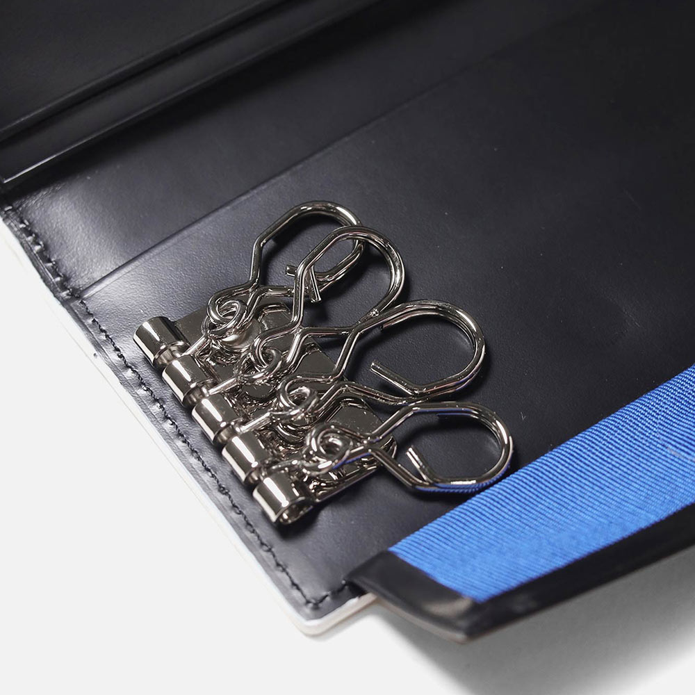 4連キーリングがついたキーケースです。キーリング部分にはかぶせがついており、キーケースを閉じた際に鍵が横から飛び出してこないよう設計されています。また、カードも入るポケットが3つあります。ファスナー小銭入れ付きで、これ一つでお出かけに対応した、マルチに活躍する革小物です。