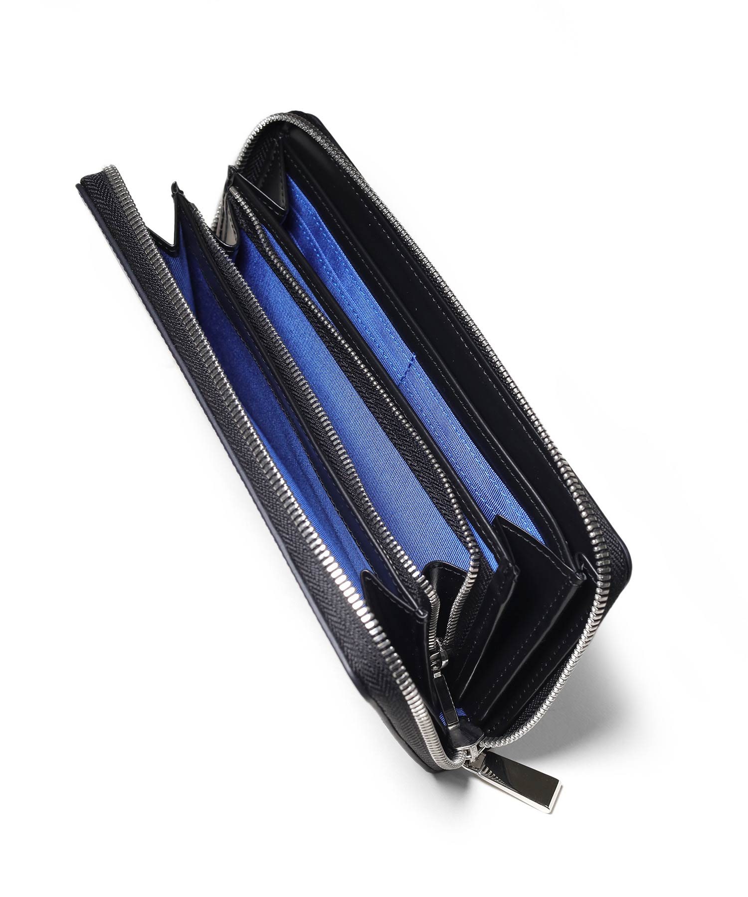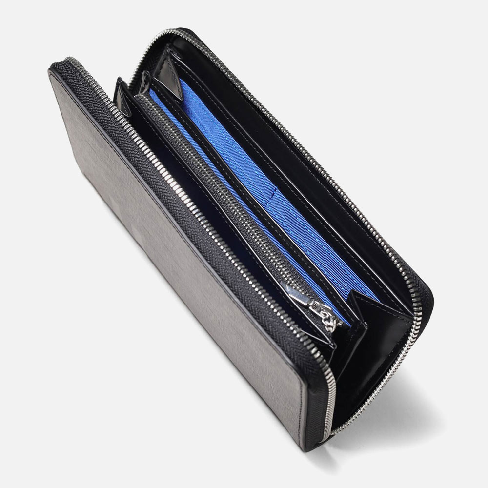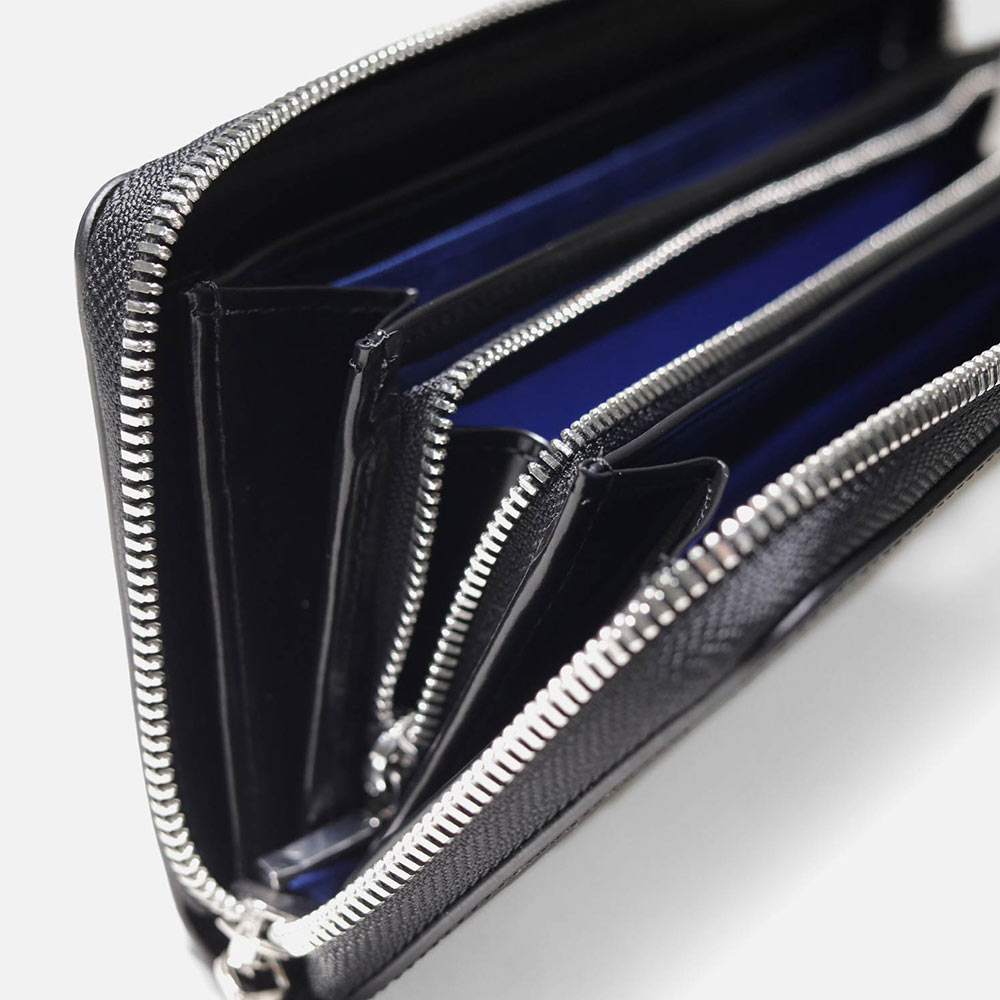 ラウンドファスナータイプの長財布を開くと、札入れが2つ、小銭入れ、カード段が12、ポケット大が2つあります。小銭入れはL字ファスナー式で中身の確認がしやすく、硬貨の出し入れも容易です。