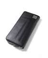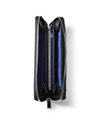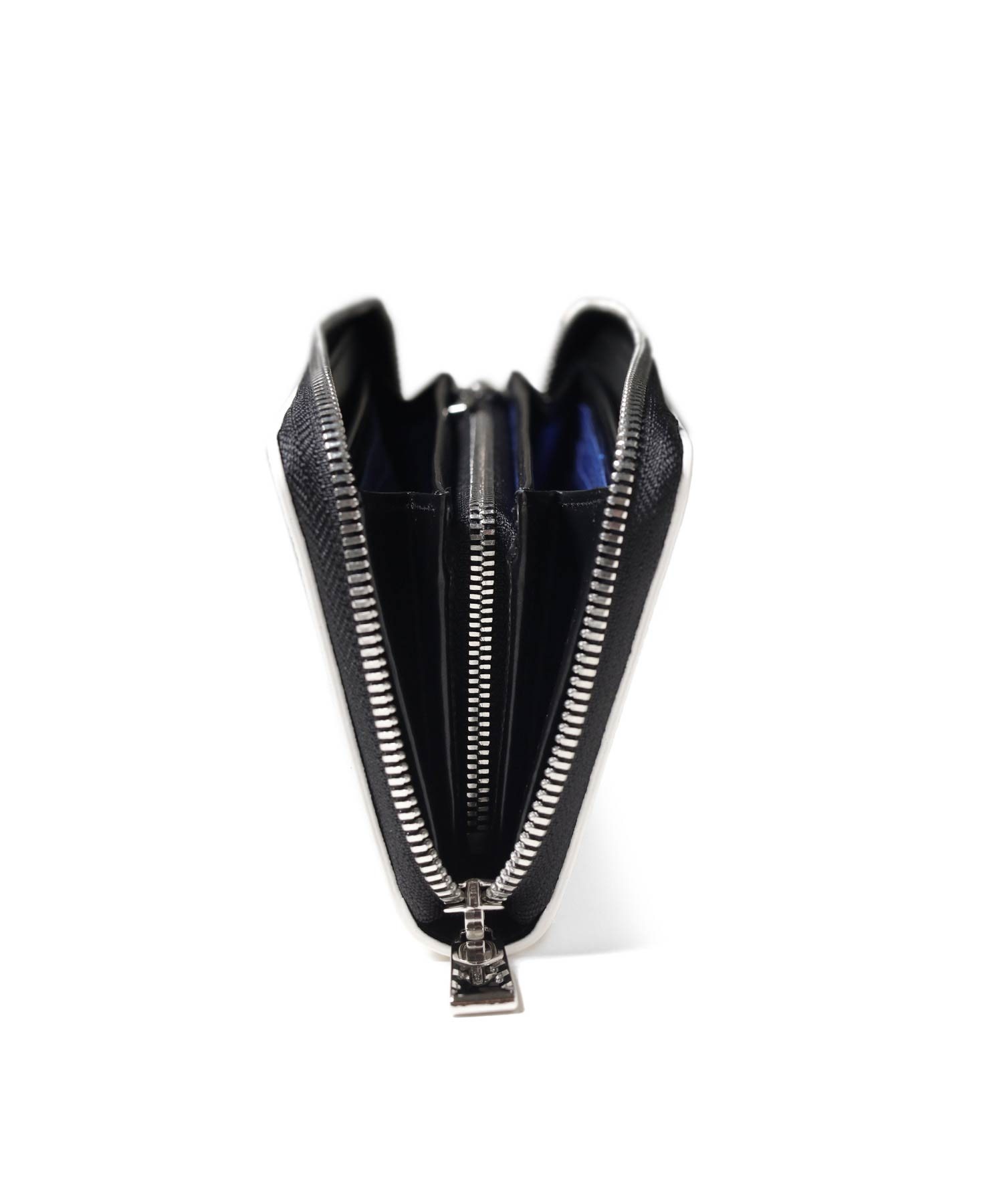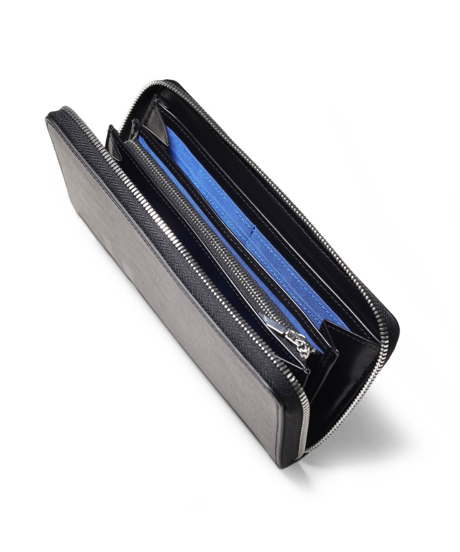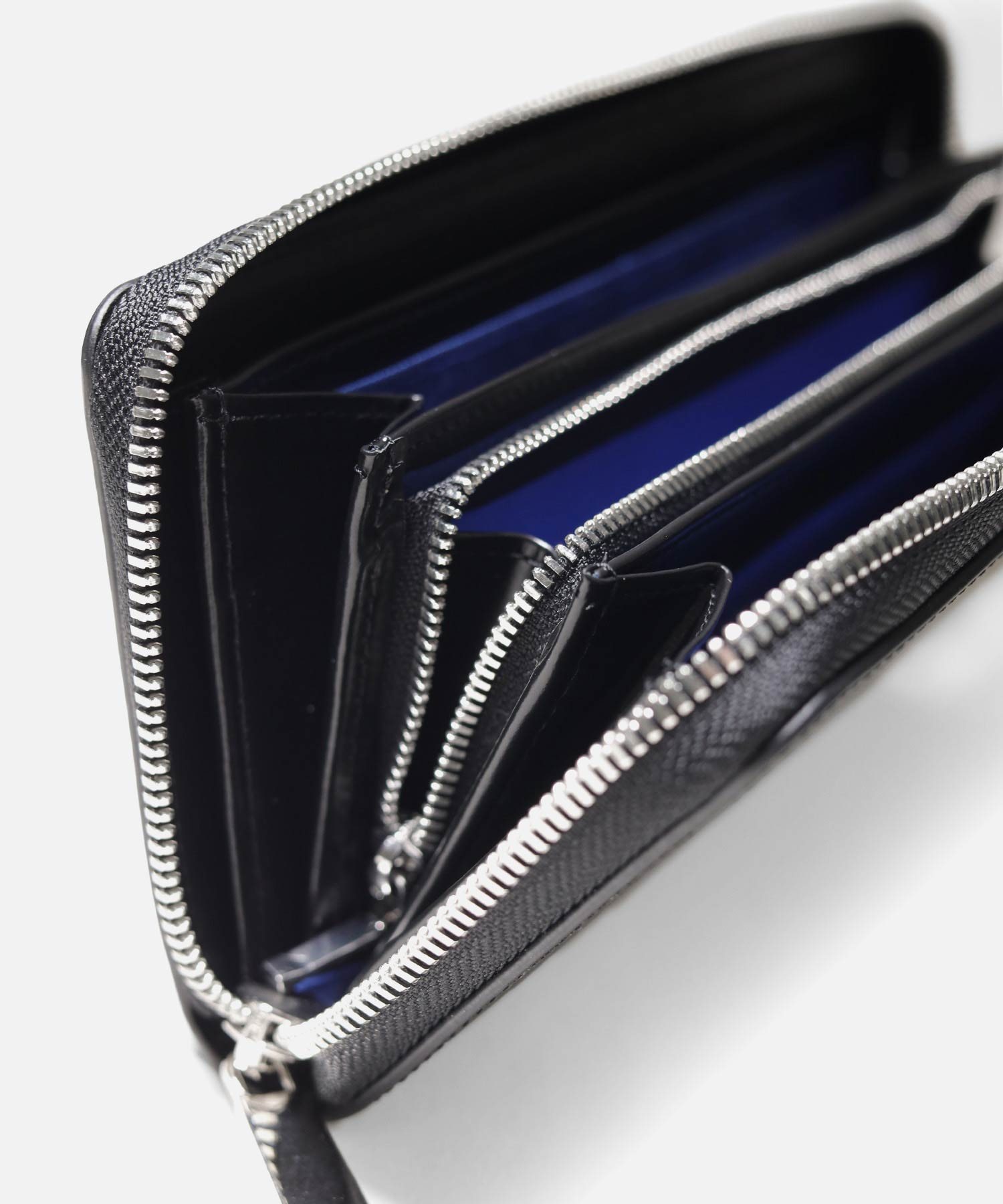 ラウンドファスナータイプの長財布を開くと、札入れが2つ、小銭入れ、カード段が12、ポケット大が2つあります。小銭入れはL字ファスナー式で中身の確認がしやすく、硬貨の出し入れも容易です。