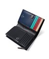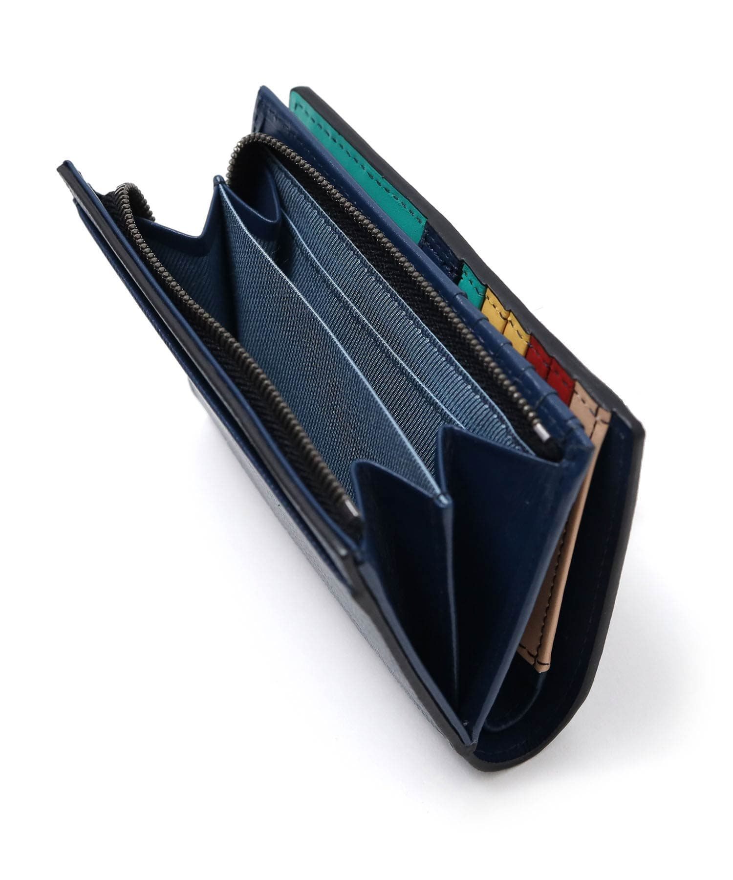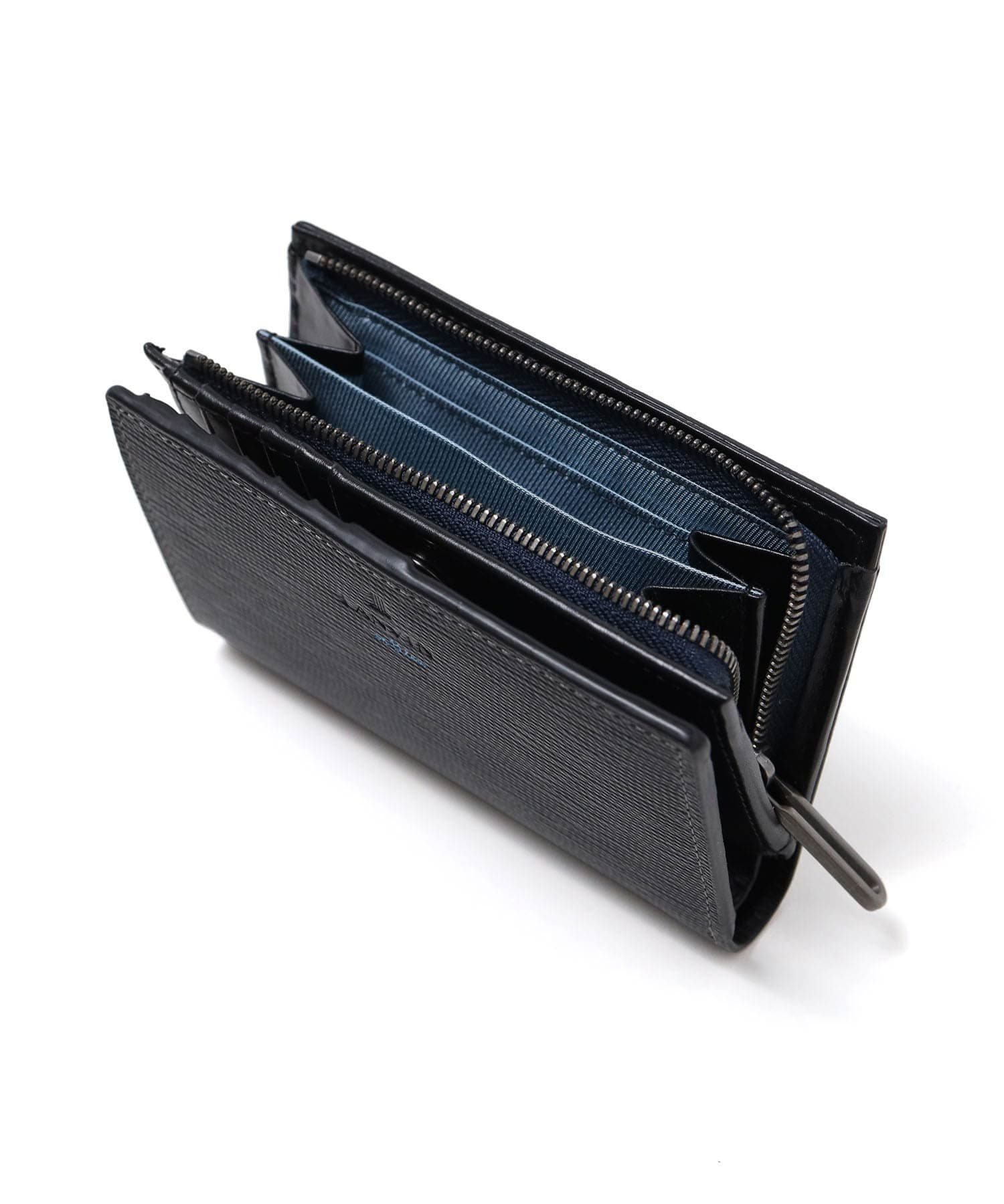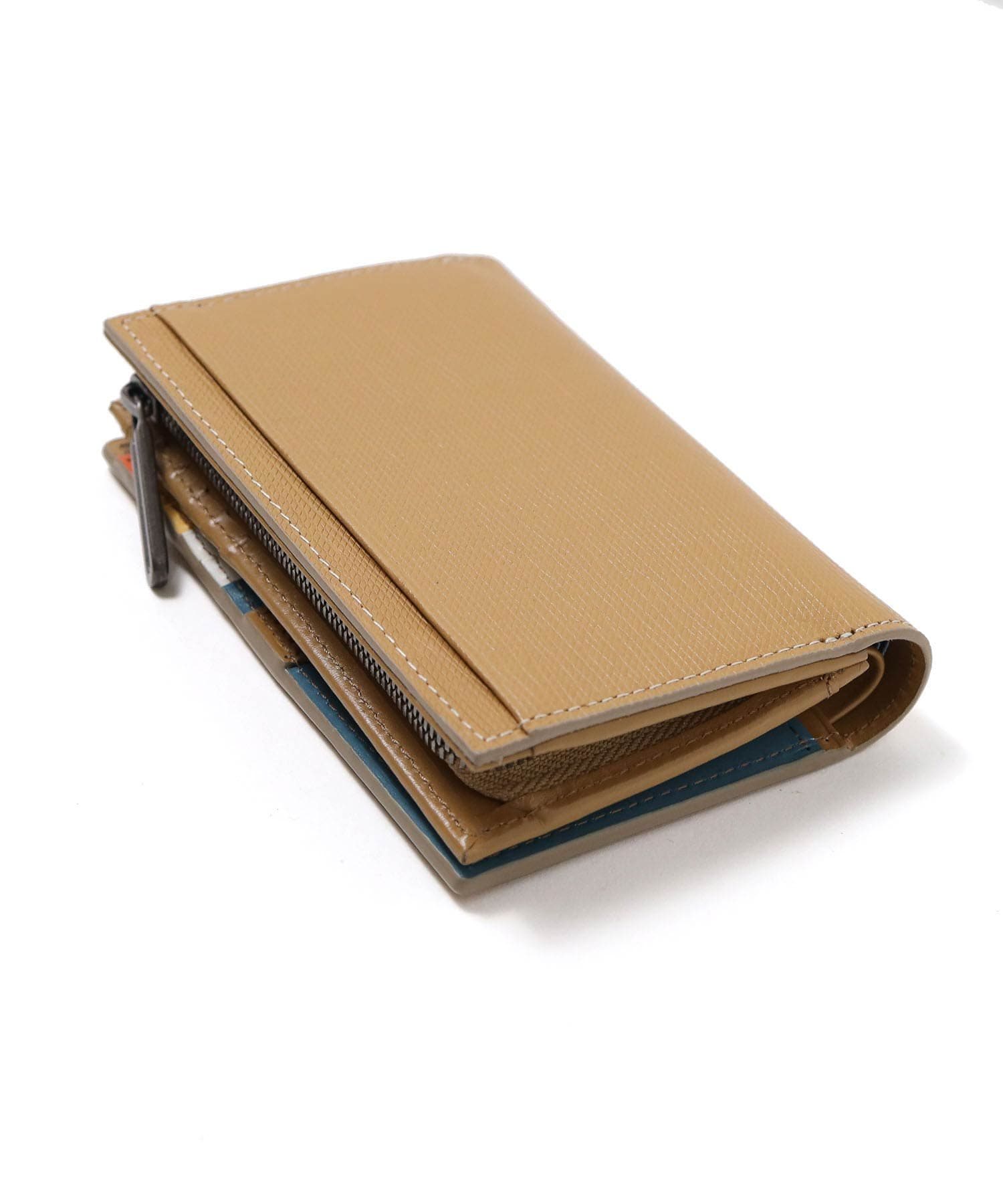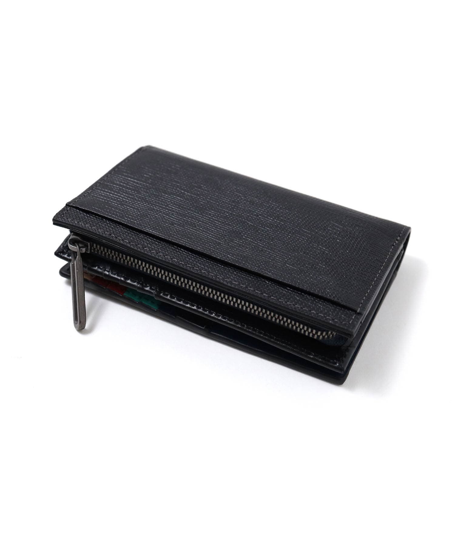 シンプルな見た目とカラフルな内装のギャップが魅力の折り財布です。本体素材には水シボエンボスレザーを使用しています。海面・波を連想する水が流れているような美しいシワが魅力で、一般的な水エンボスとは違い、変則的なエンボスでインポートらしい個性的な表情に仕上げました。