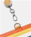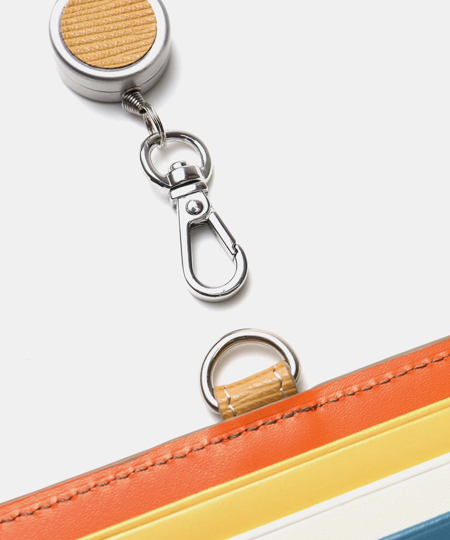 窓付きカードポケット側に海面や波を連想させる水シボエンボスレザーを使用した、ランバンオンブルーらしいシンプルなリール付きIDカードホルダー。しかしそんな見た目とは裏腹に、カード段には大胆な色使いがなされており、シンプルさと大胆さのギャップをお楽しみいただけます。