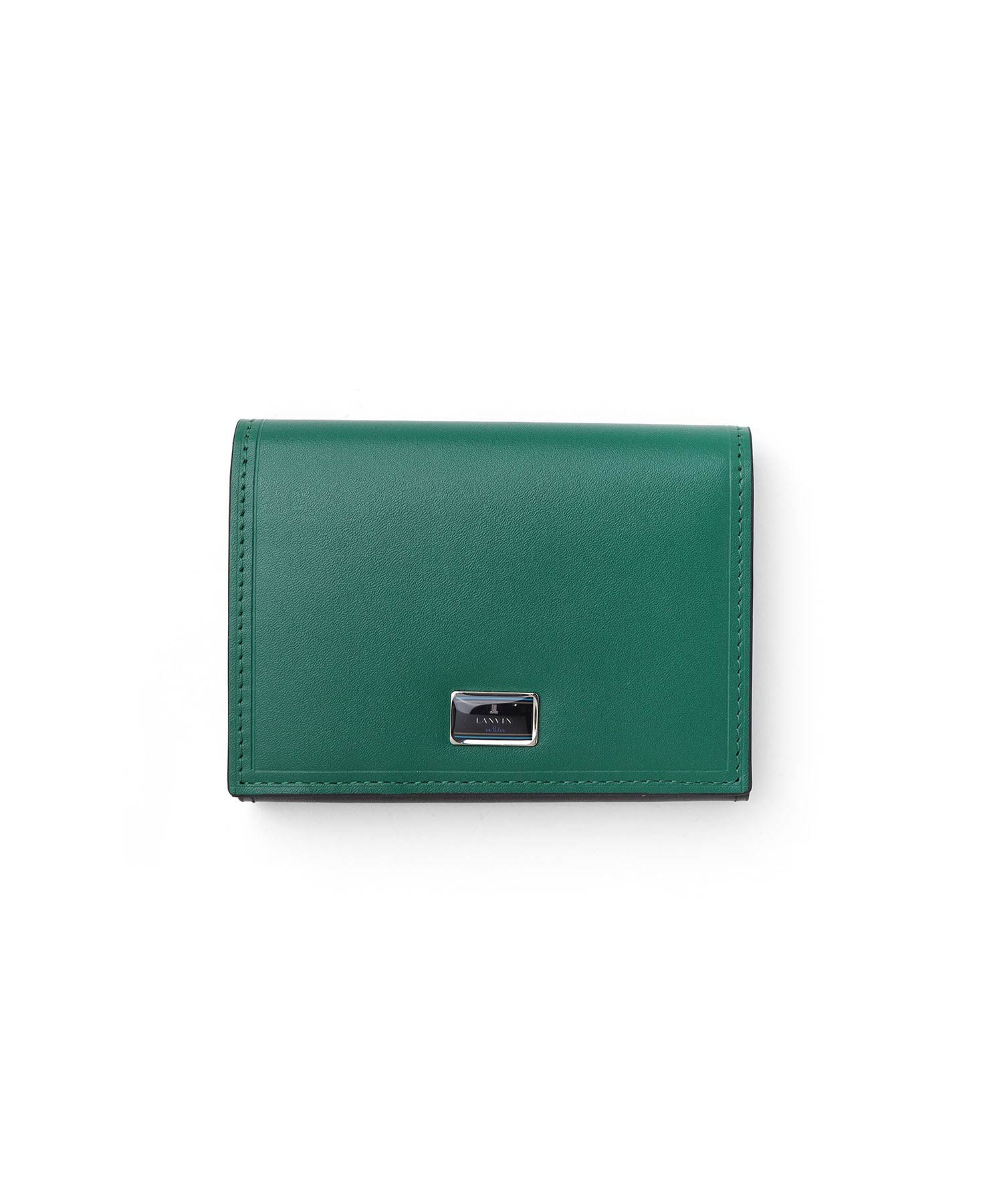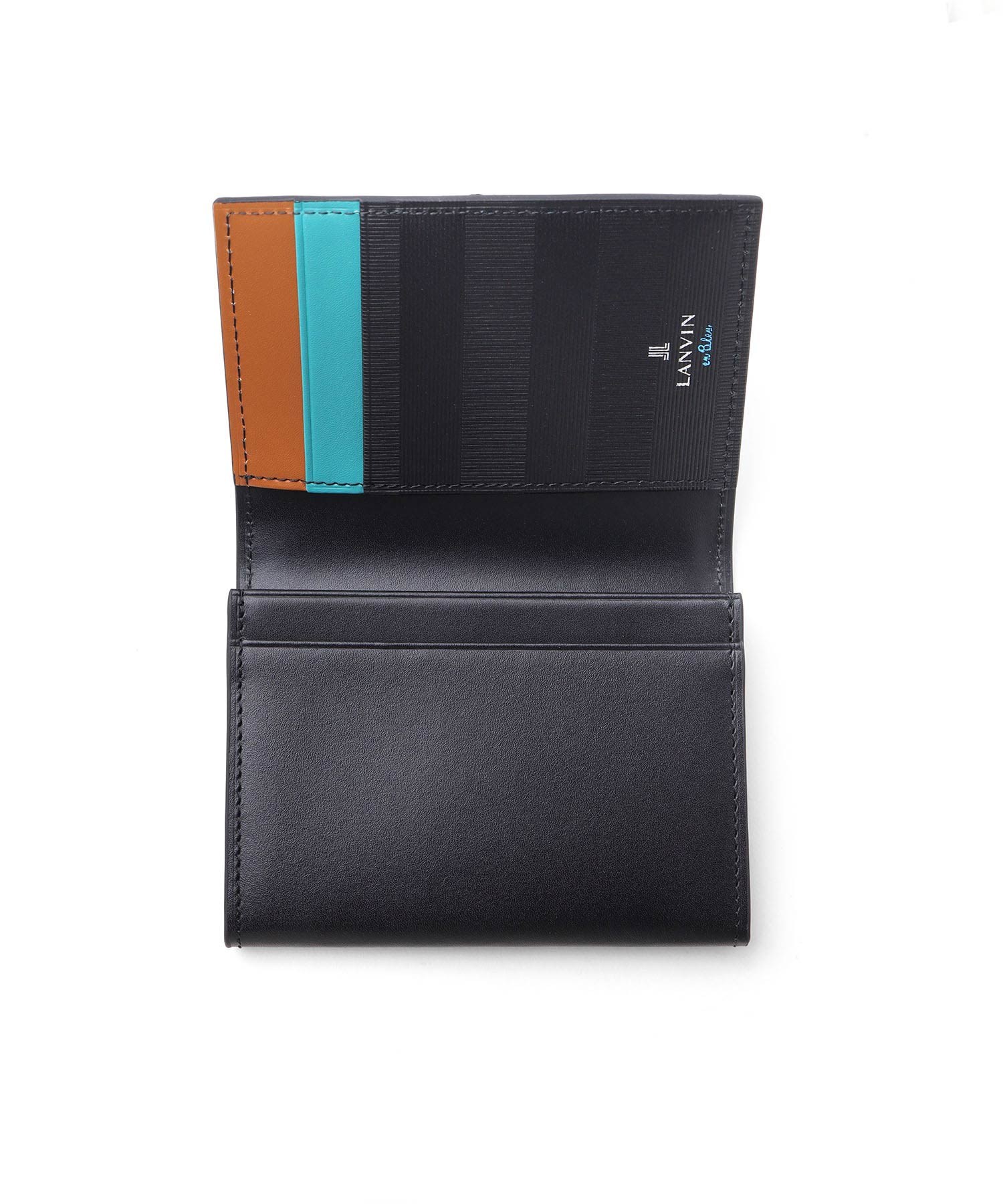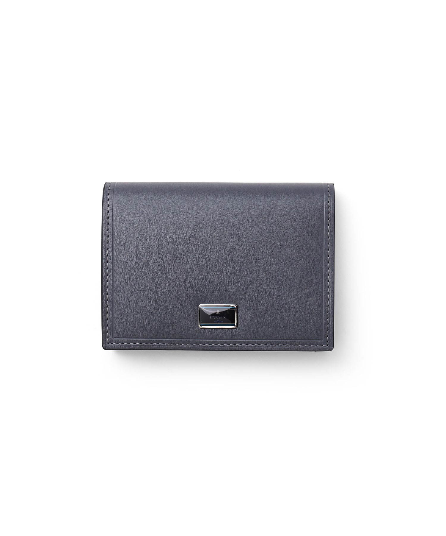 上品な光沢感のあるスムース牛革と、プリントエボブローチが印象的なLANVIN en Bleuの名刺入れ。内側のカラーのカード段やオリジナルボーダーエンボスなど、遊び心あるデザインの革小物です。
