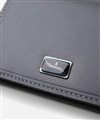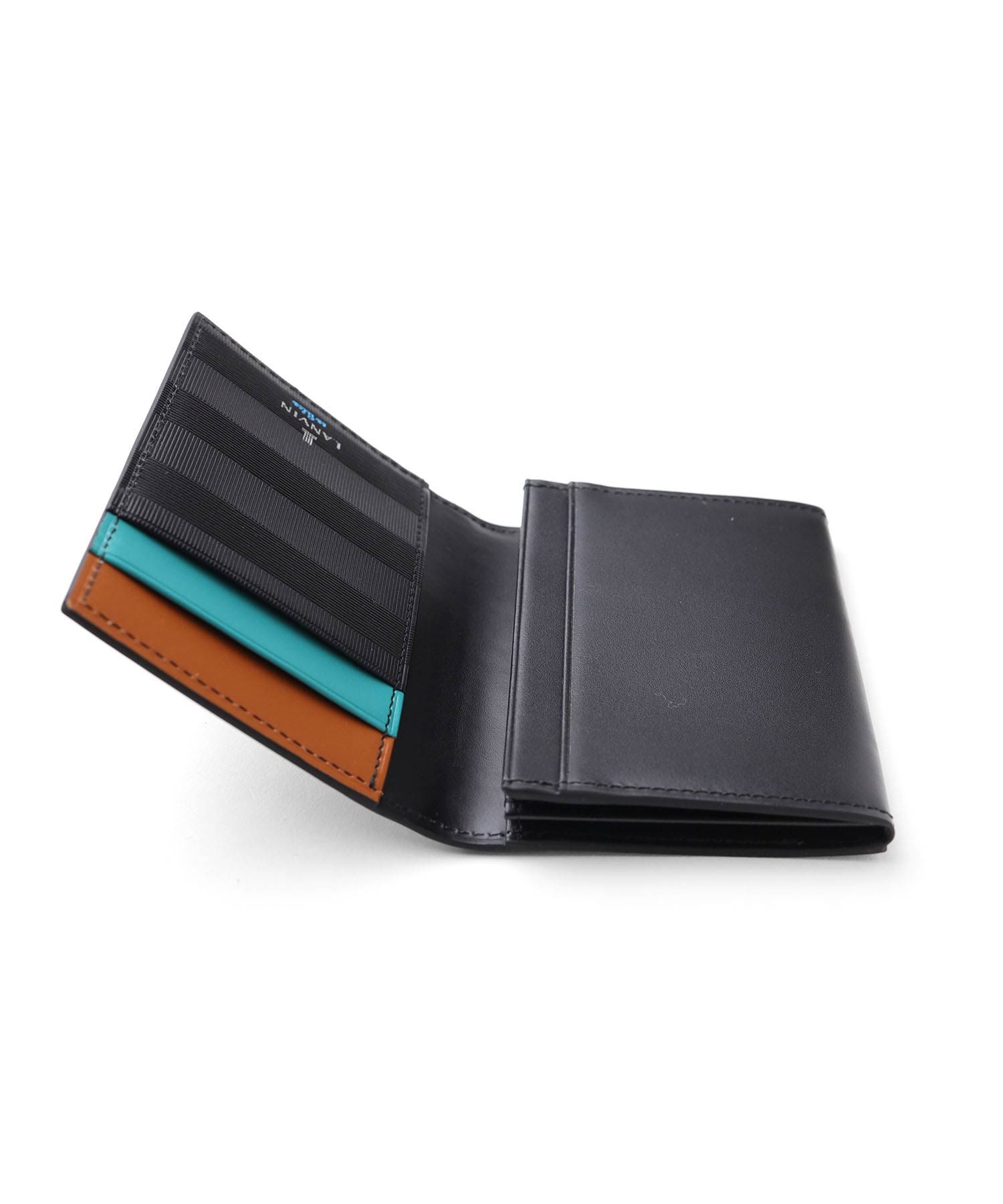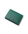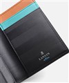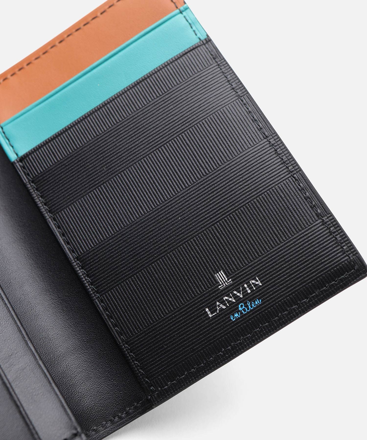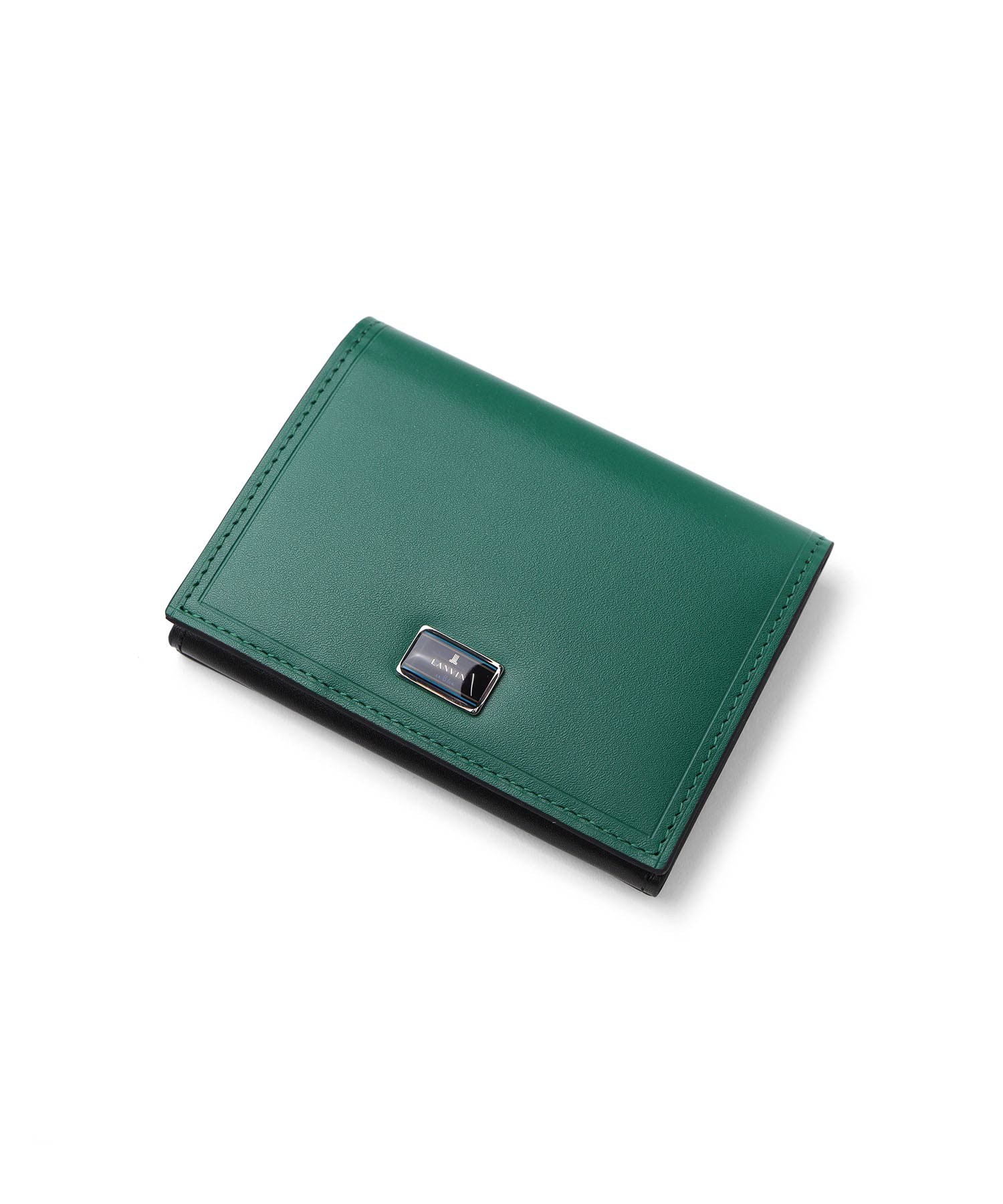 上品な光沢感のあるスムース牛革と、プリントエボブローチが印象的なLANVIN en Bleuの名刺入れ。内側のカラーのカード段やオリジナルボーダーエンボスなど、遊び心あるデザインの革小物です。