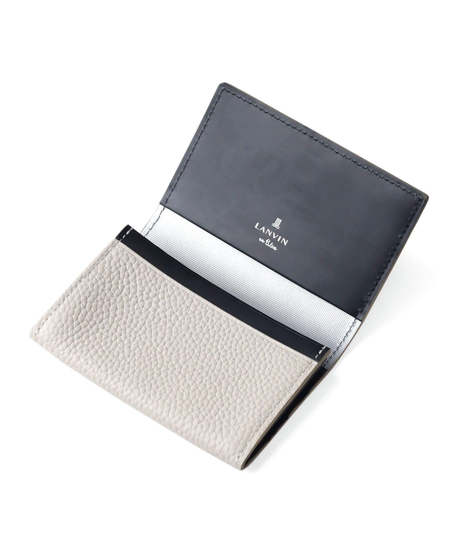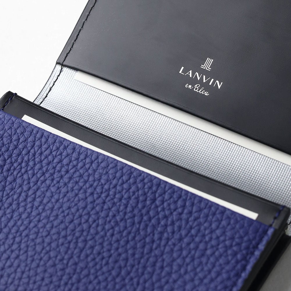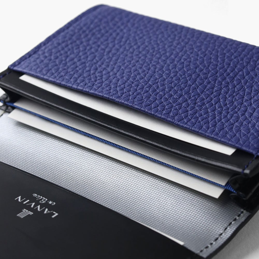 柔らかく上質な手触りが魅力のランバンオンブルーの名刺入れ。シュリンク加工を施したソフトな風合いの牛革を使用しており、傷が目立ちにくく、長く美しい状態を保てます。シンプルで無駄のないデザインに、シルバーのメタルロゴが上品なアクセントを添えています。