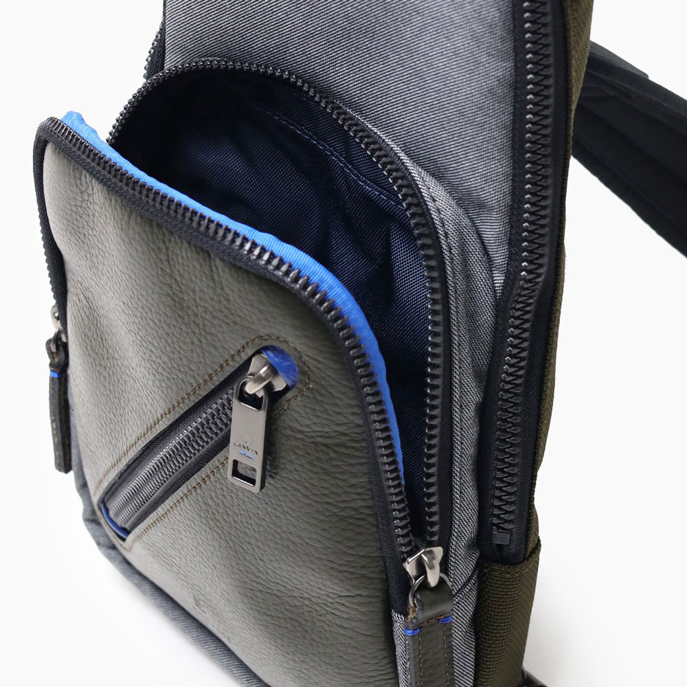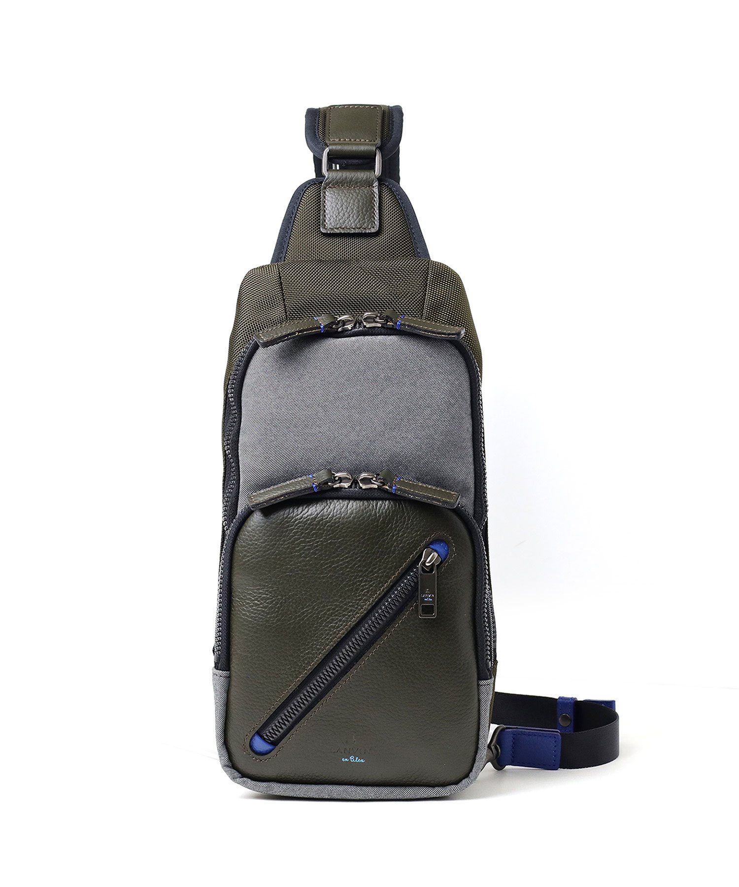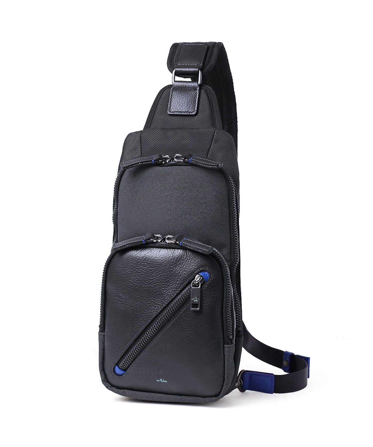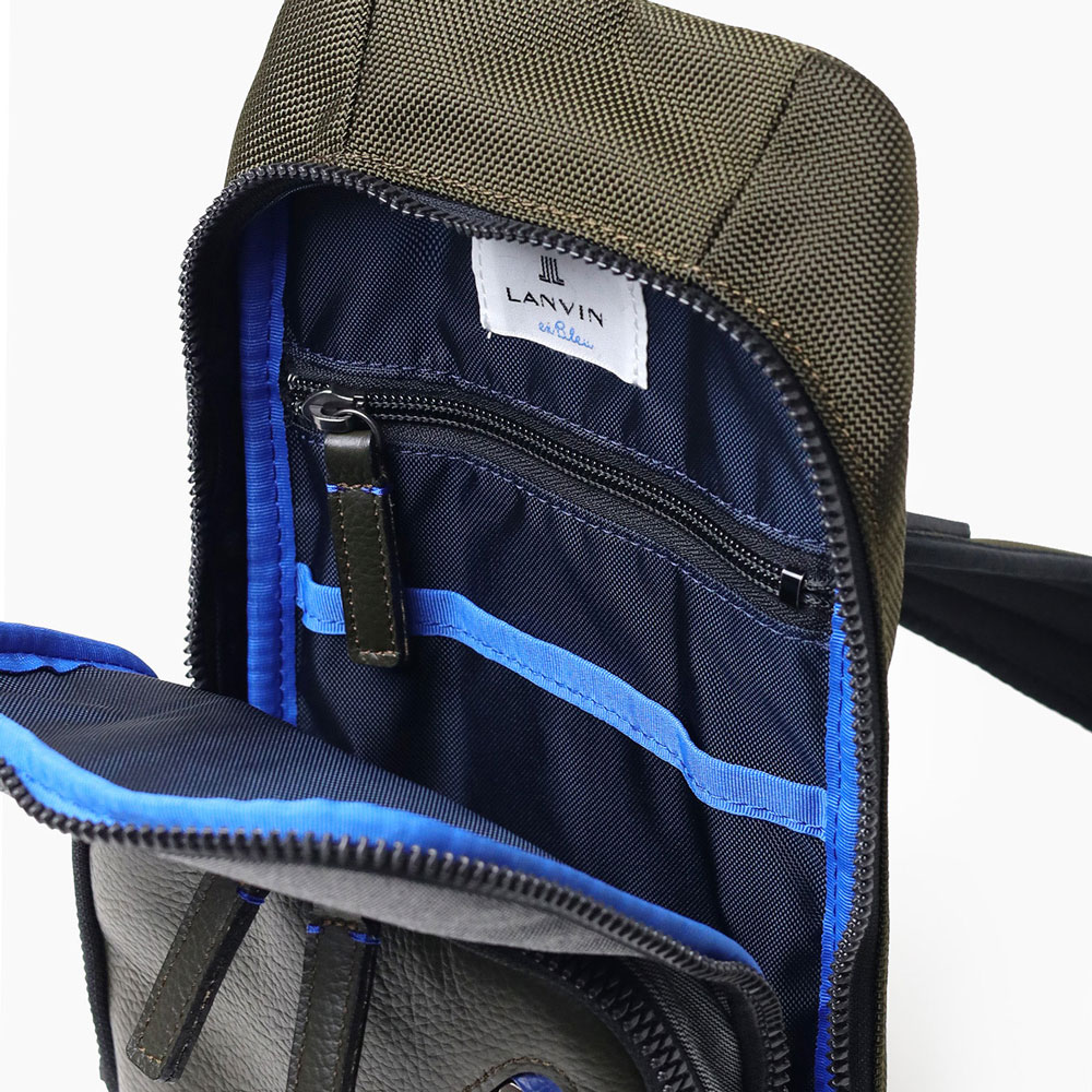高機能マテリアルのラナテックという濃淡のある杢調のポリエステル素材とレザーの異素材ミックスが特徴の、ランバンオンブルーのカジュアルワンショルダーバッグ。耐久性に優れた素材と抜群の収納力で、デイリーユースにぴったりです。