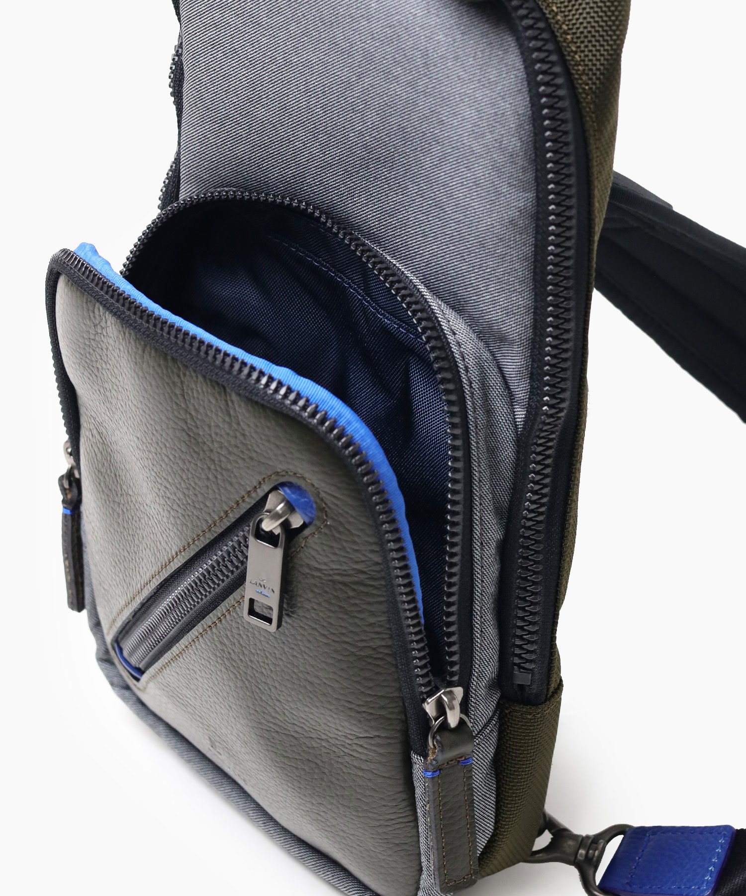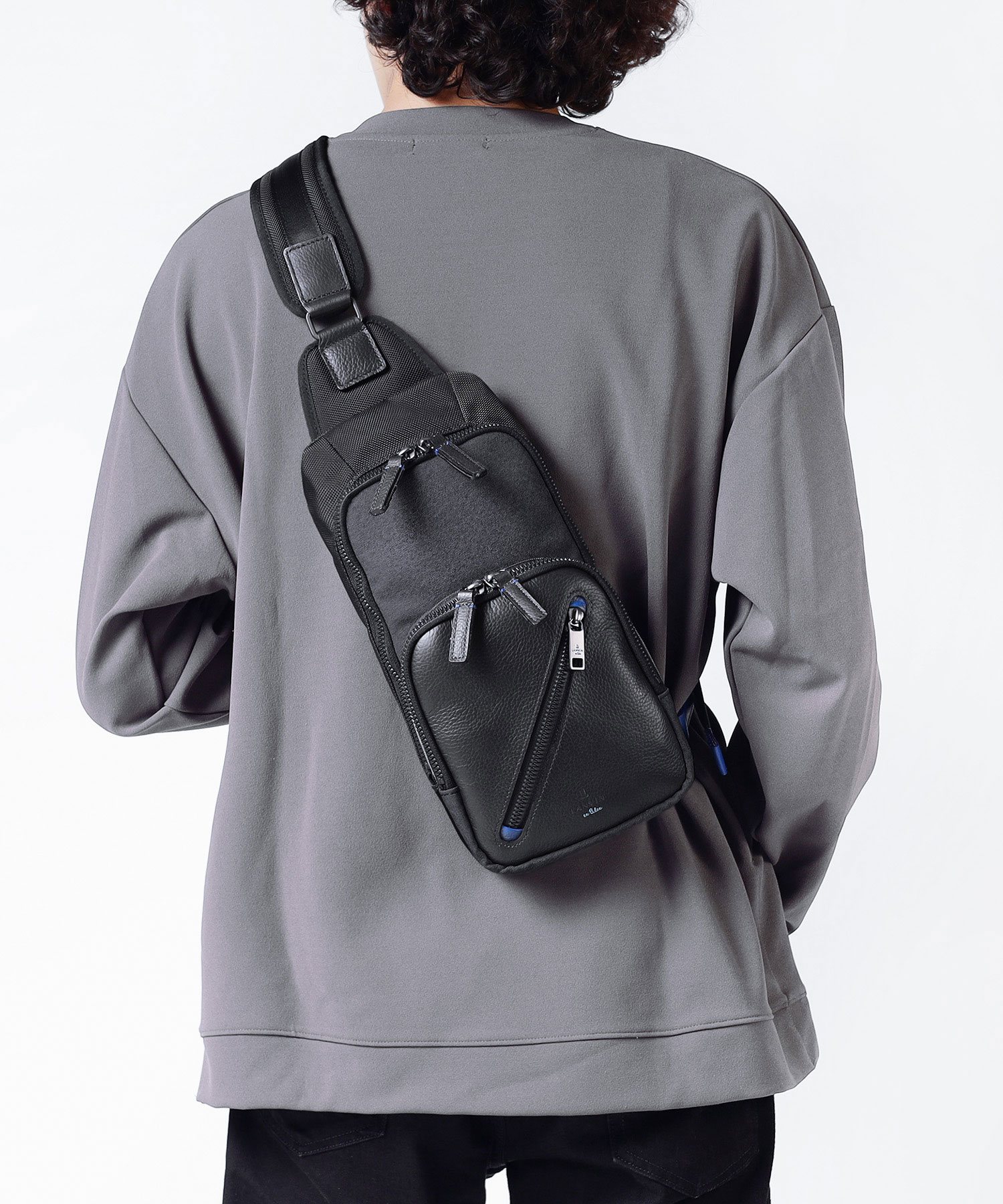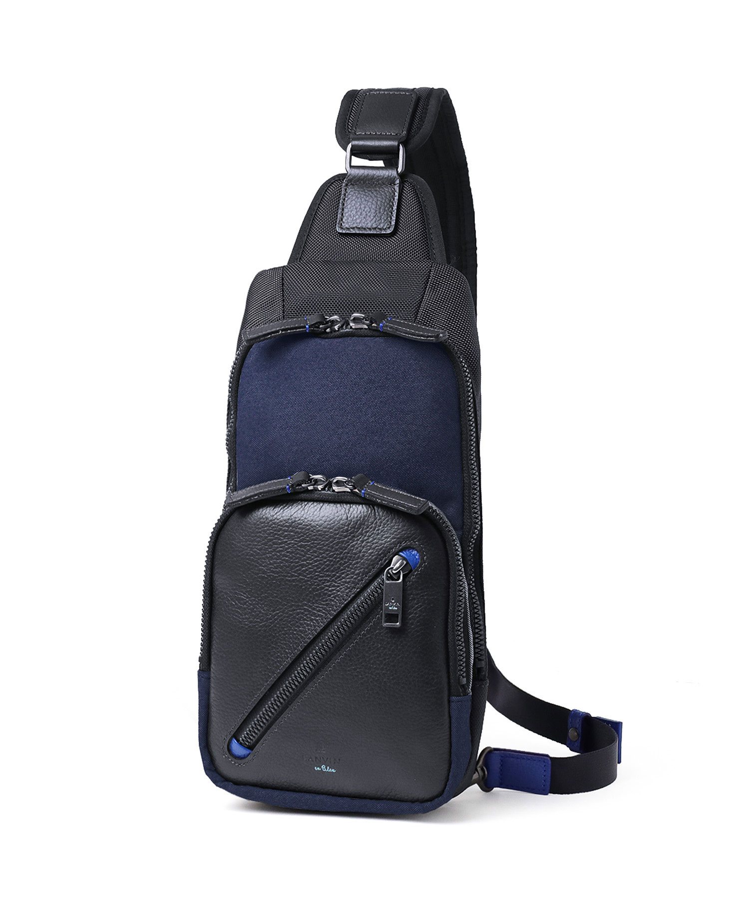 高機能マテリアルのラナテックという濃淡のある杢調のポリエステル素材とレザーの異素材ミックスが特徴の、ランバンオンブルーのカジュアルワンショルダーバッグ。耐久性に優れた素材と抜群の収納力で、デイリーユースにぴったりです。