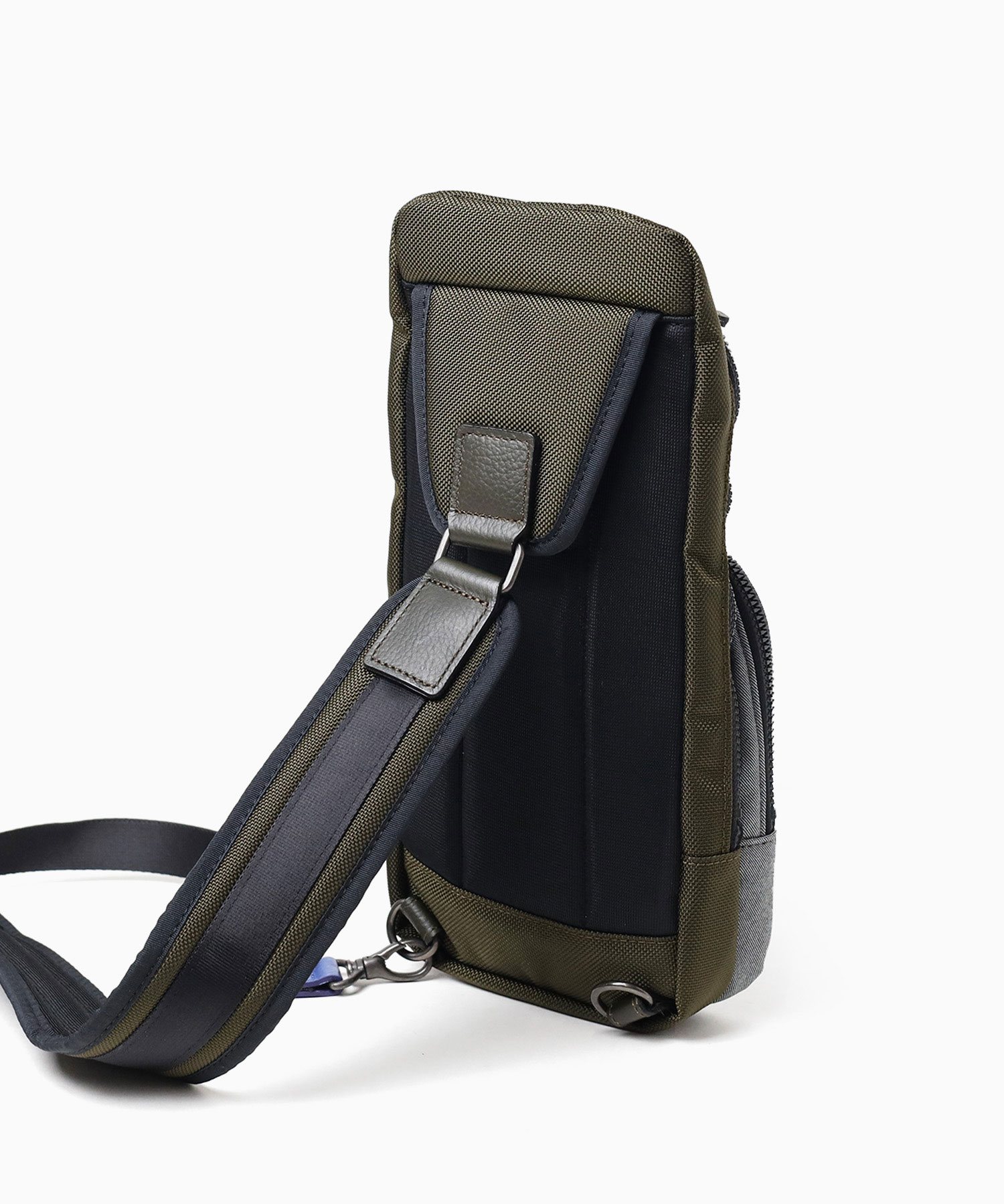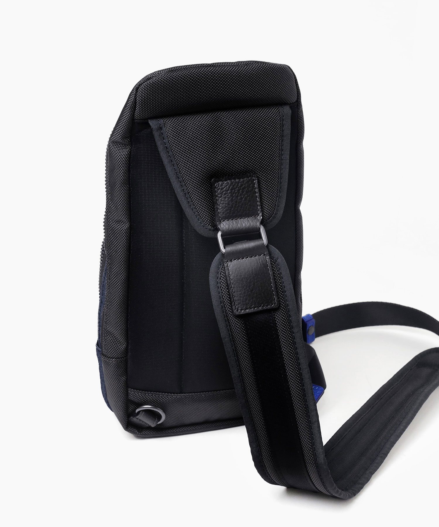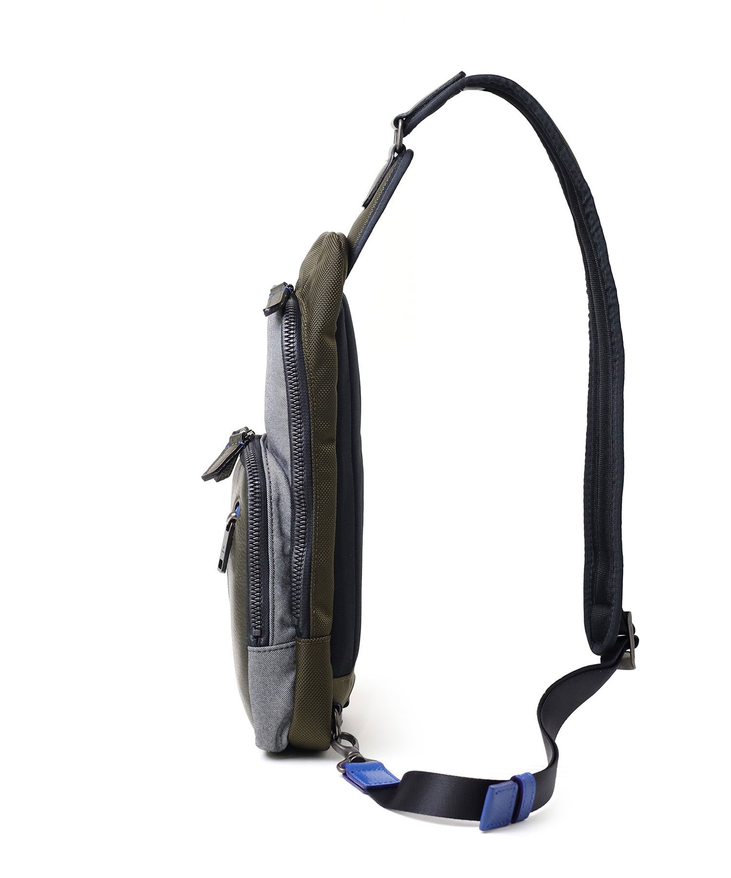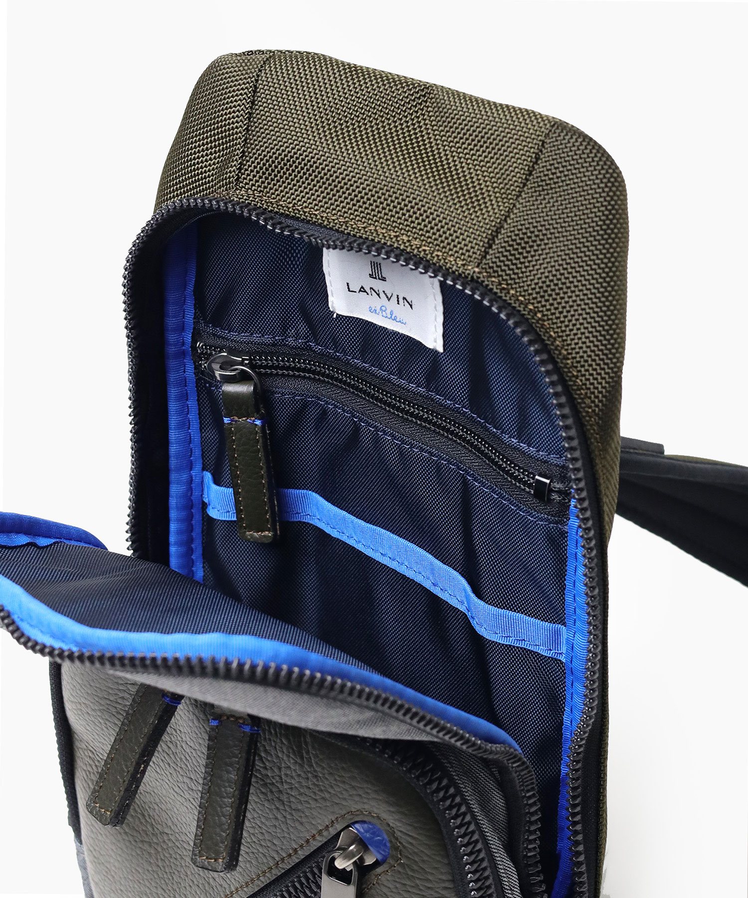 高機能マテリアルのラナテックという濃淡のある杢調のポリエステル素材とレザーの異素材ミックスが特徴の、ランバンオンブルーのカジュアルワンショルダーバッグ。耐久性に優れた素材と抜群の収納力で、デイリーユースにぴったりです。