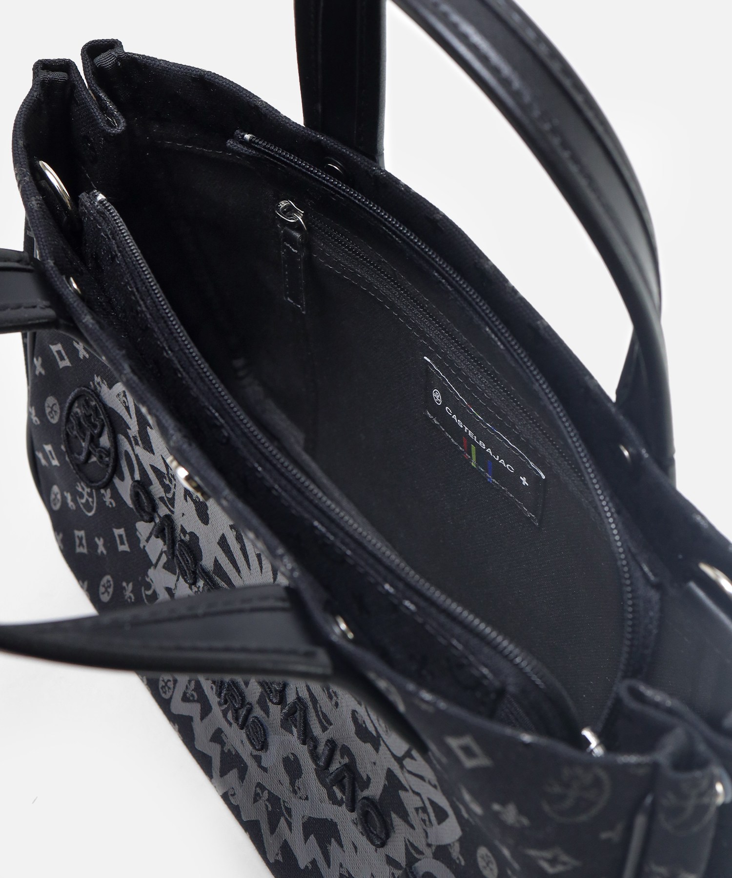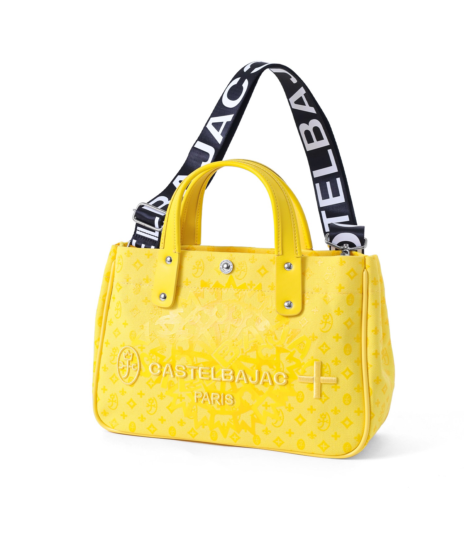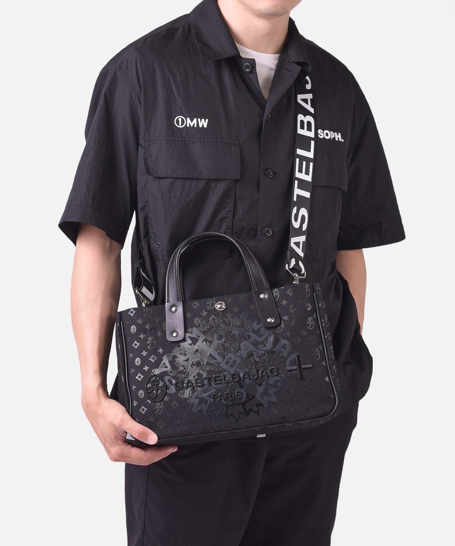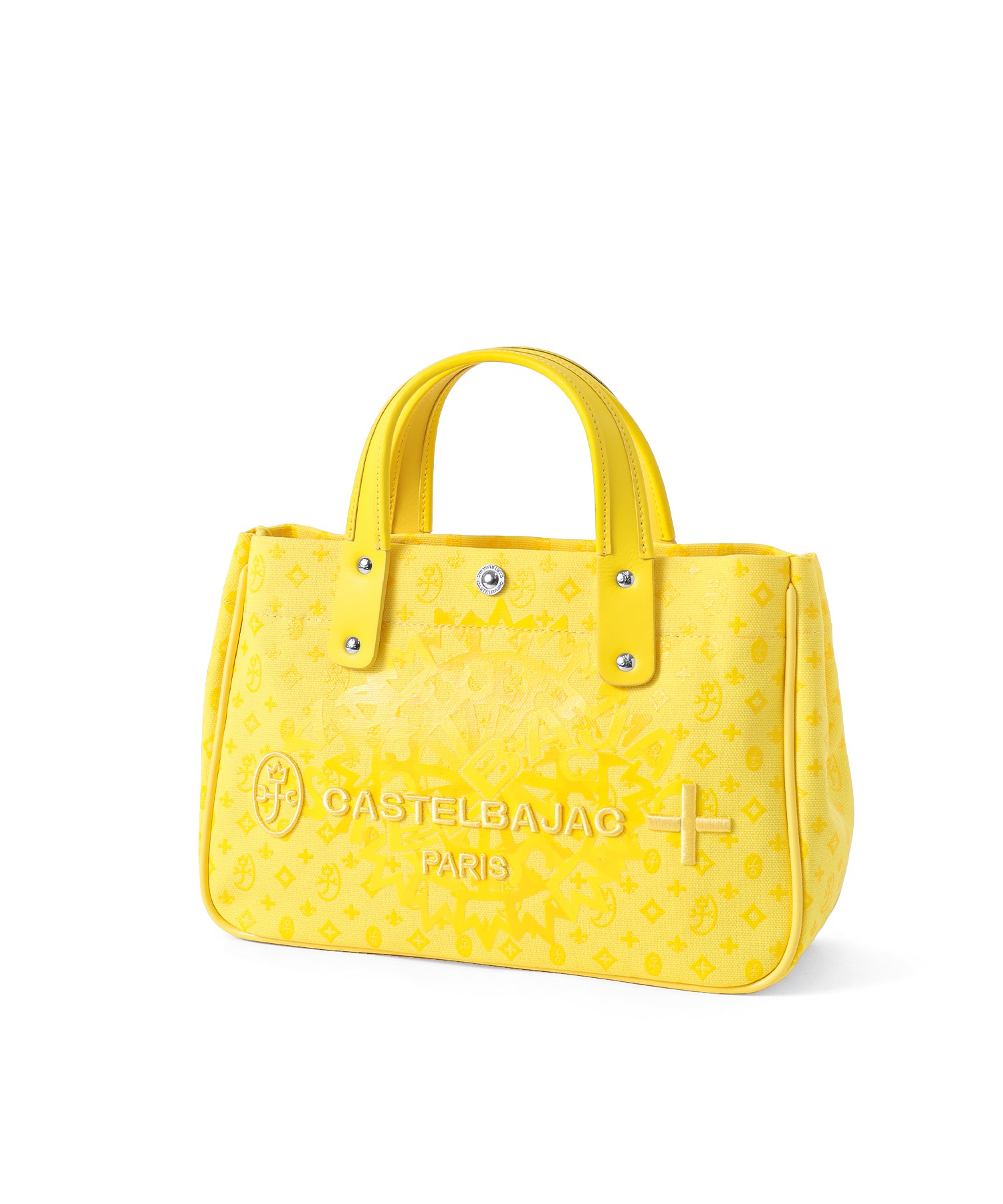 カステルバジャックの8号帆布を使用したB5サイズのドライビングトートバッグ。本体はブランドの定番であるモノグラムと正面に大胆にデザインしたブランドロゴをプリントした遊び心溢れるデザインです。